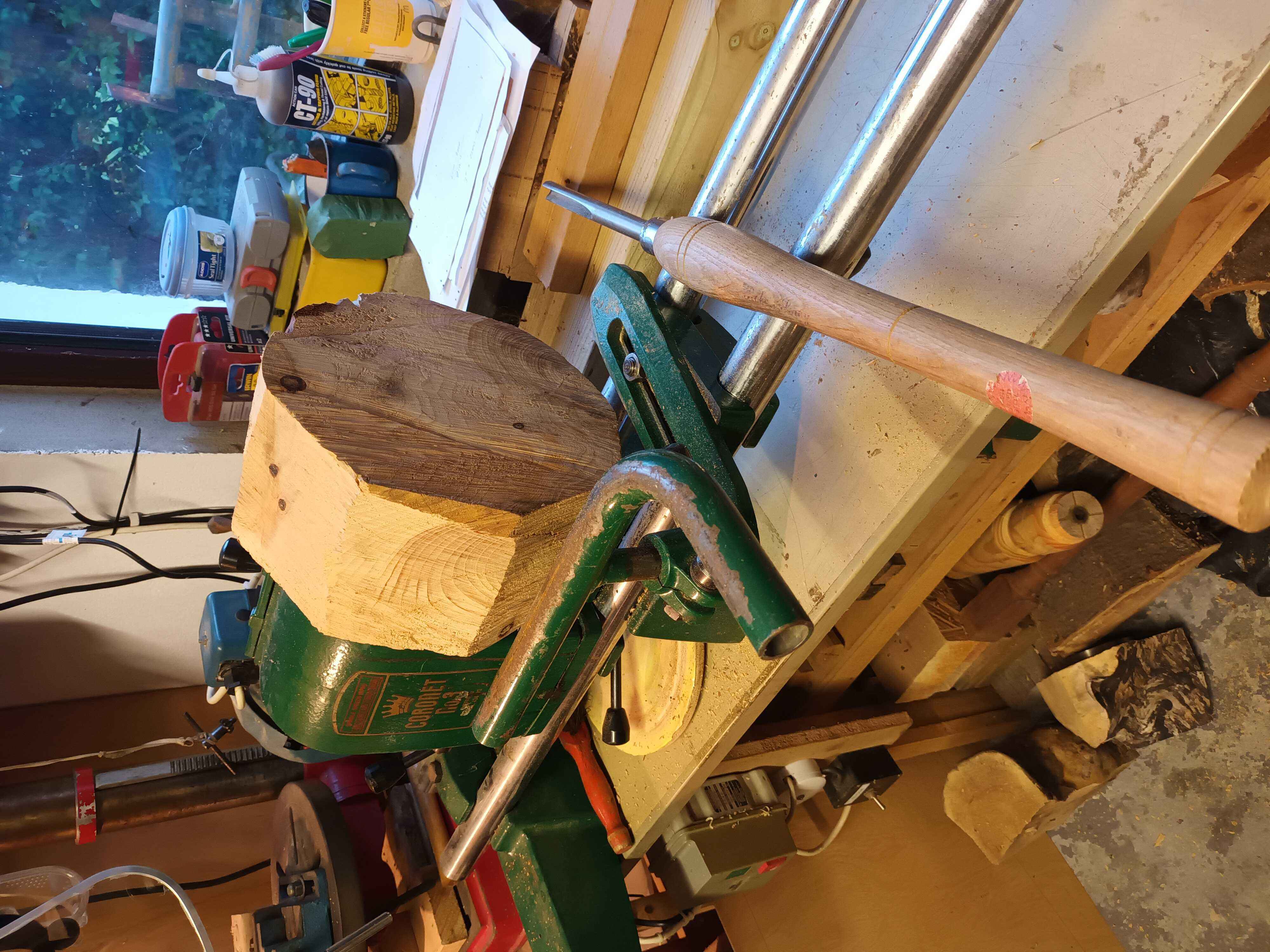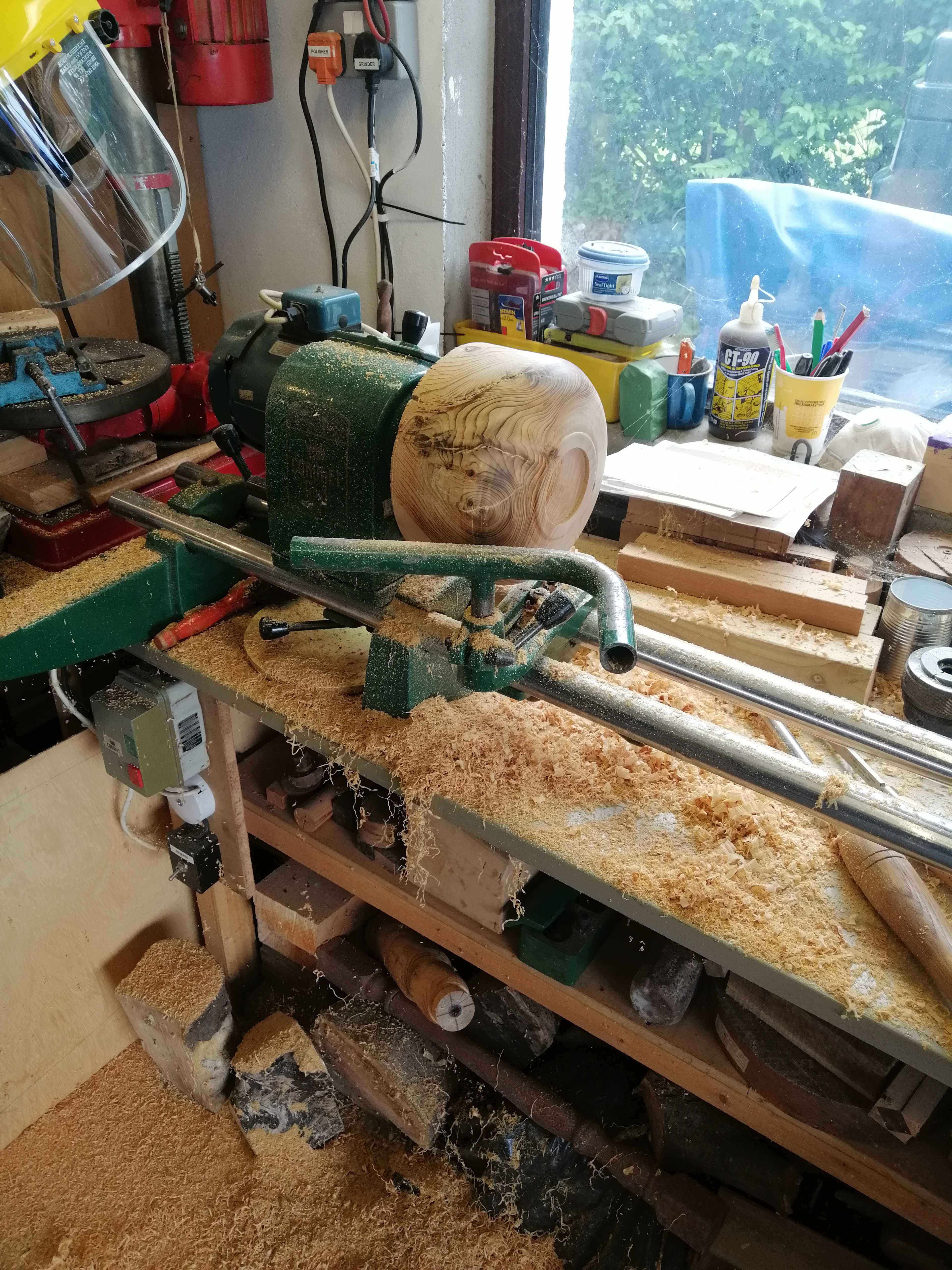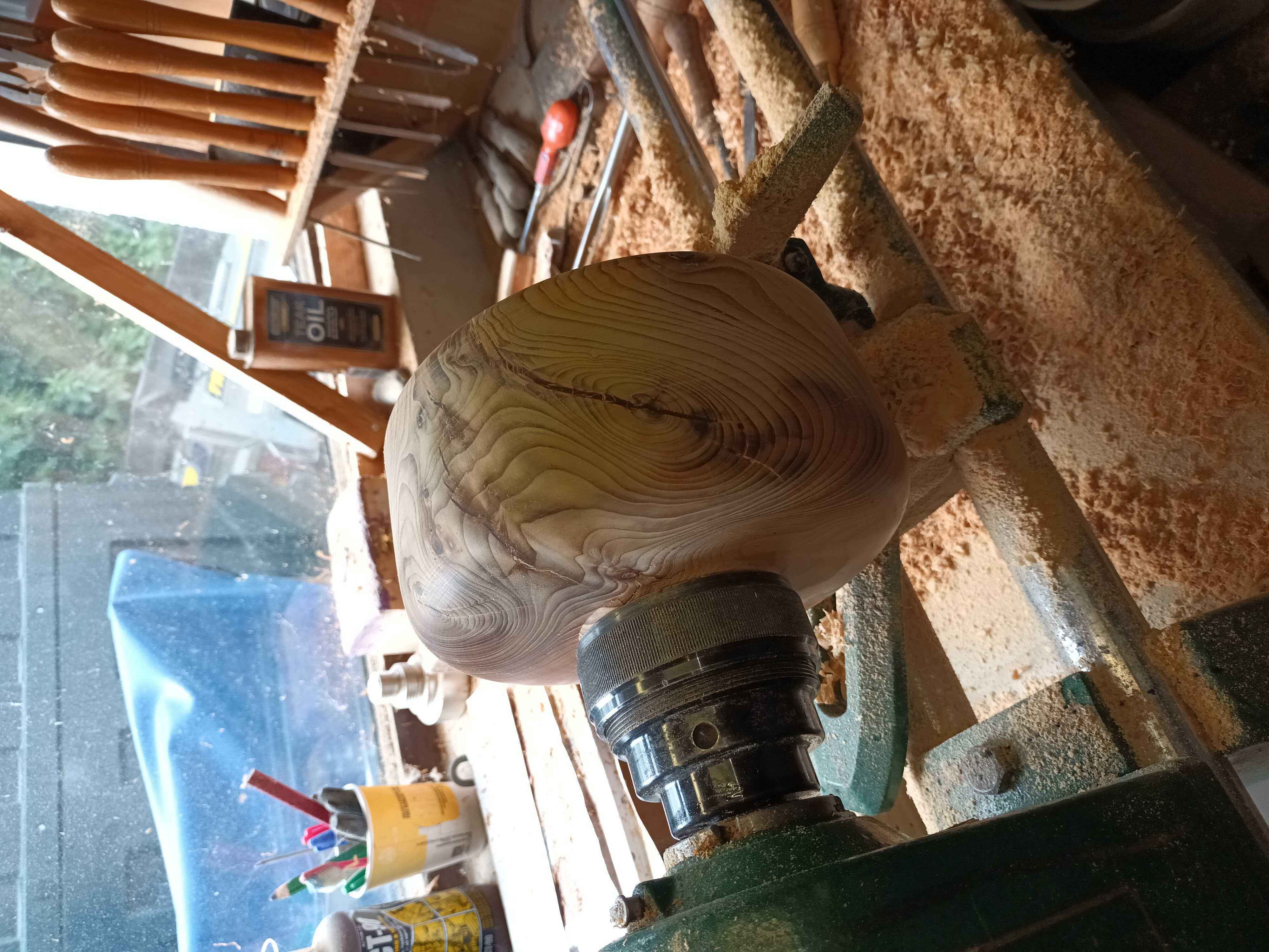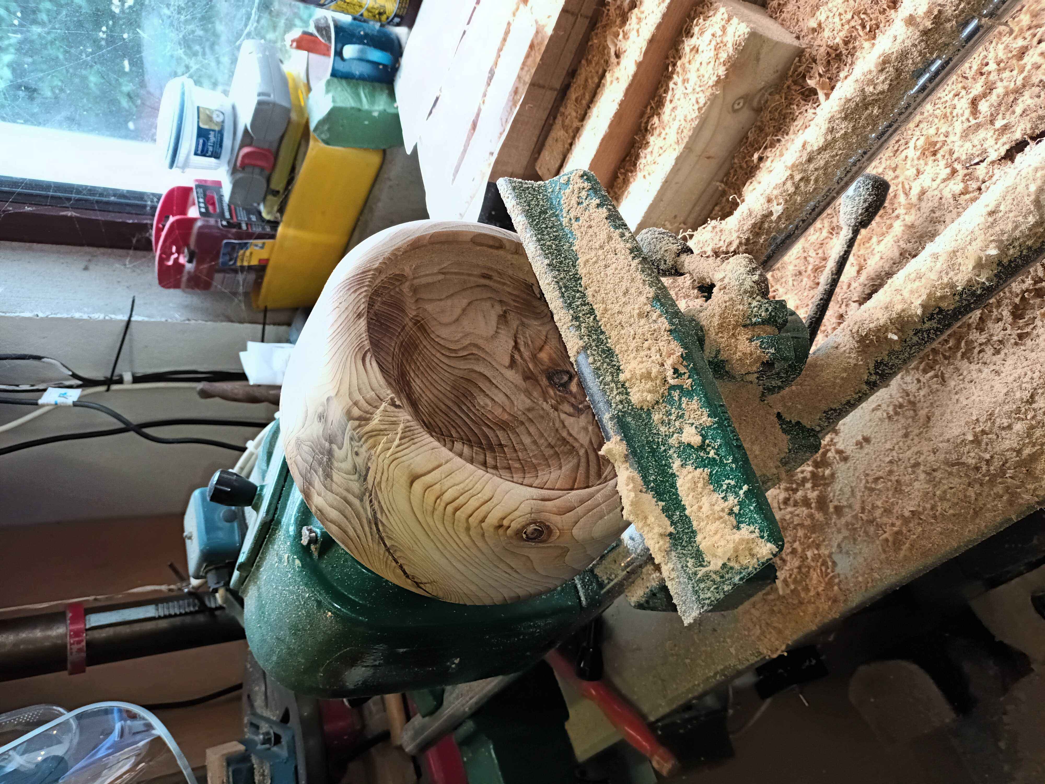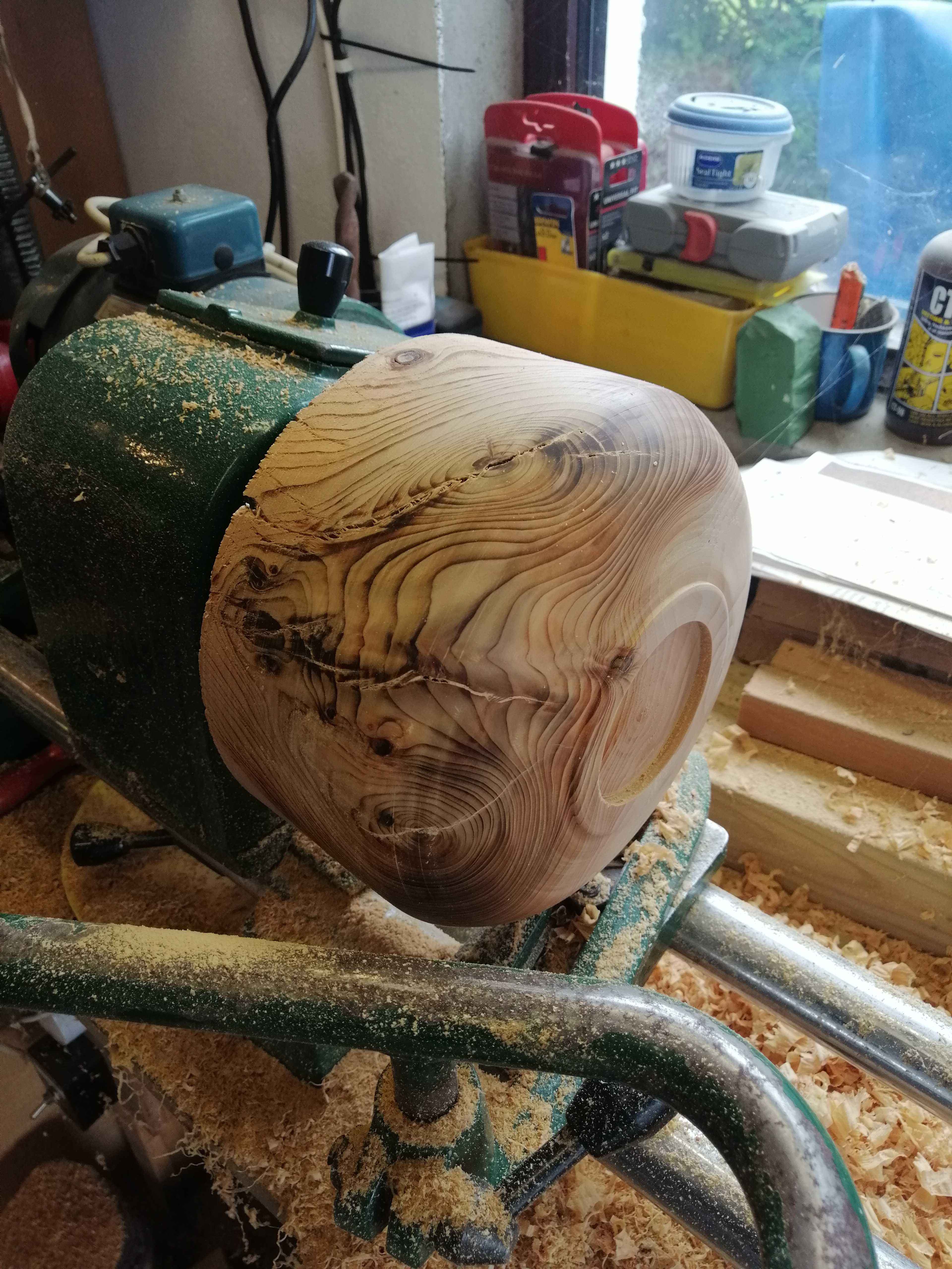 We were visiting friends who had just had a large cypress felled. Some had been turned into fantastic carvings by a man with a chainsaw, some went for firewood, and this piece was thrown in the bottom of the hedge because he couldn't work out how to split it, and luckily didn't have a chainsaw. It took me a while to figure out how to mount it on the lathe, and then I roughed it out with the chainsaw and set to. It's left quite a bit thicker than I normally would have done as there were a few shakes and I did want a bowl rather than an explosion! It went back to them as a memory of their tree.
