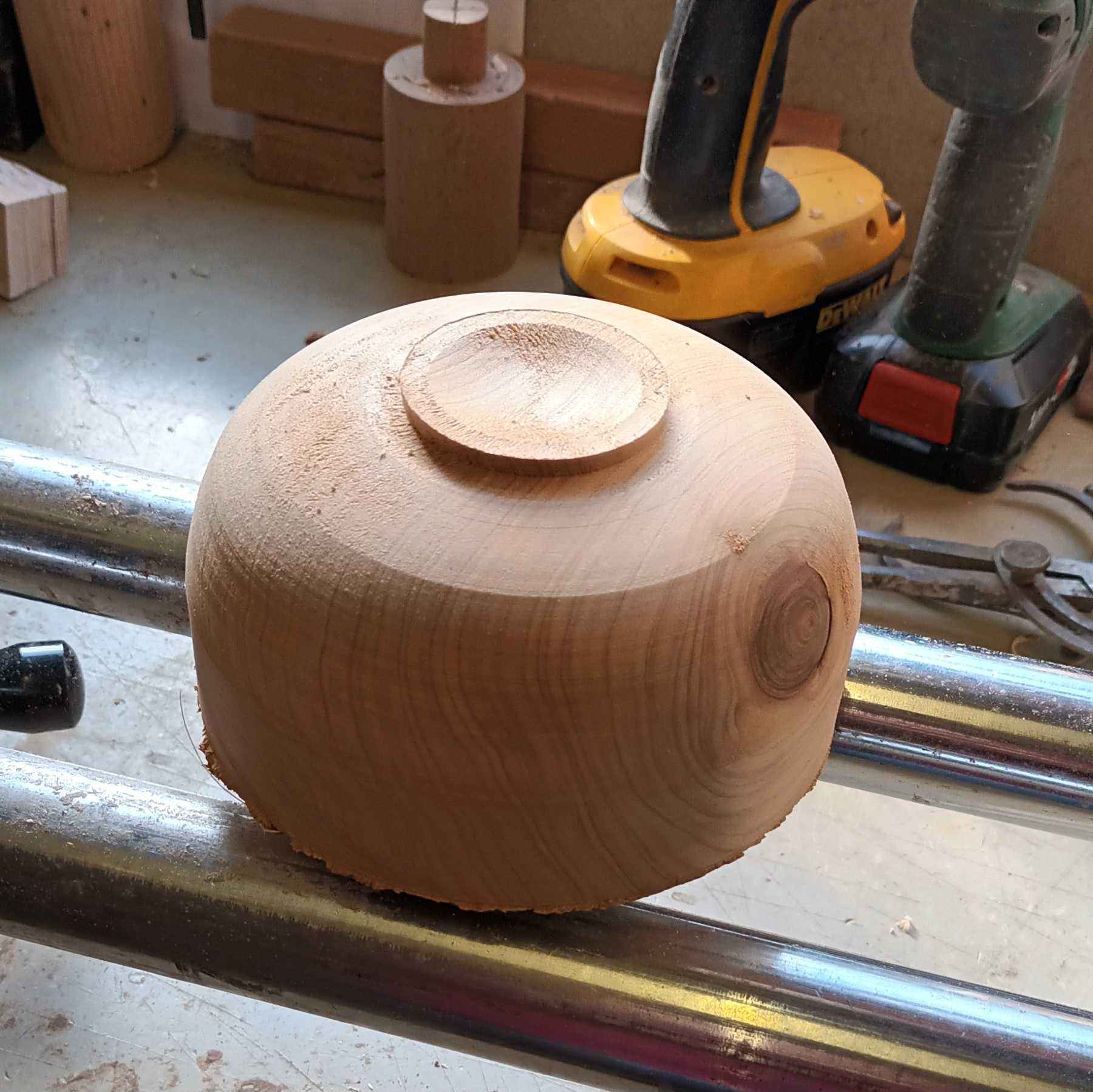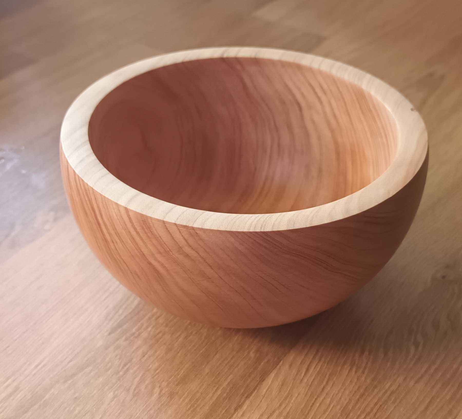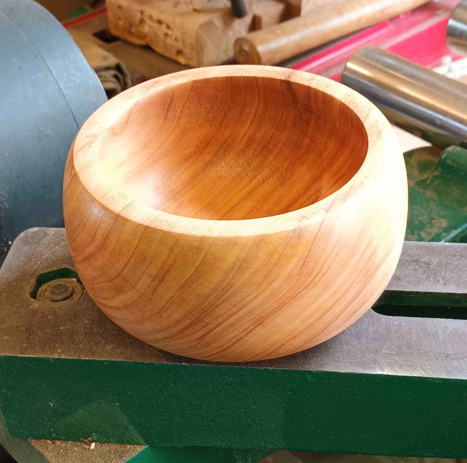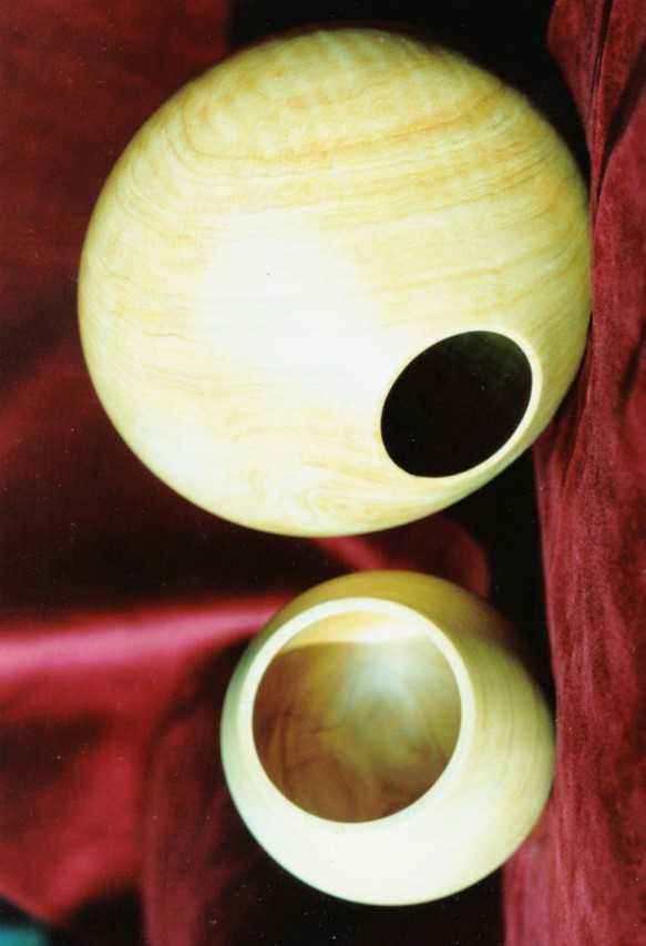 The council cut down a mature Monterey cypress in Craigantlet around 1990. They are usually felled a few feet from the ground, and later a crew comes out to deal with the stump. A friend saw the crew and asked them where they were taking it, "To the dump" they said. "Well, can you dump it in my garage?" he asked. It saved them a trip! The pot in the title photo is a hollow form which is around 2 to 3 mm thick and 200 mm in diameter. The title photo was take shortly after the bowl was turned, and is still very pale. The video was taken recently, and the wood has darkened to a deep golden hue. The wood was still pretty fresh, so easy to turn but gave off a lot of "vapour" which gave me a really sore throat. As this piece is from near the base the grain has been compressed as the tree sways, which gives the lovely, rippled effect. Some other bowls that I turned from this collection of lumps are shown below.