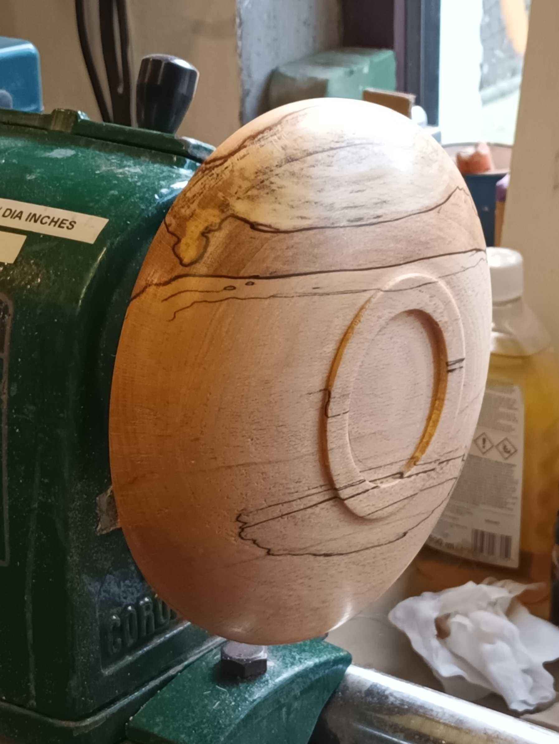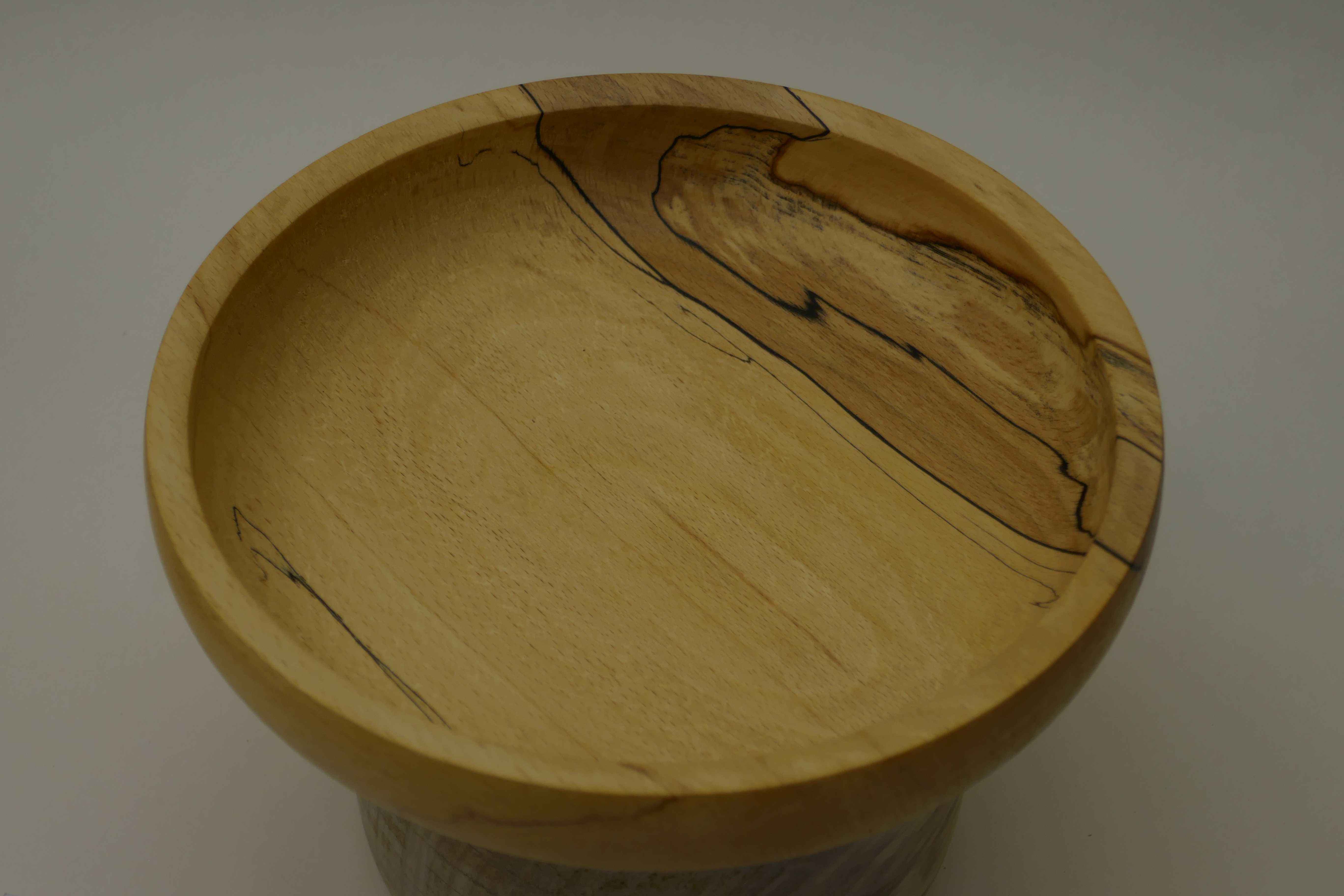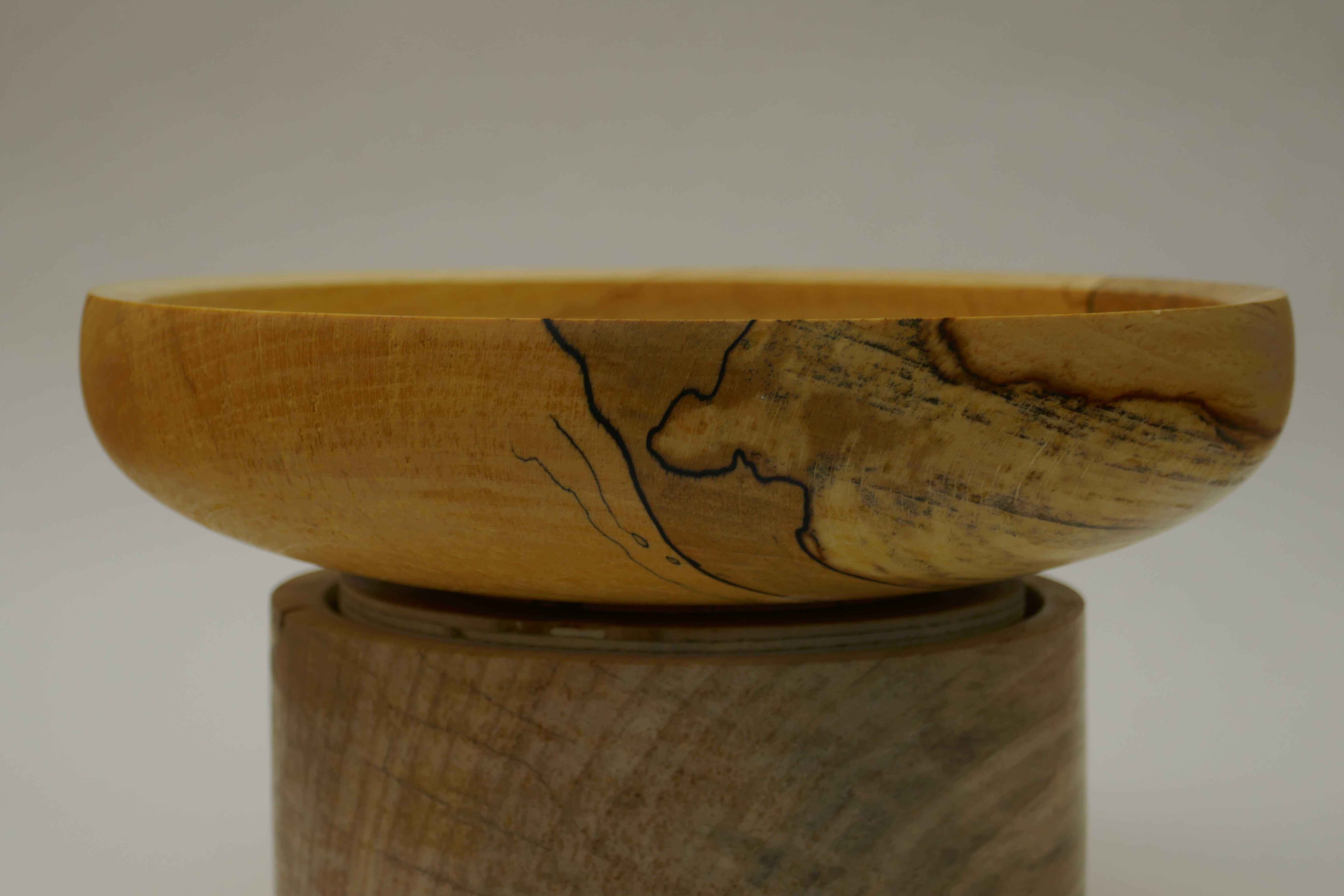 Wood that has fallen will sometimes have interesting colouration caused by fungii known as spalting. This can be simple colours such as yellows, pinks and purples, or in the case of this bowl the more classic black lines which is a mineral deposit. The dried wood is quite harmless to humans. The spalting adds a level of interest to the visual bowl, and each piece will be as unique as a fingerprint! This is a bowl from a set of three blanks which I bought, but each one is slightly different, and I have also given them a different shape.