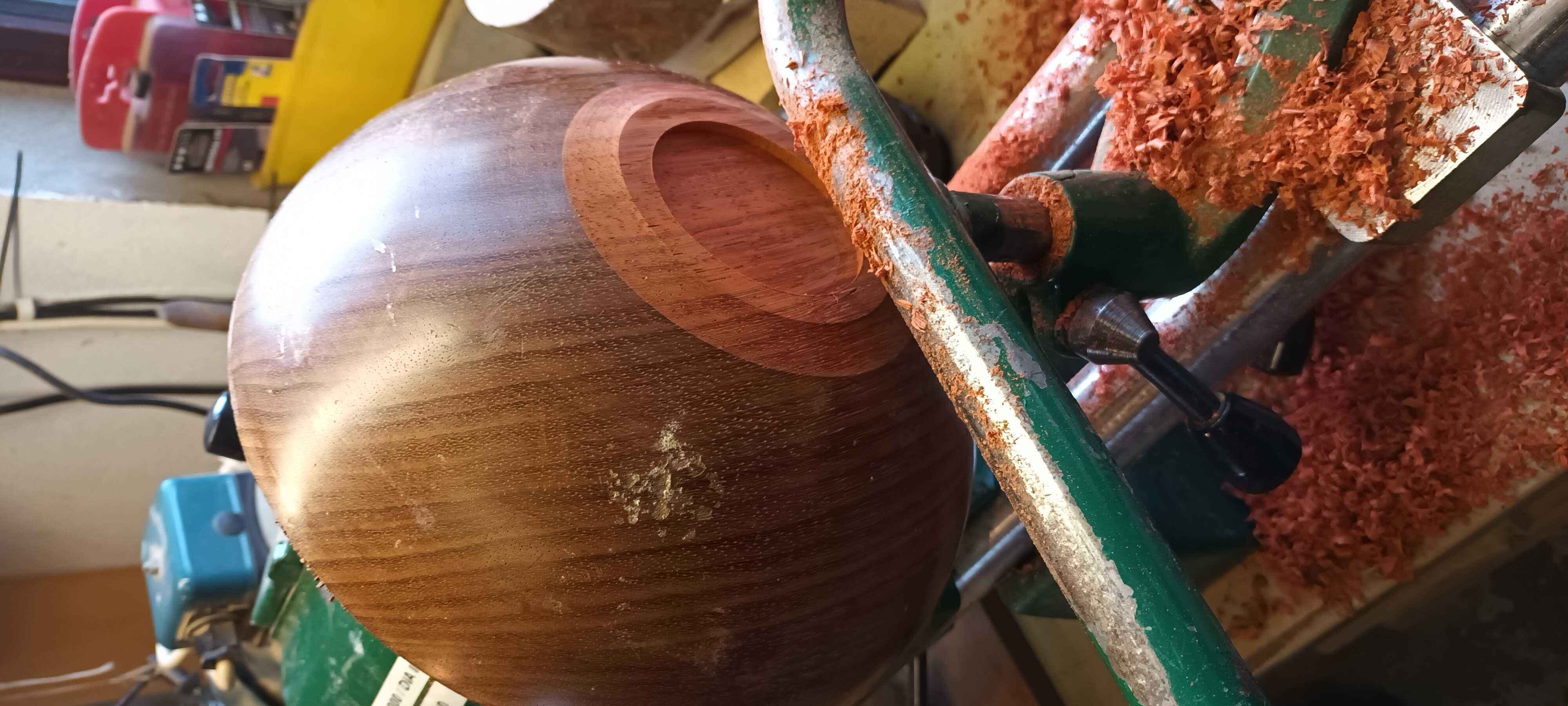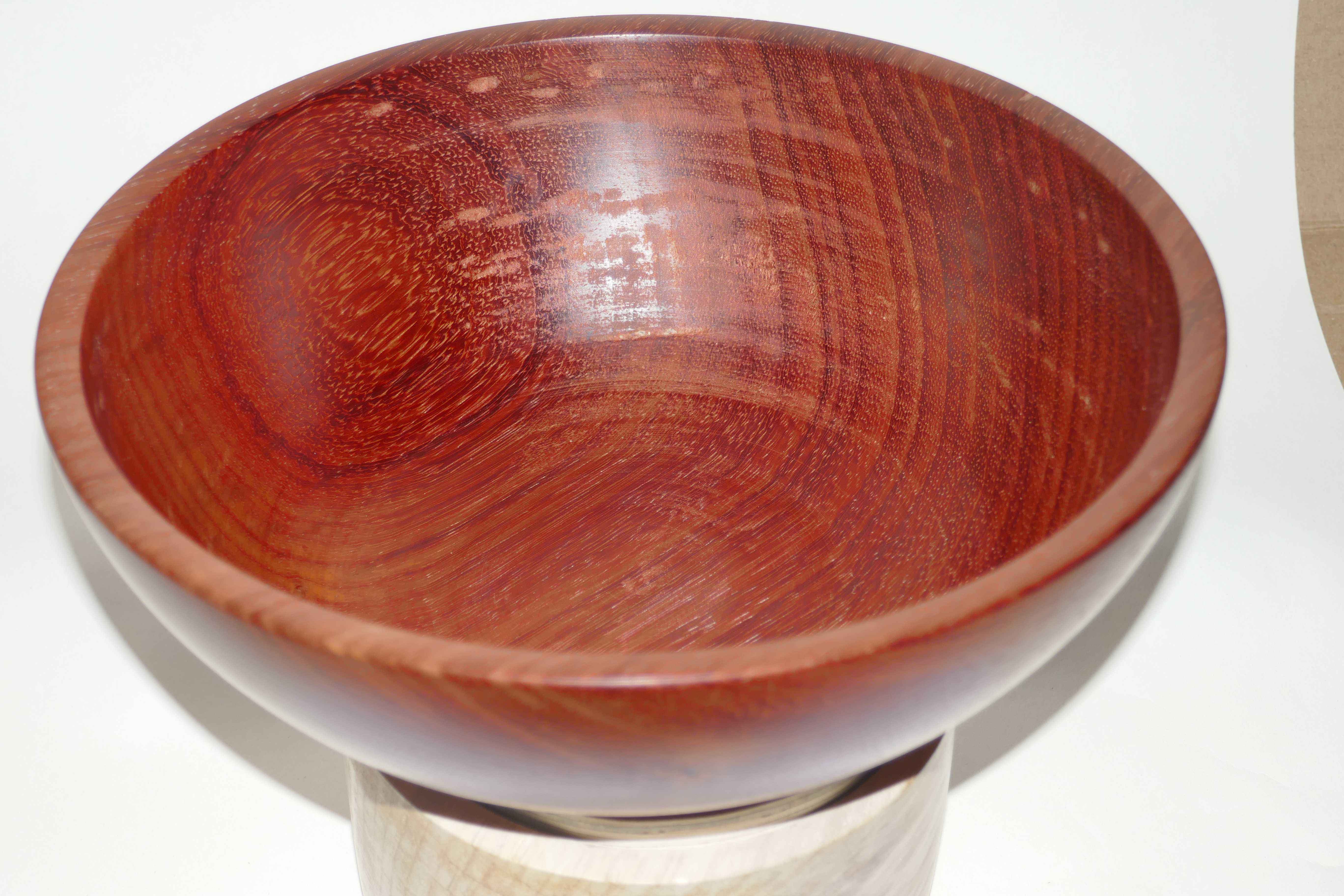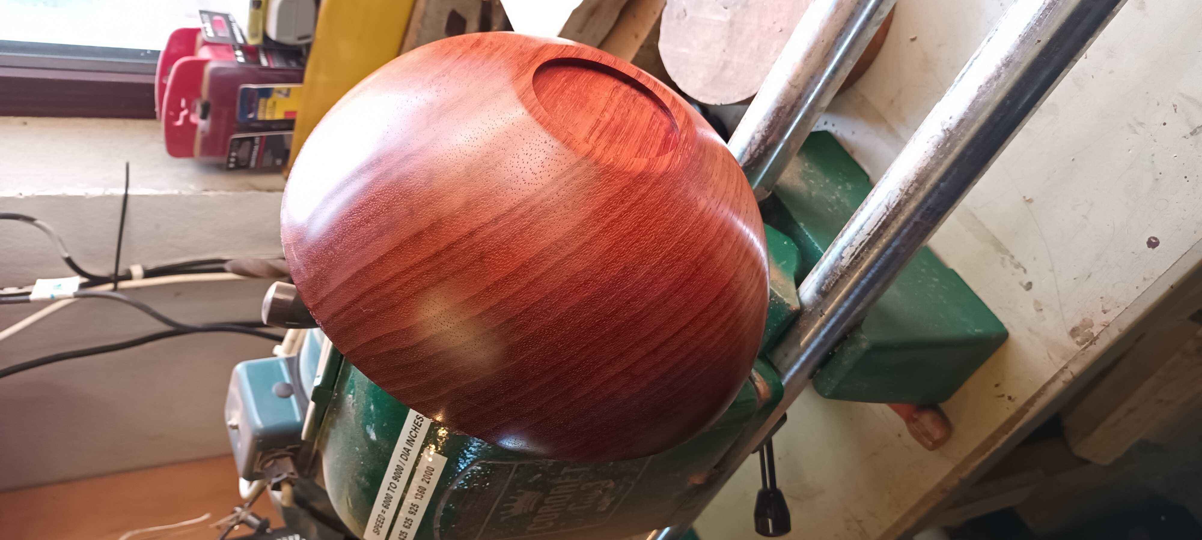 This was a piece from under Dad's bench. He started turning it as a wedding present for a cousin of mine, but had a gouge dig when starting hollowing out, and broke the foot. I managed to get it back on a faceplate, made a new recessed dovetail foot, and cleaned up the outside. Turning it smells a little of nutmeg. Unfortunately while hollowing out I got a little too thin, and a bit of tool chatter dug a shade too deep, leaving a small hole. Other than this and a few tool marks on the inside as I didn't want to risk sanding too much and making the situation worse it's a lovely bowl to look at. I priced up a blank to see if I could have another go, but blanks this size are over £100 so I decided not to!