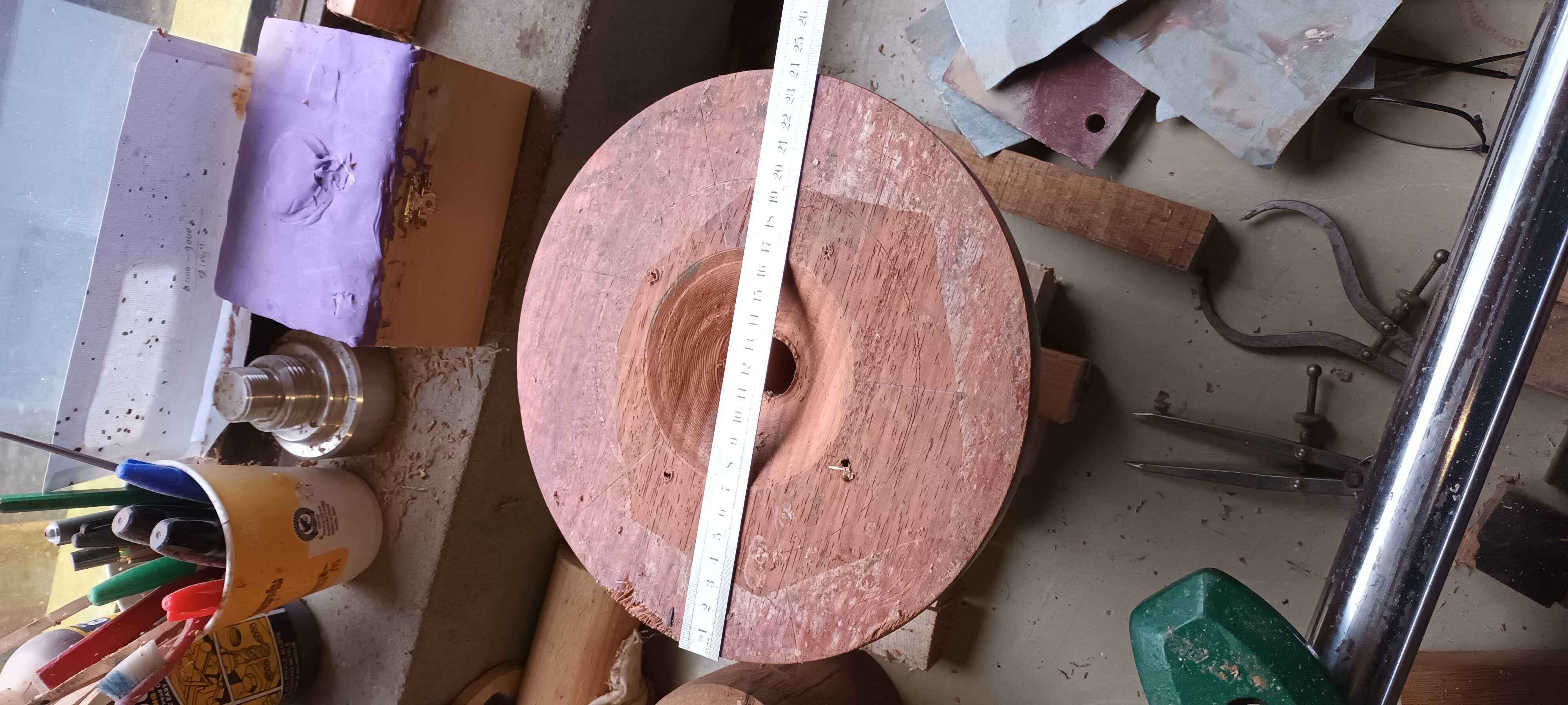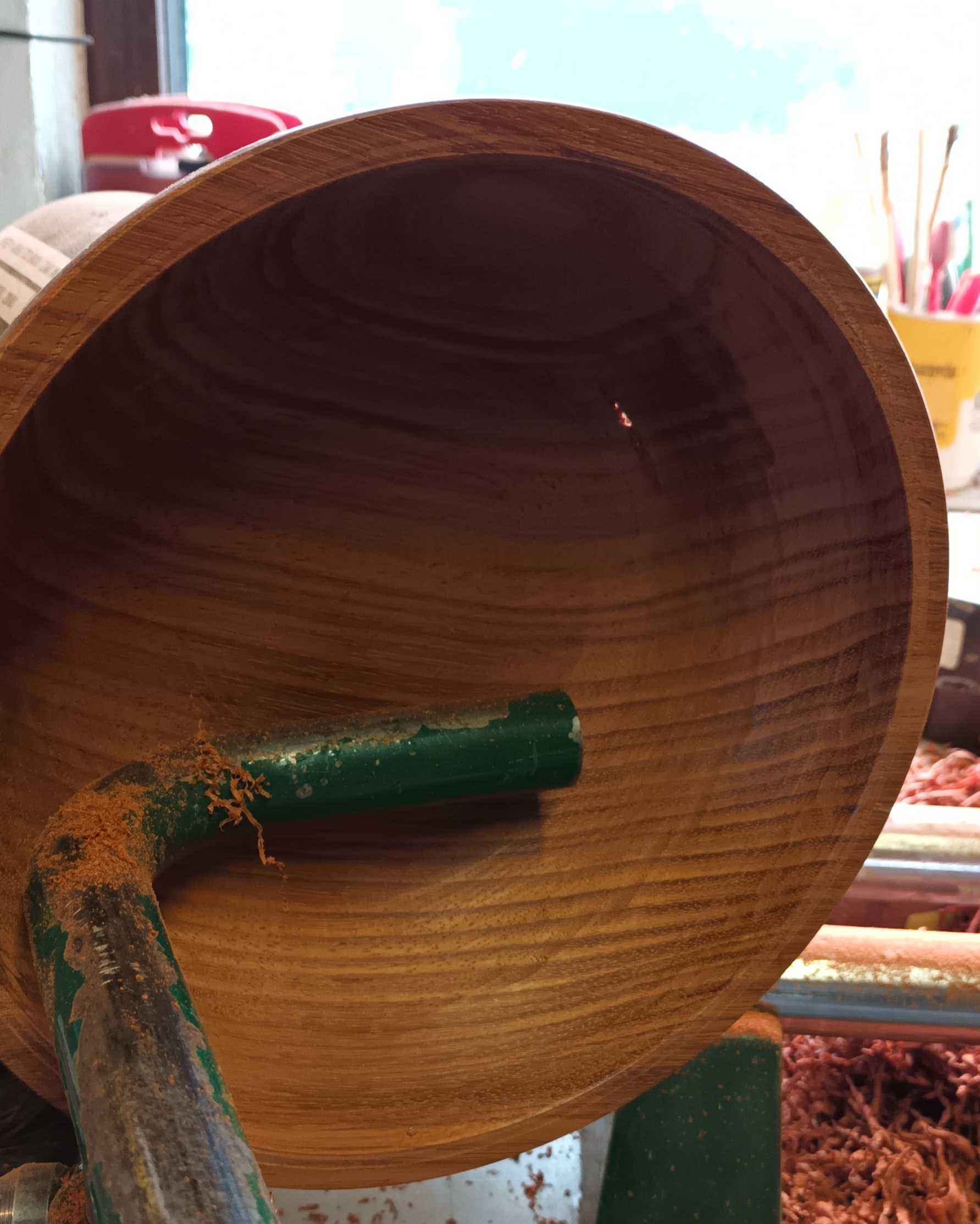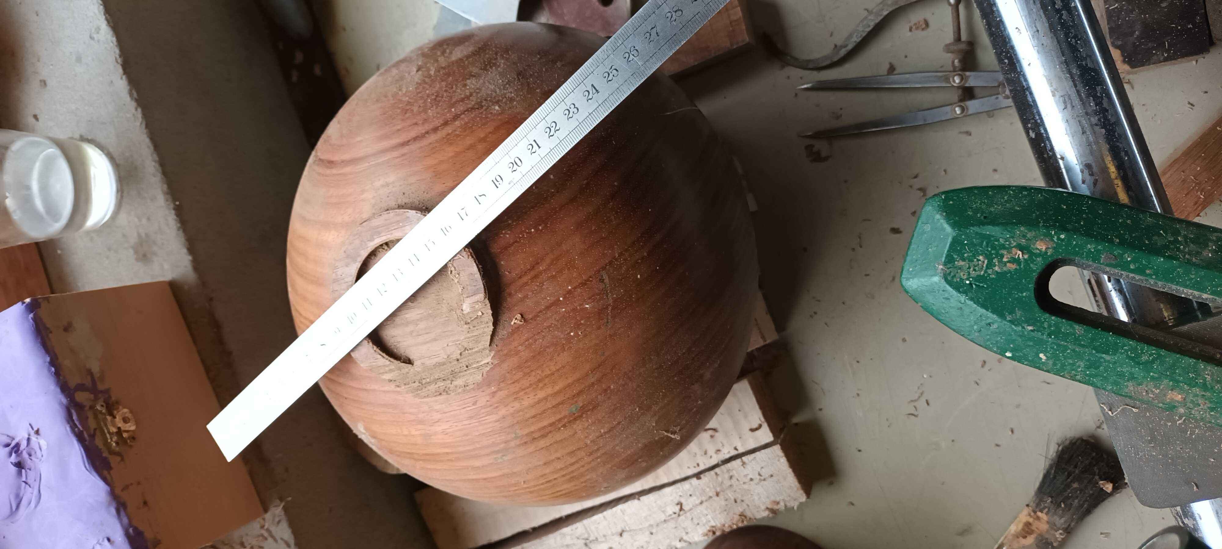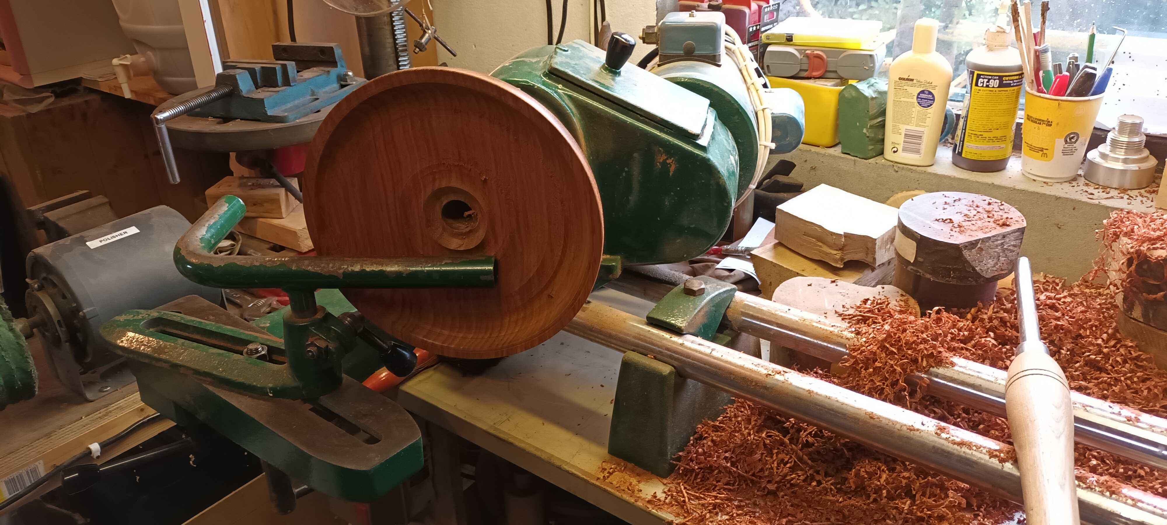 This was a piece from under Dad's bench. He started turning it as a wedding present for a cousin of mine, but had a gouge dig when starting hollowing out, and broke the foot. I managed to get it back on a faceplate, made a new recessed dovetail foot, and cleaned up the outside. Turning it smells a little of nutmeg. Unfortunately while hollowing out I got a little too thin, and a bit of tool chatter dug a shade too deep, leaving a small hole. Other than this and a few tool marks on the inside as I didn't want to risk sanding too much and making the situation worse it's a lovely bowl to look at. I priced up a blank to see if I could have another go, but blanks this size are over £100 so I decided not to!