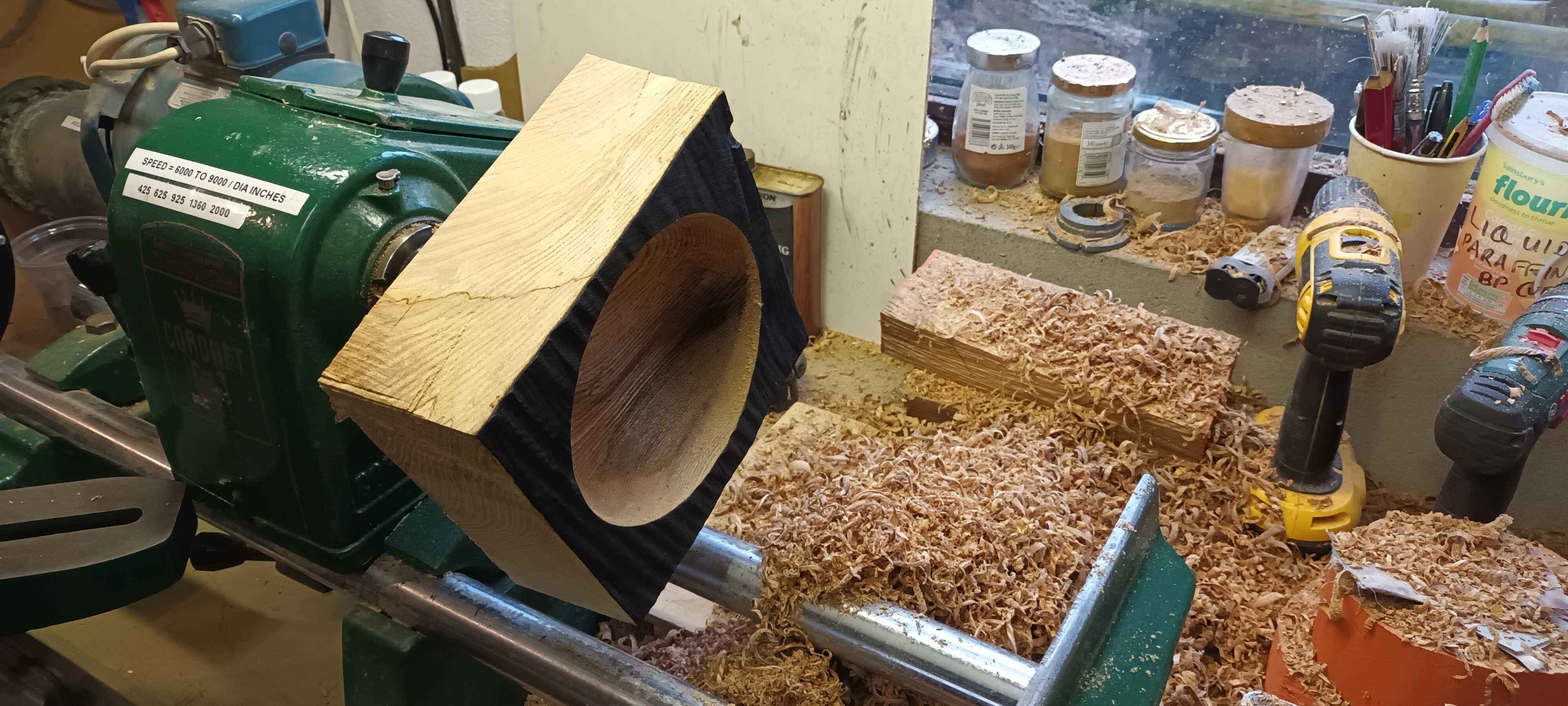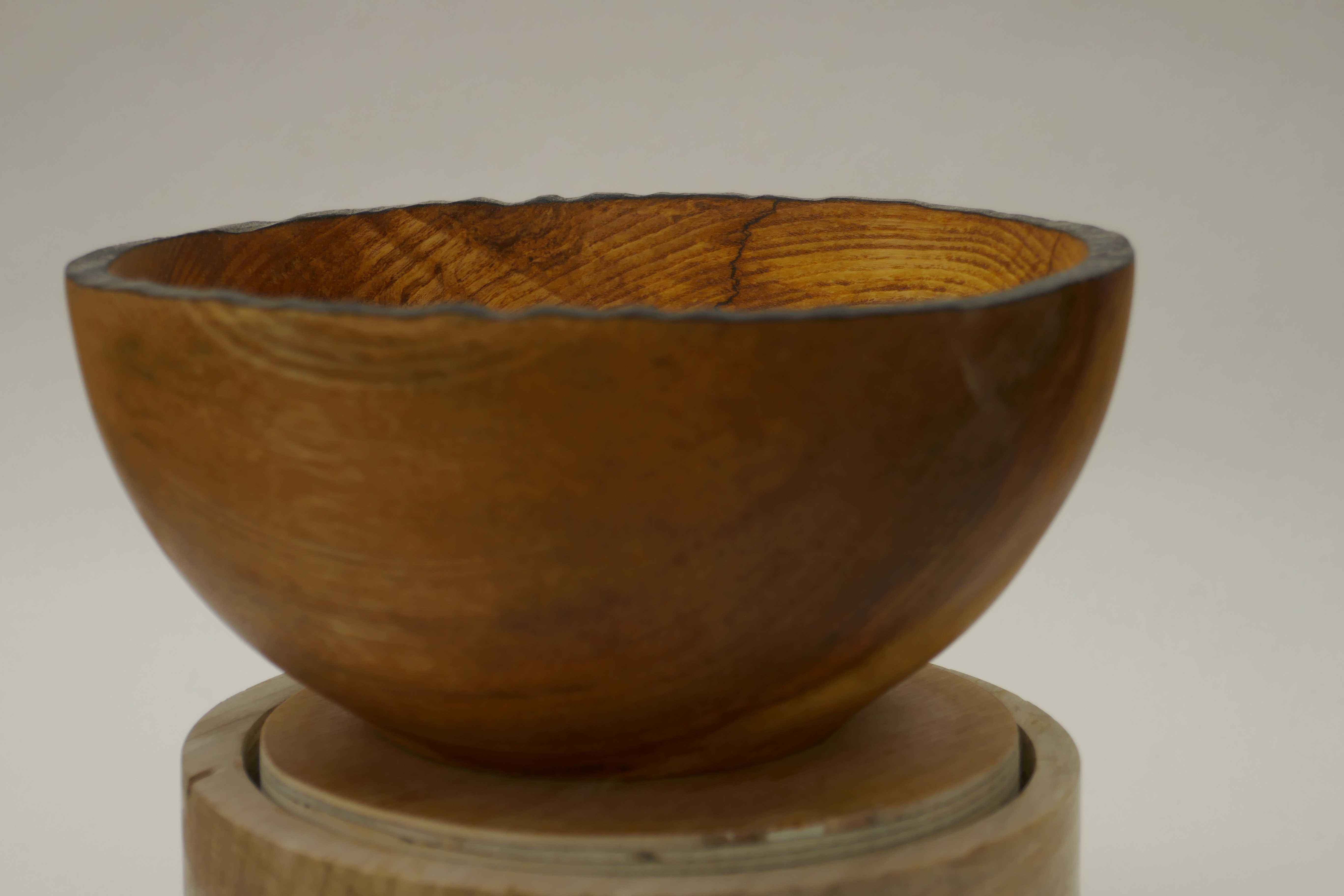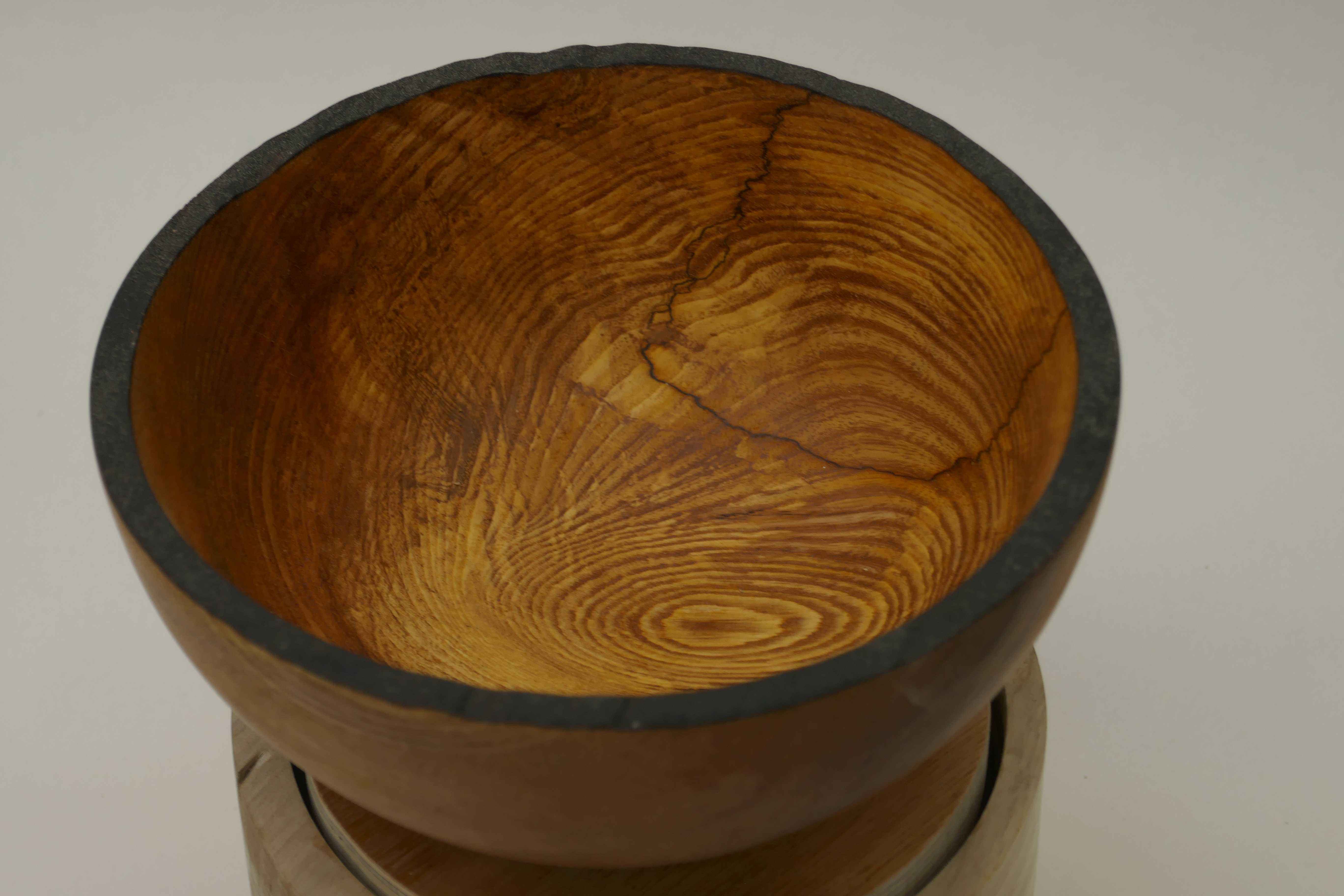 I started out from a square piece after watching a YouTube video by Kent Weakly of turnawoodbowl.com. He had an old piece of oak, and used carbonising as a way of adding some contrast, and also used the square shape as an "easy for beginners" lure. The bowl felt a little heavy, but was quite nice looking. I left the top face roughened by the chainsaw to provide further contrast with the smooth interior. After a few weeks some drying cracks started to develop as my poplar was only semi-seasoned unlike Kent's oak. I put the piece back on a large jam chuck made from a lump of ash, and turned the outside to a more conventional shape, then tidied up the interior. The wood has some quite attractive figuring from being near a branch junction.