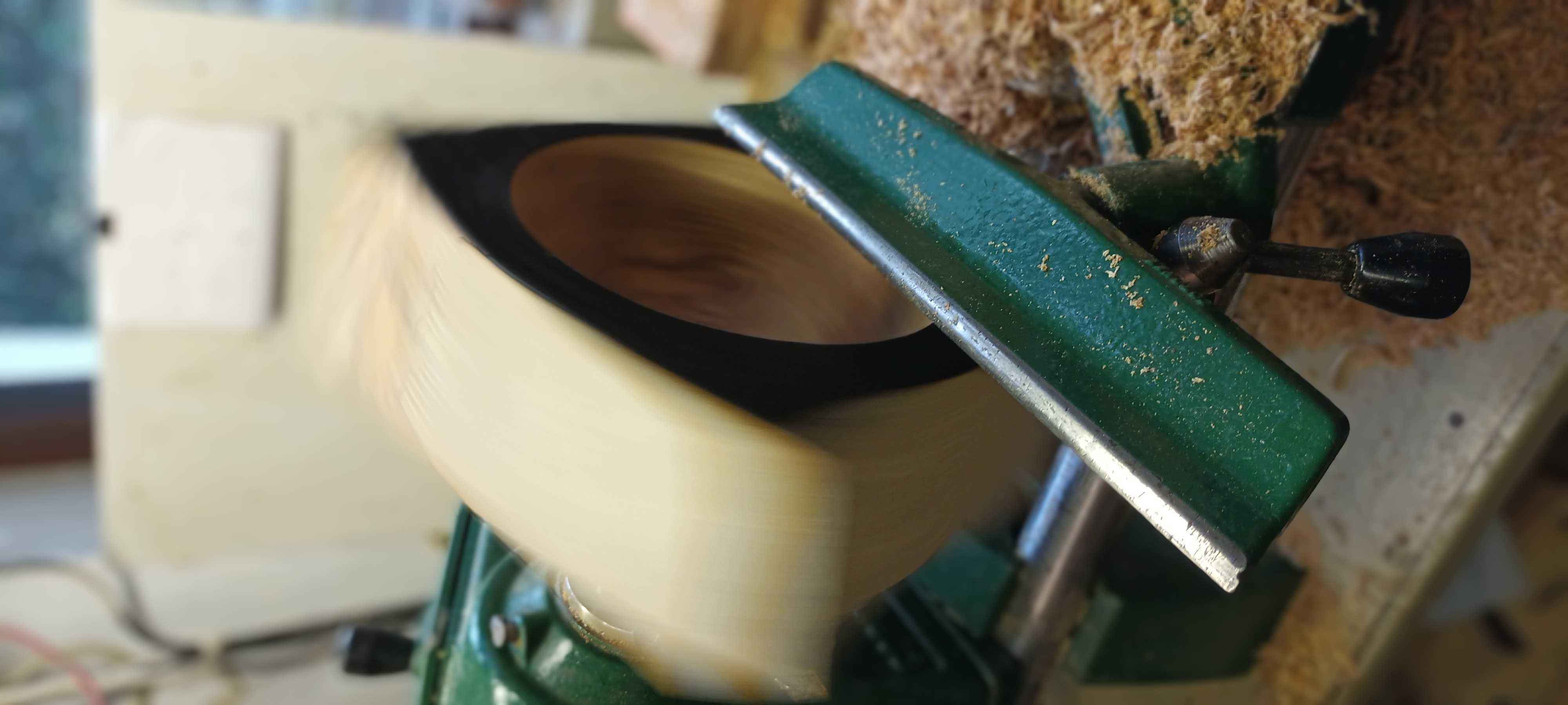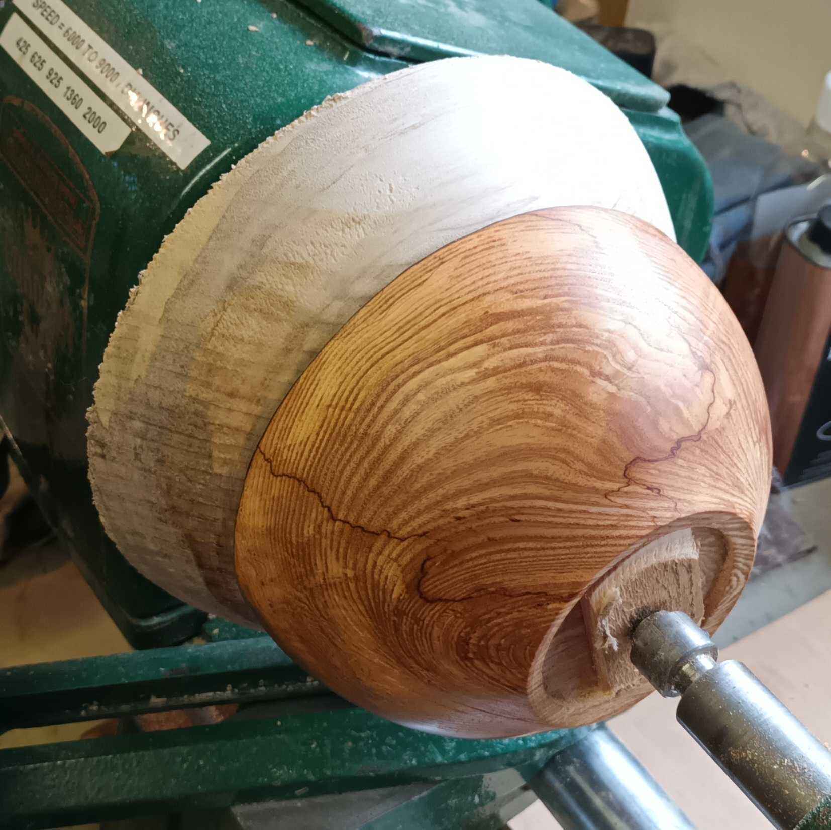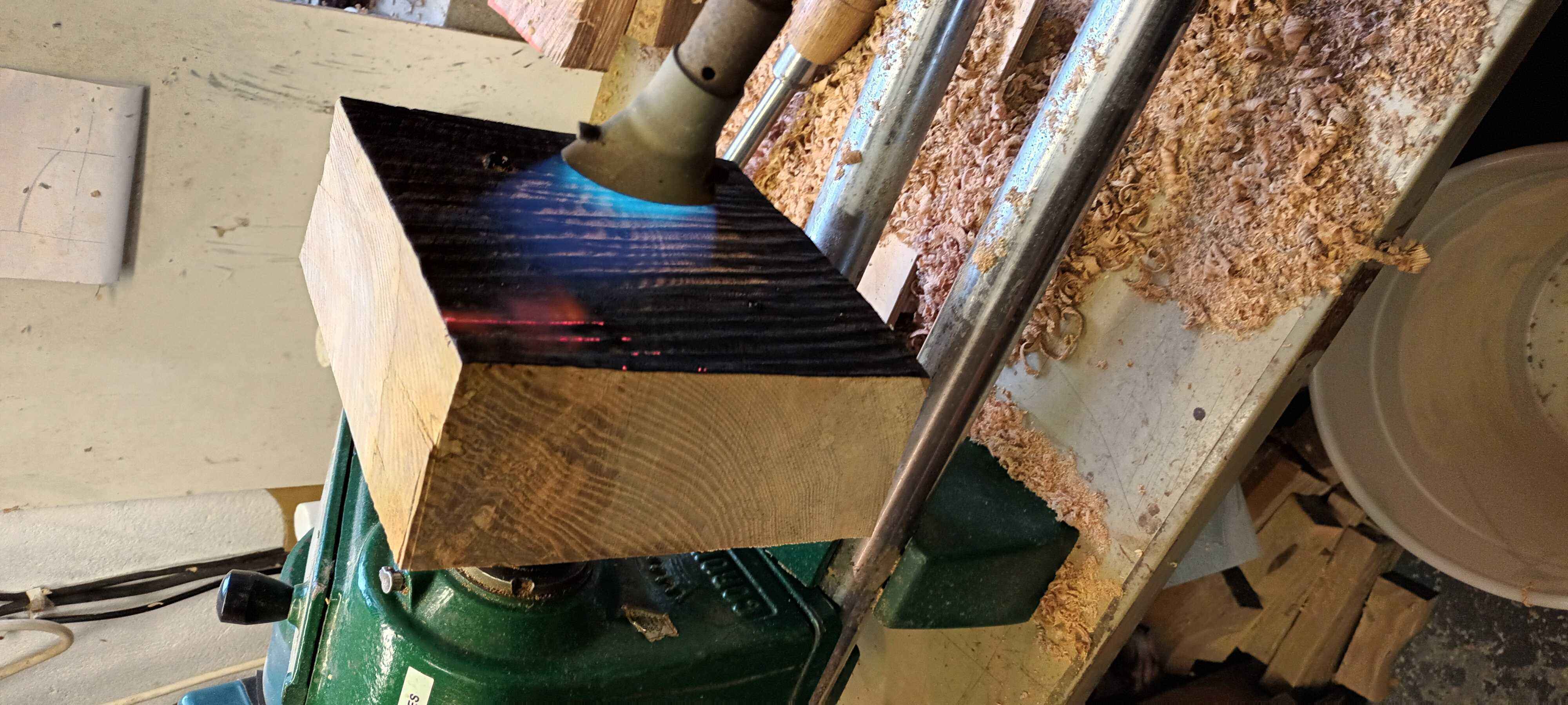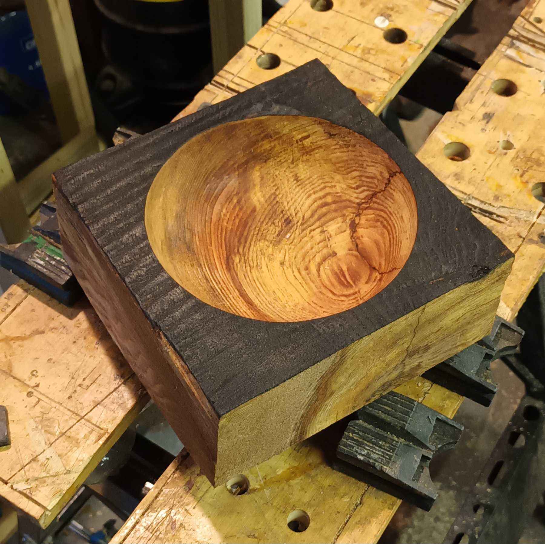 I started out from a square piece after watching a YouTube video by Kent Weakly of turnawoodbowl.com. He had an old piece of oak, and used carbonising as a way of adding some contrast, and also used the square shape as an "easy for beginners" lure. The bowl felt a little heavy, but was quite nice looking. I left the top face roughened by the chainsaw to provide further contrast with the smooth interior. After a few weeks some drying cracks started to develop as my poplar was only semi-seasoned unlike Kent's oak. I put the piece back on a large jam chuck made from a lump of ash, and turned the outside to a more conventional shape, then tidied up the interior. The wood has some quite attractive figuring from being near a branch junction.
