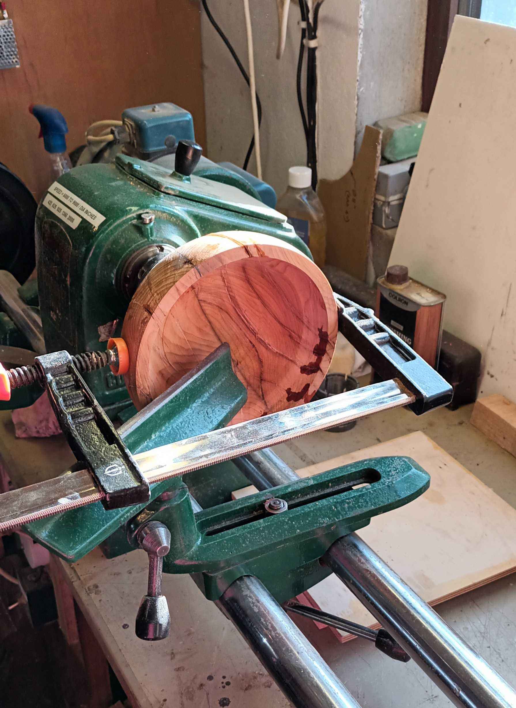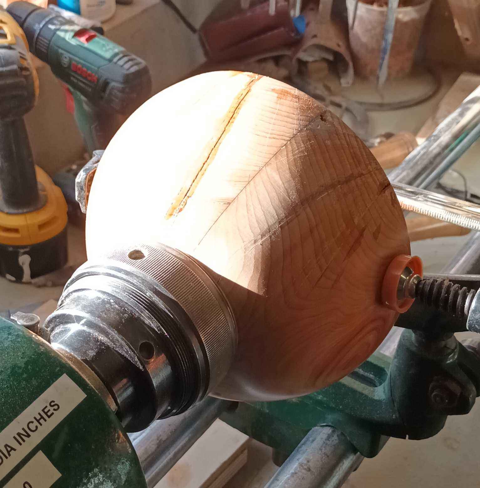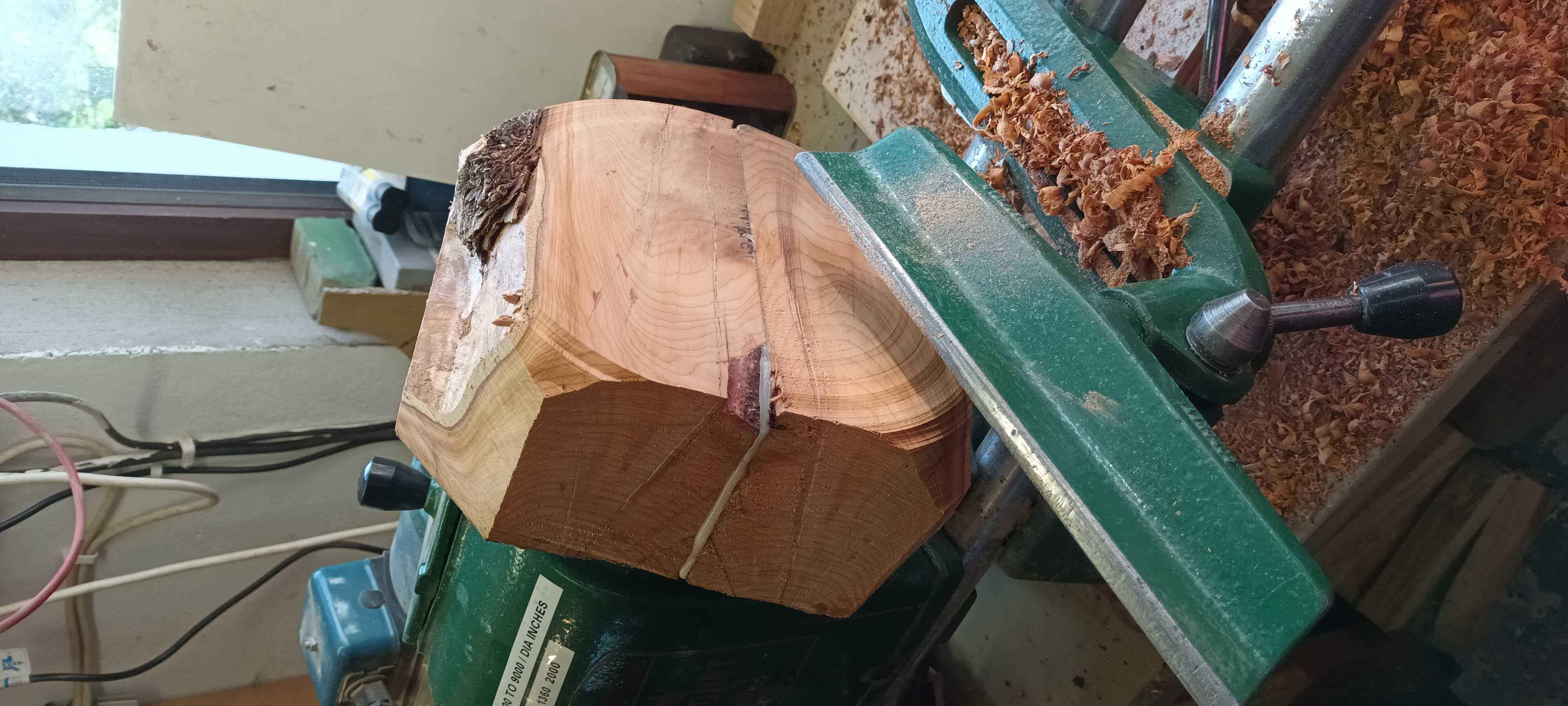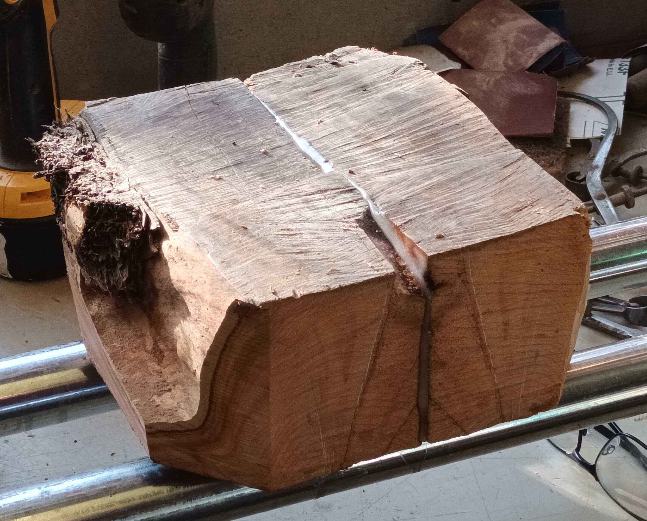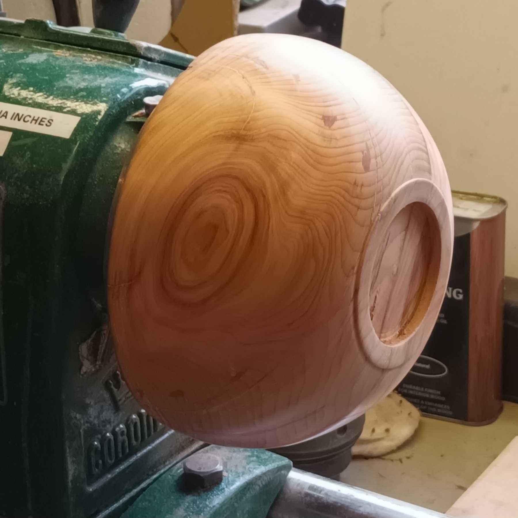 It's hard to obtain large pieces of yew, so I glued two pieces together from a log I inherited from my father, which was actually a tree I had cut down in my uncle's garden in 1987. Yew is pretty much characterised by shakes (drying cracks), so I didn't want to take this too thin and risk destruction. The end result is a classical shape with a pleasing feel and heft. Yew polishes to a natural shine due to the oils in it, but I have finished this with a mixture of boiled linseed oil and beeswax to seal the grain and stop dirt entering.