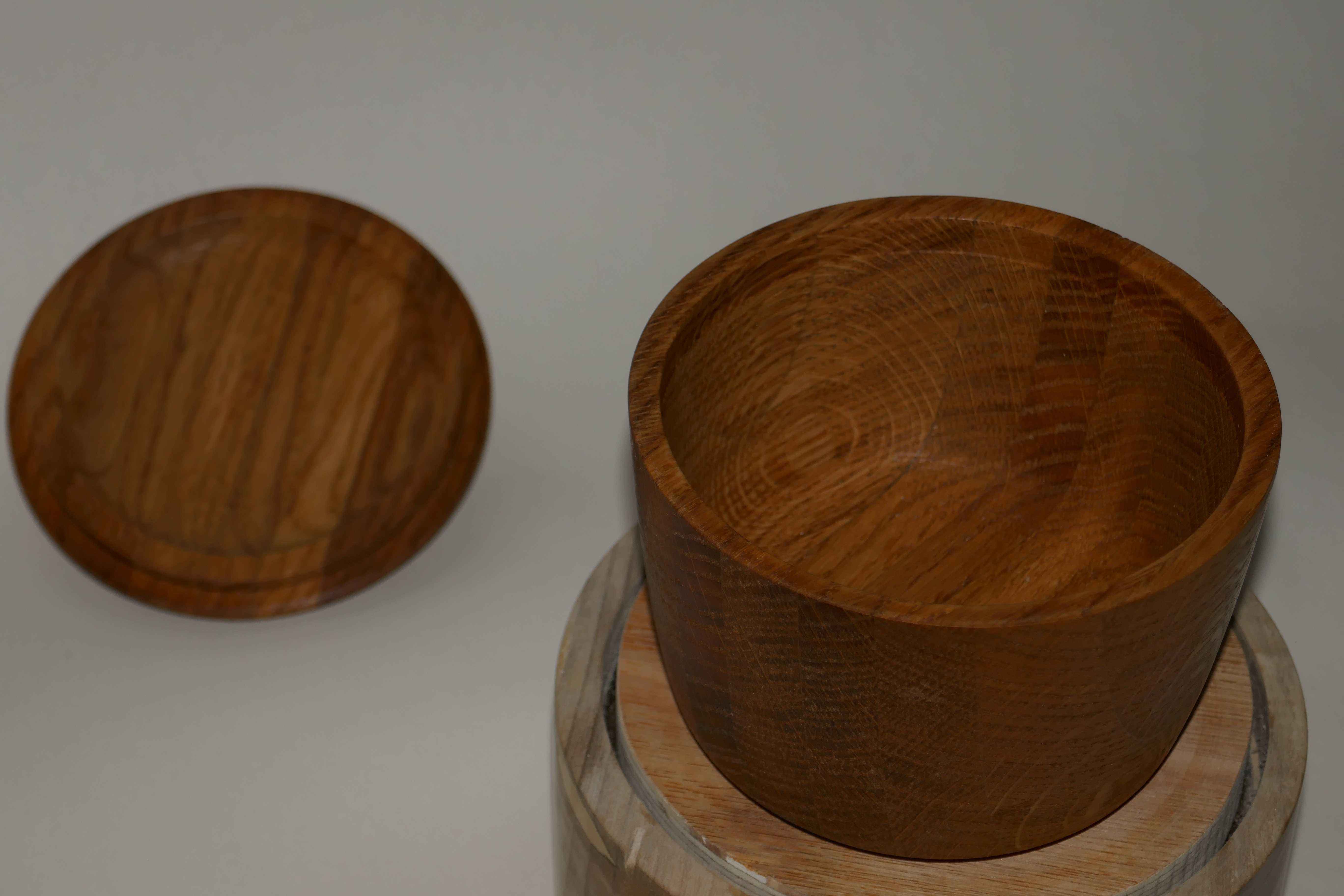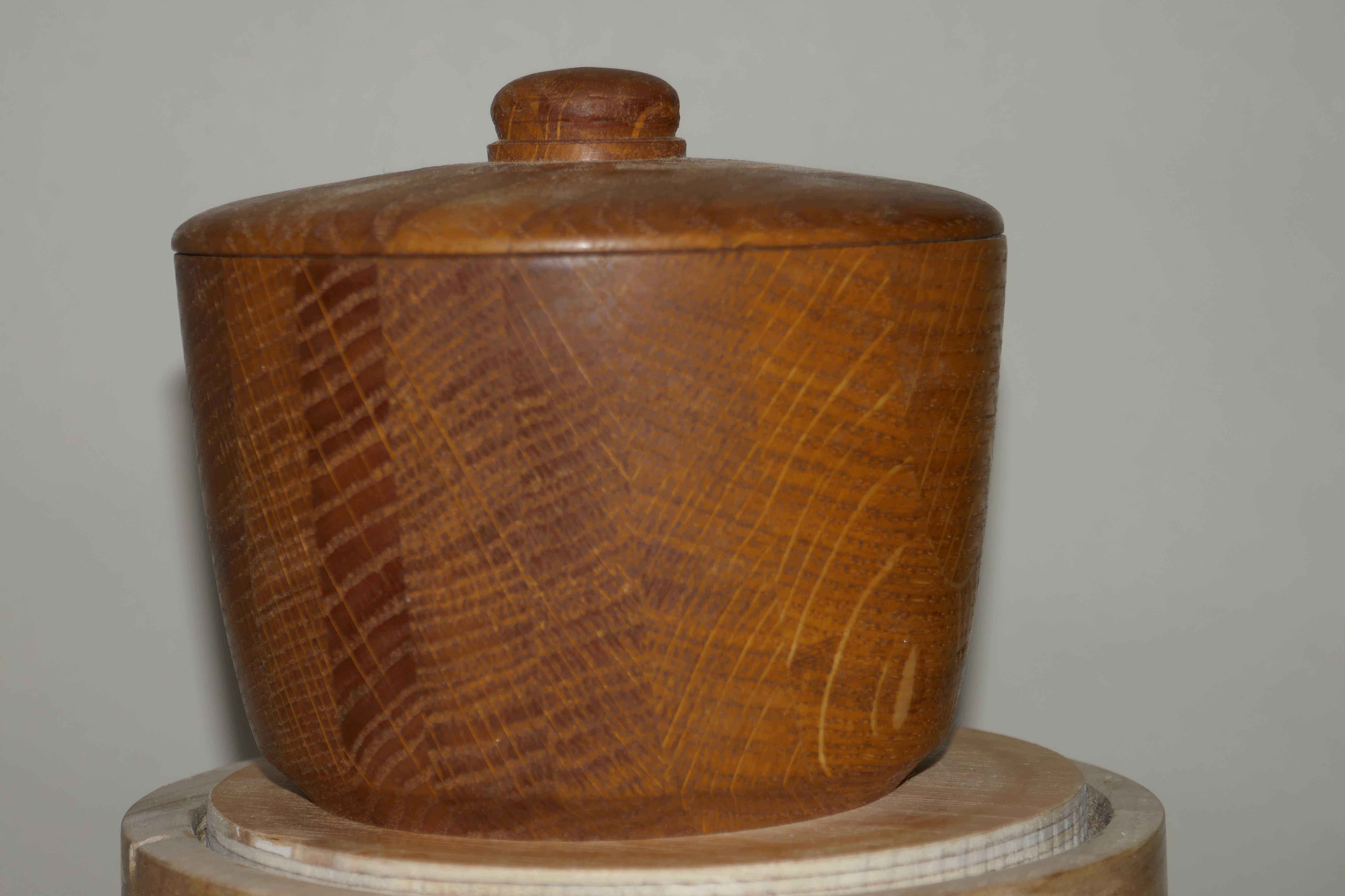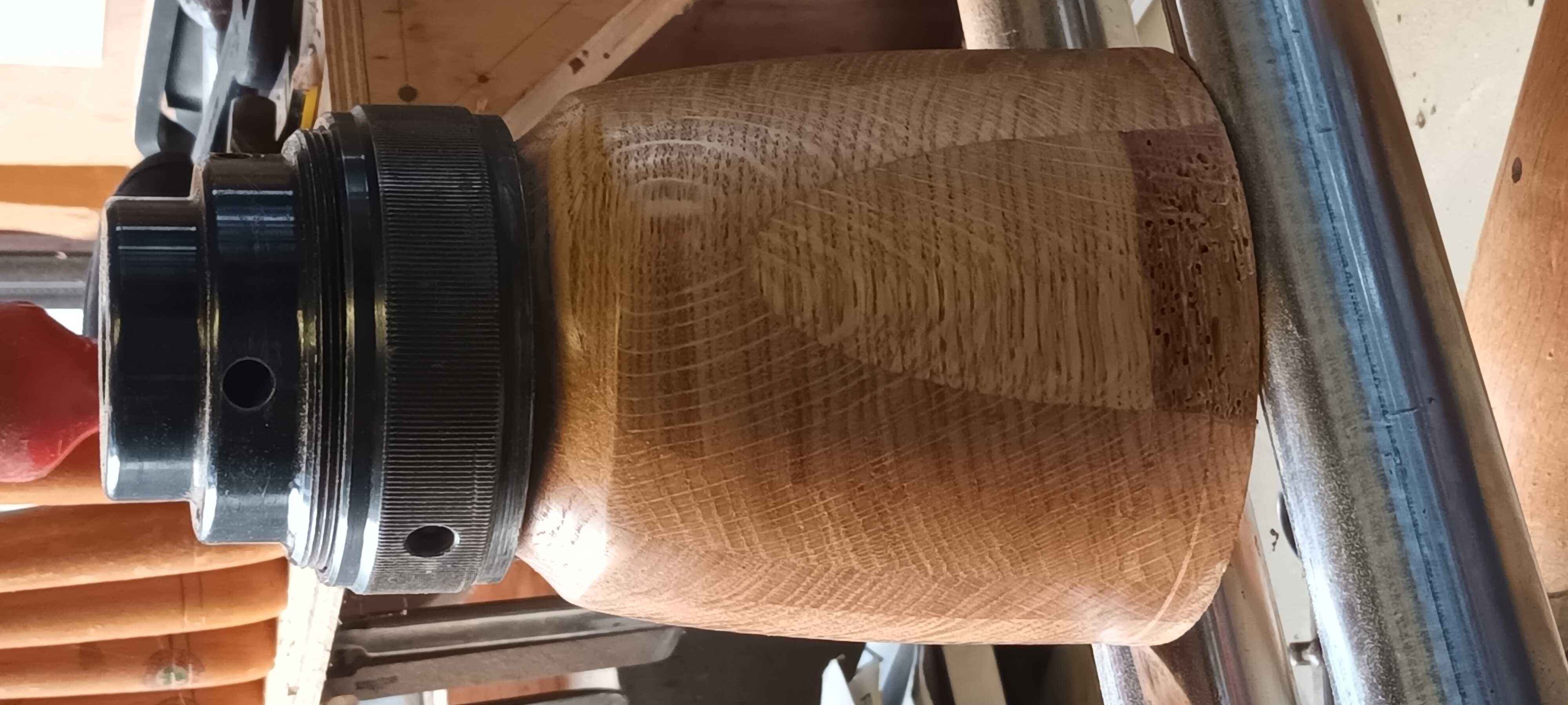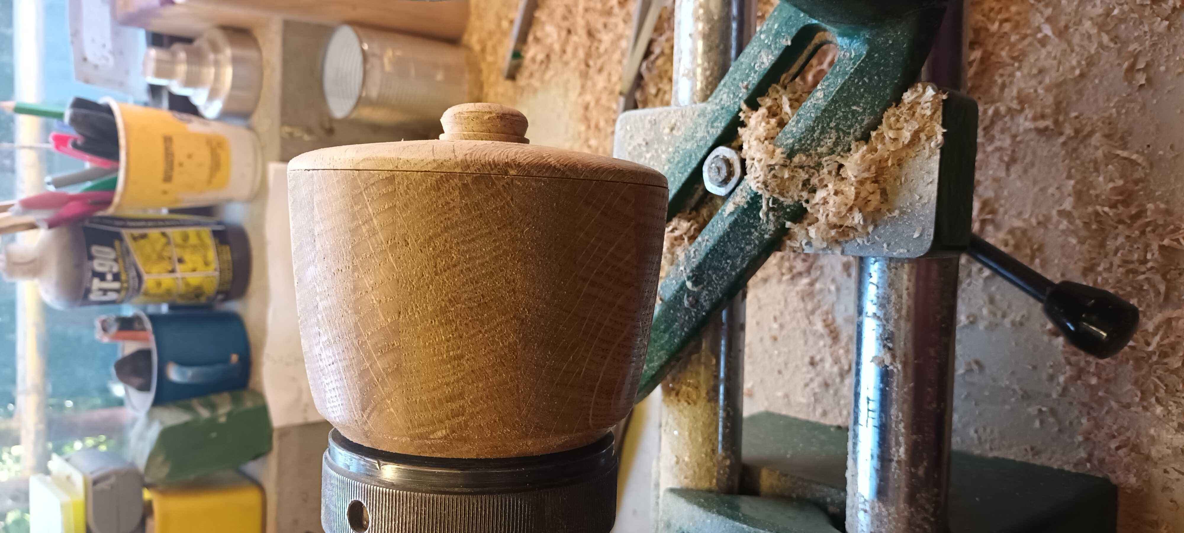 Dad made a coffee table for my brother many years ago. With some of the offcuts he made several of these layered oak blanks. Two I made into bowls, but this one was taller, and I though a lidded pot would be nice to try.