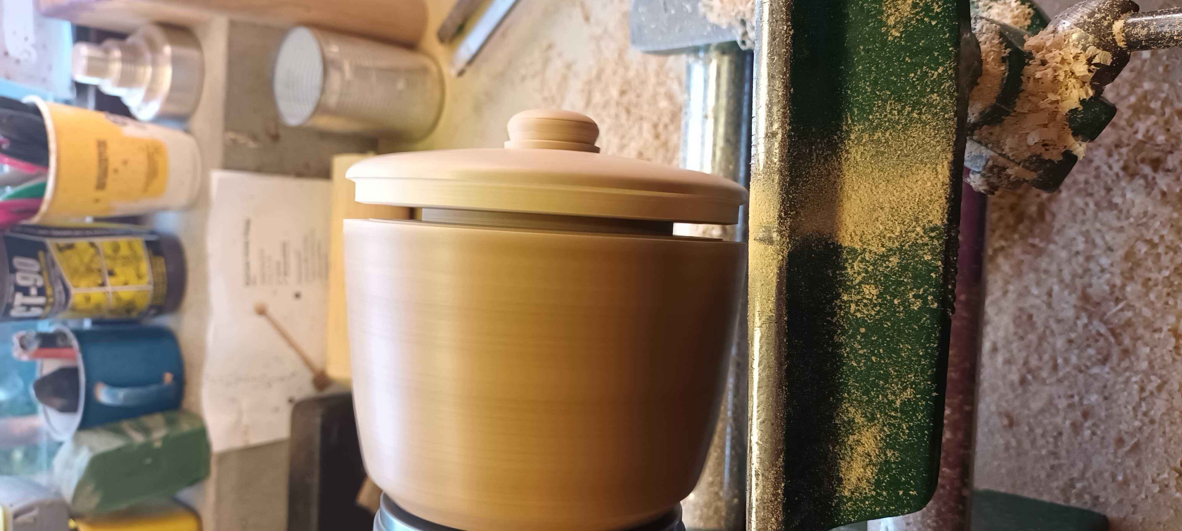 The blank contained some sapwood which had been worm damaged, so the pot ended up a little shorter than I had planned, but as this was a well seasoned piece (some twenty years under the bench) I was able to make the walls reasonably thin, and the pot and lid have both stayed stable, so the fit is still nice a year after it was made.