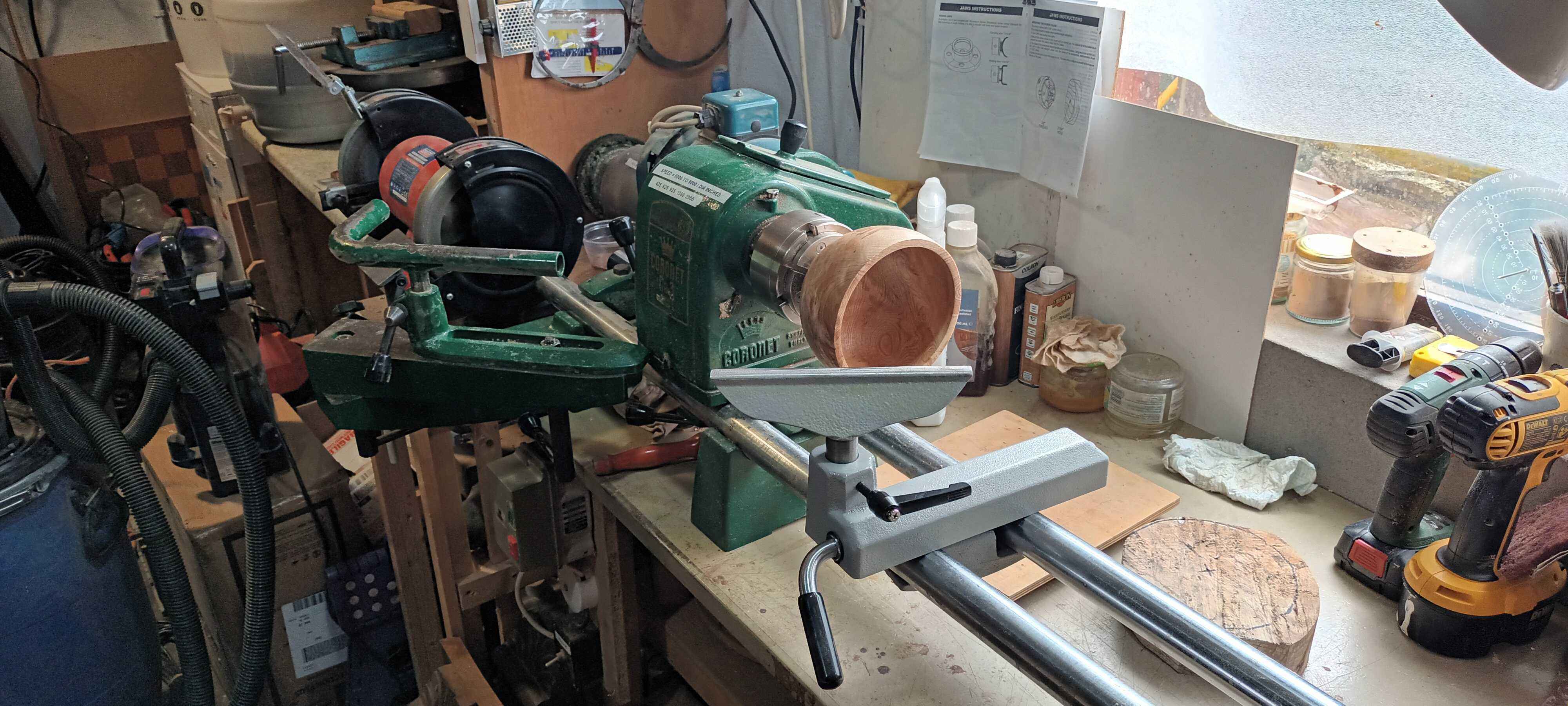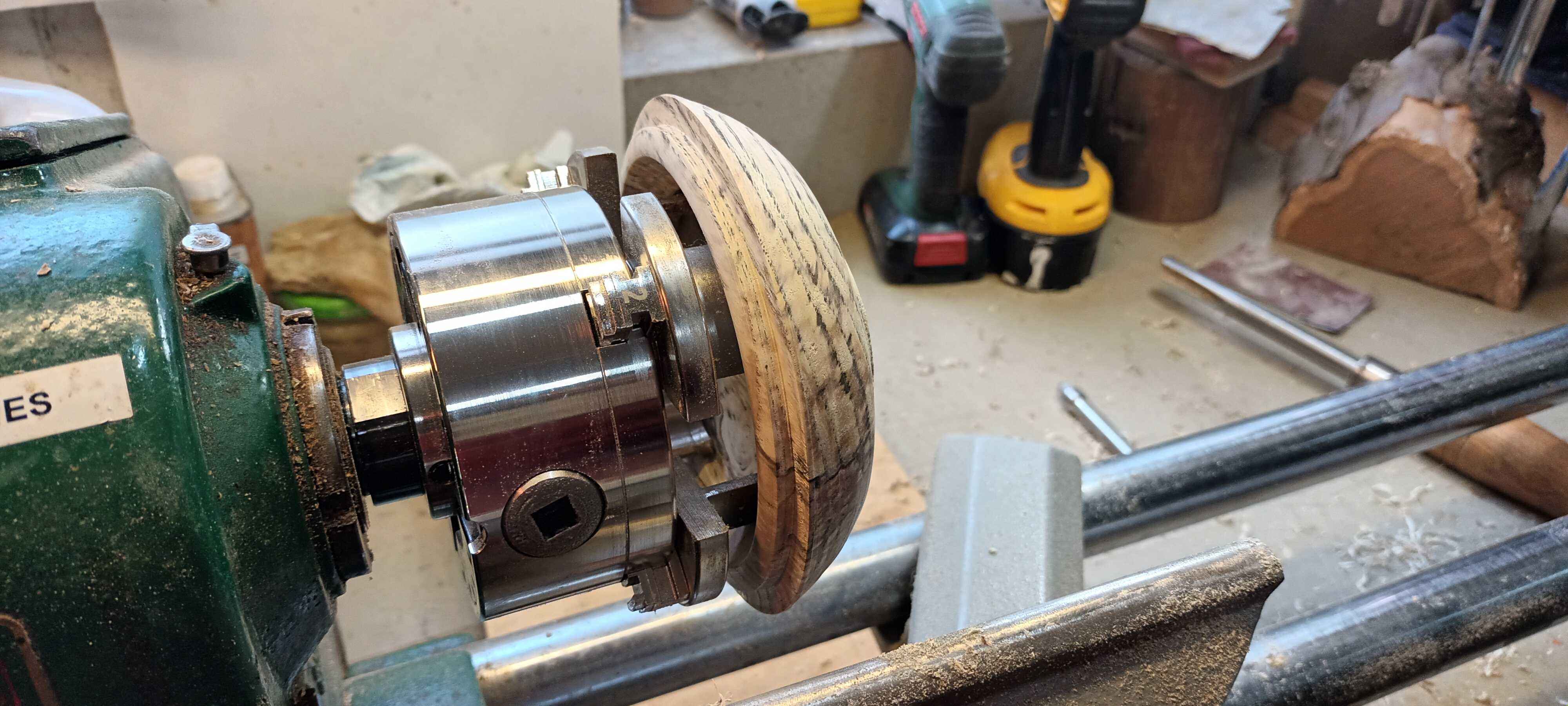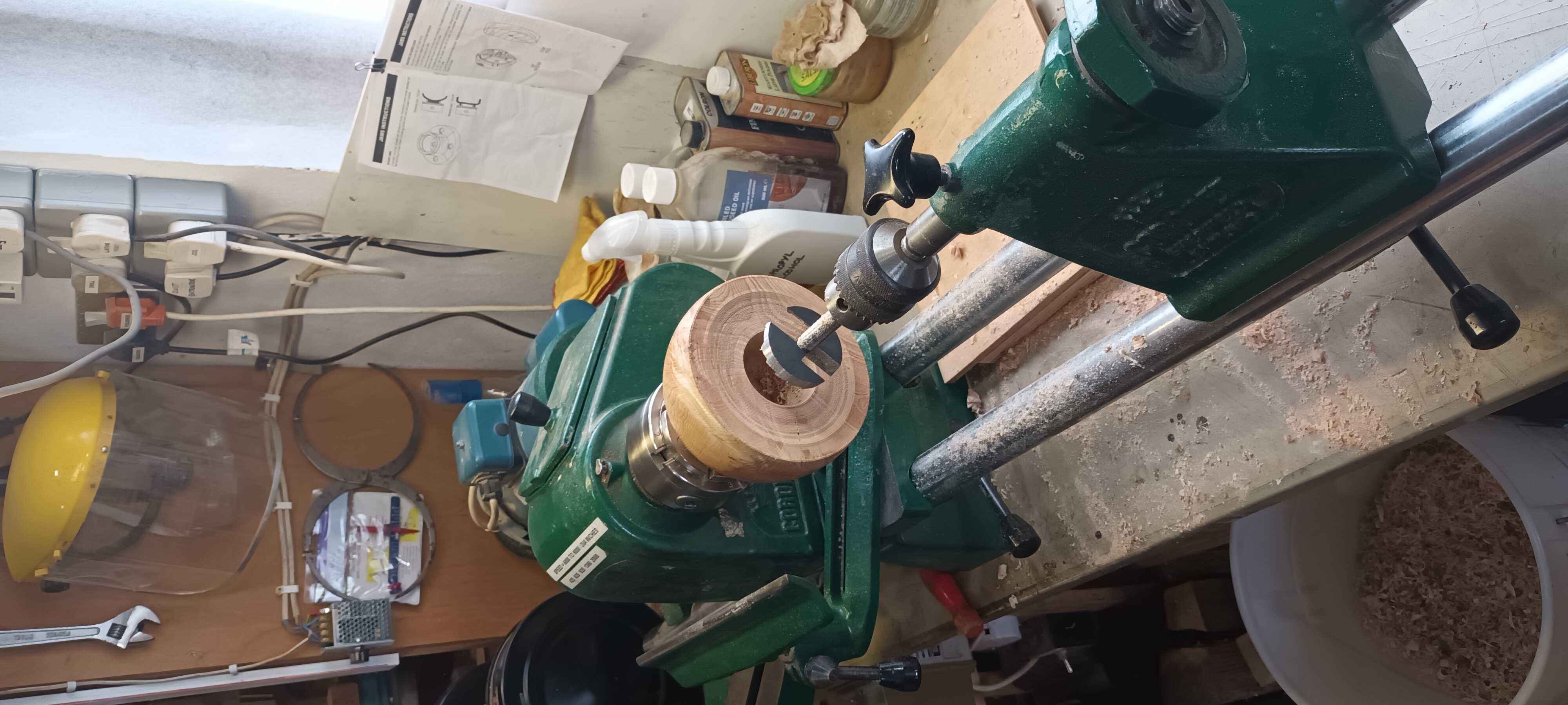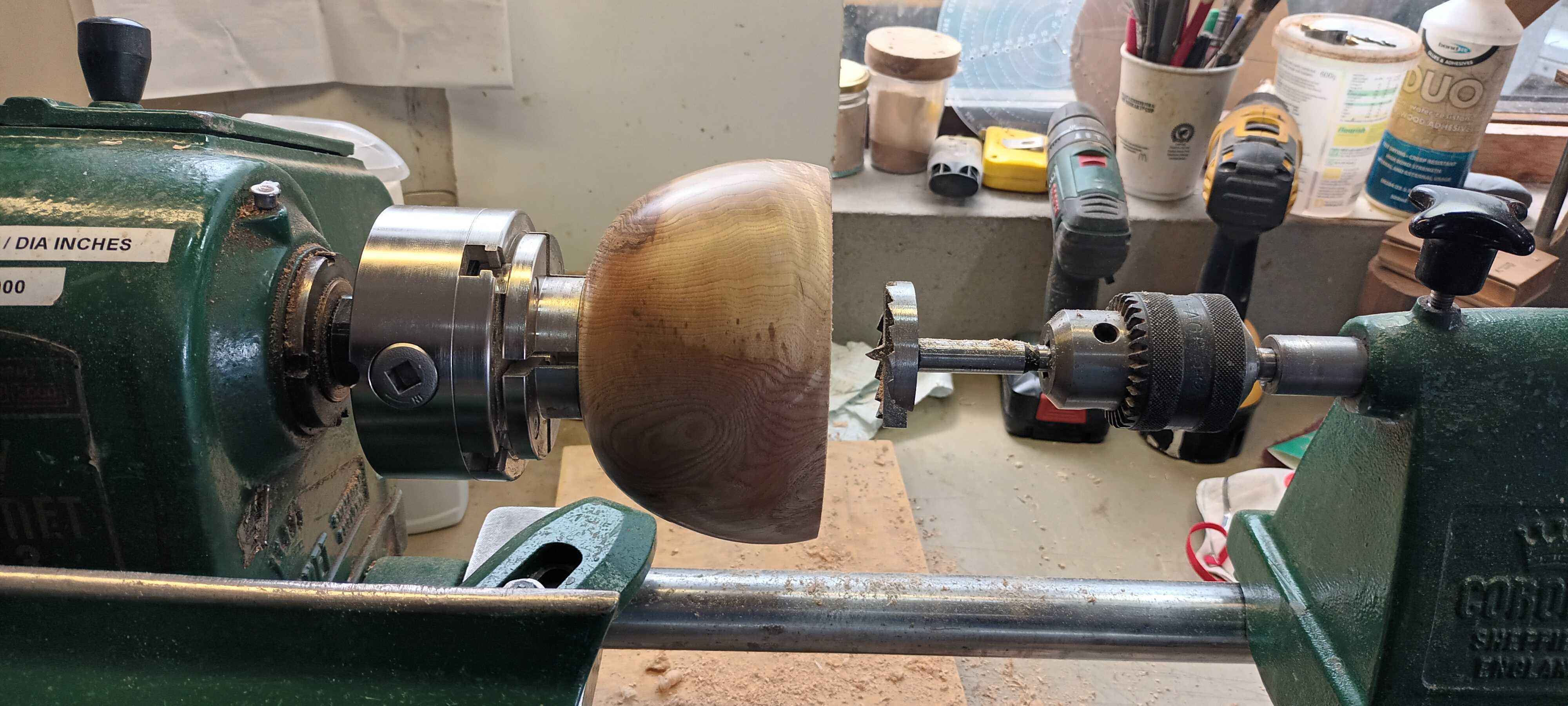 I had a piece of poplar cut into a rough hexagon with the chainsaw which was deeper than my normal blank, as mostly I cut slabs two to three inches (50 - 75 mm) thick that fit my bandsaw. I decided to try a bowl that came in quite a bit at the top, and having done that I felt it needed a lid.