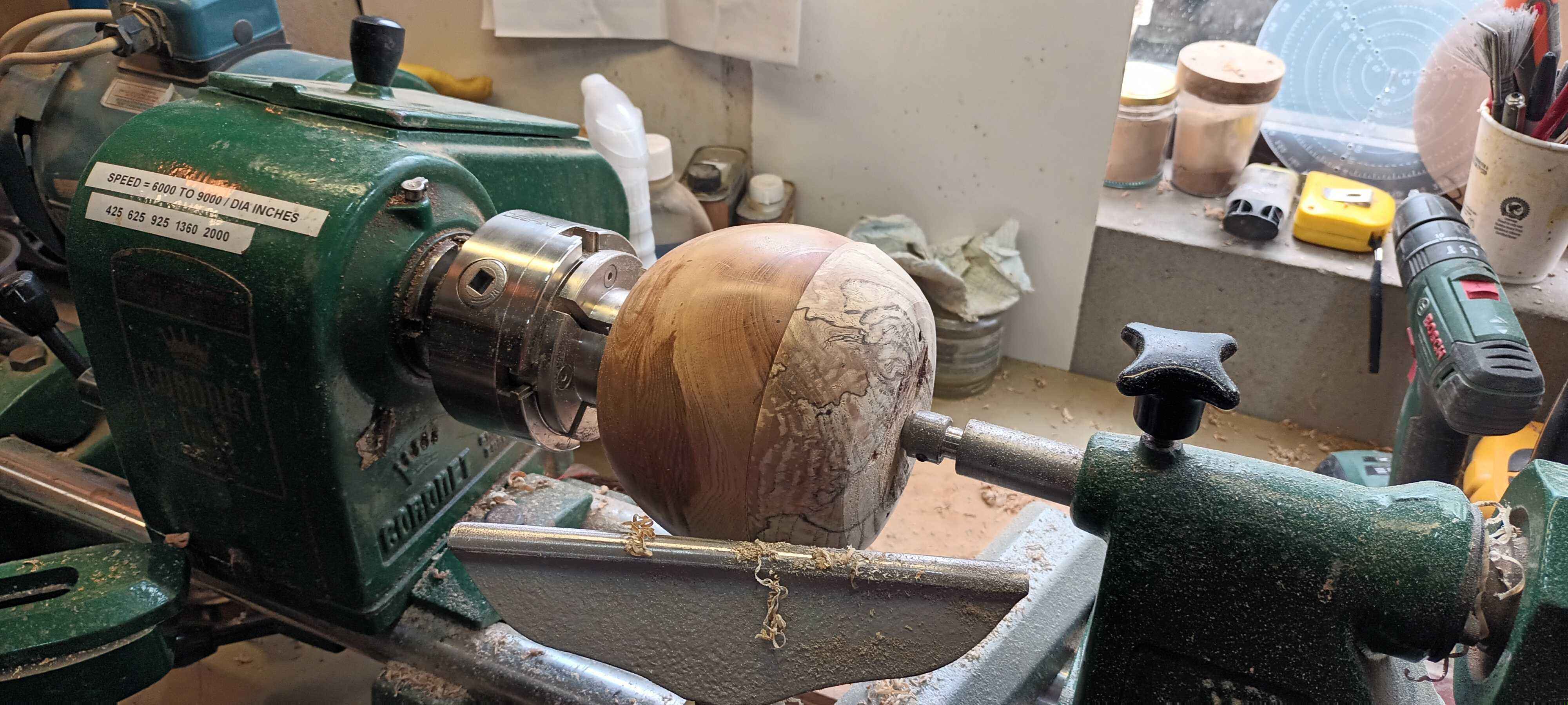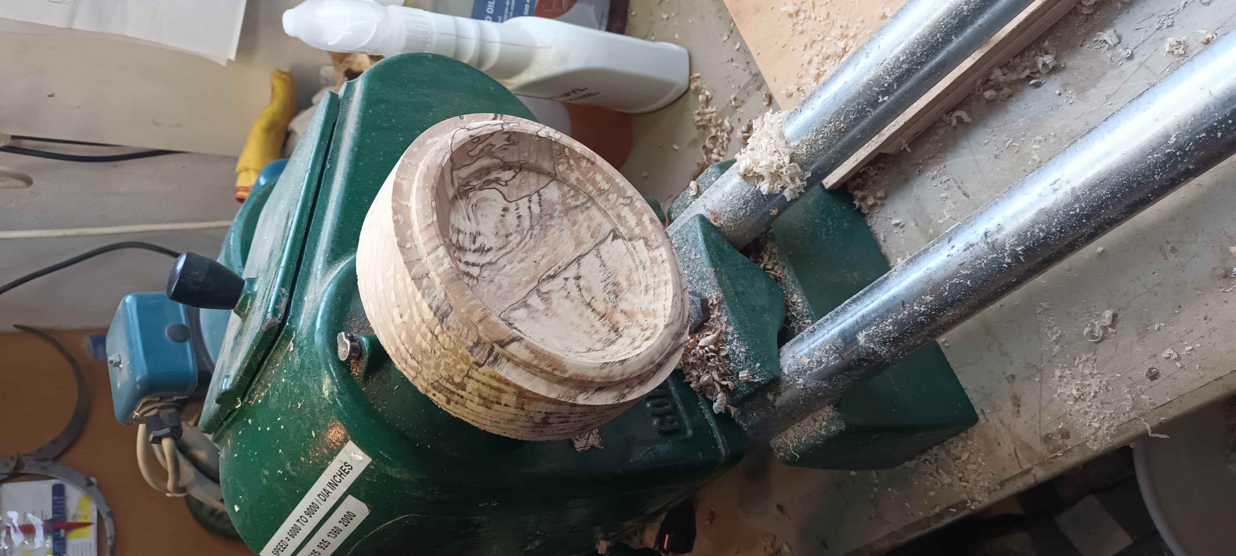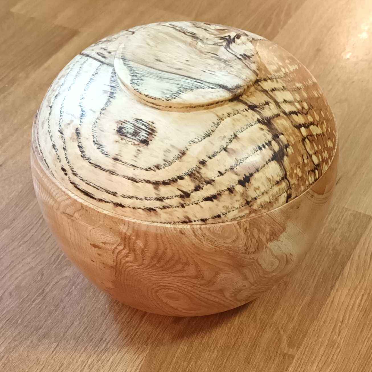 I chose a piece of highly spalted poplar for the lid which gives a dramatic contrast. Both lid and bowl will change shape slightly, that's the nature of wood, so the fit isn't perfect. When I have some well seasoned stuff I may try one of those.