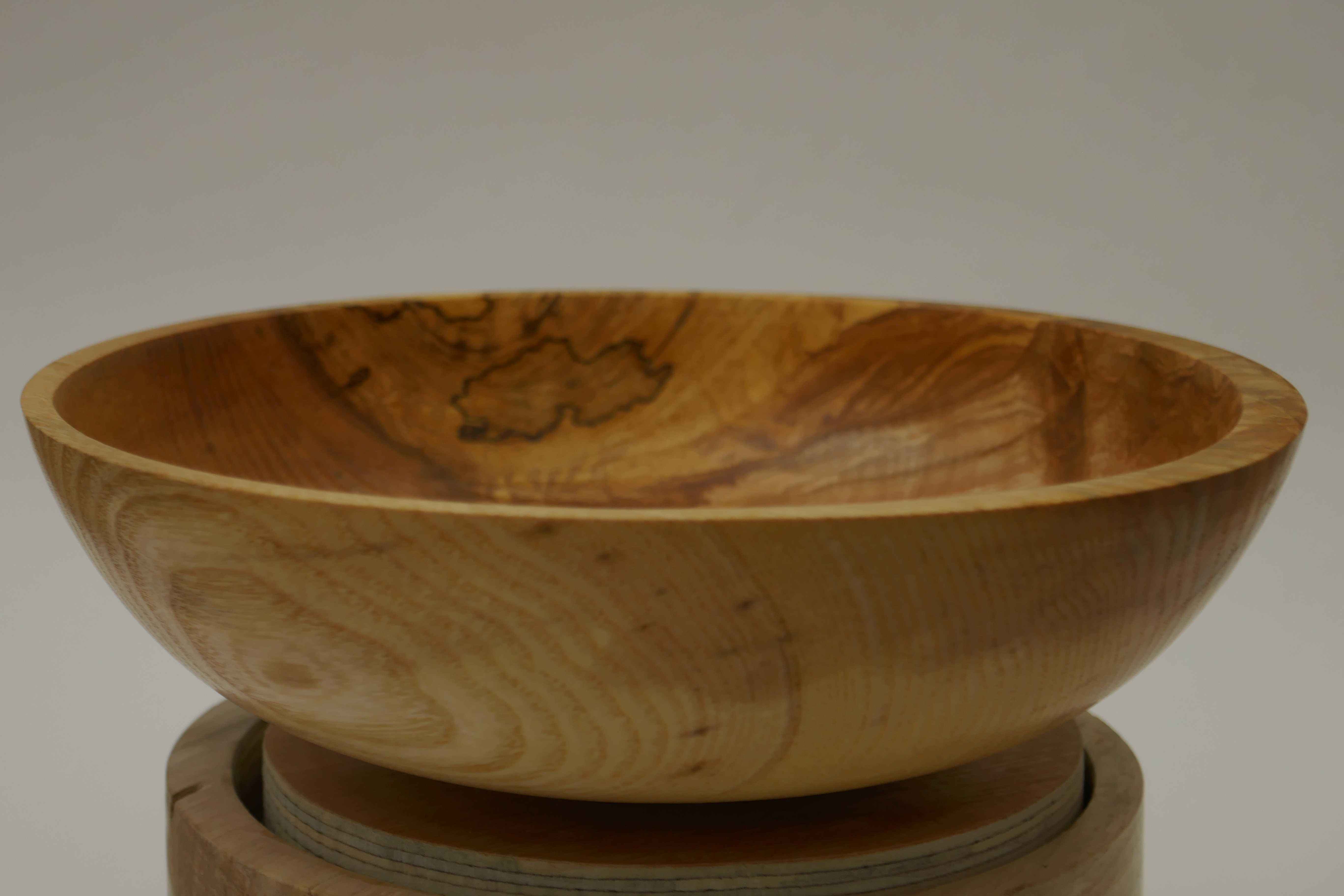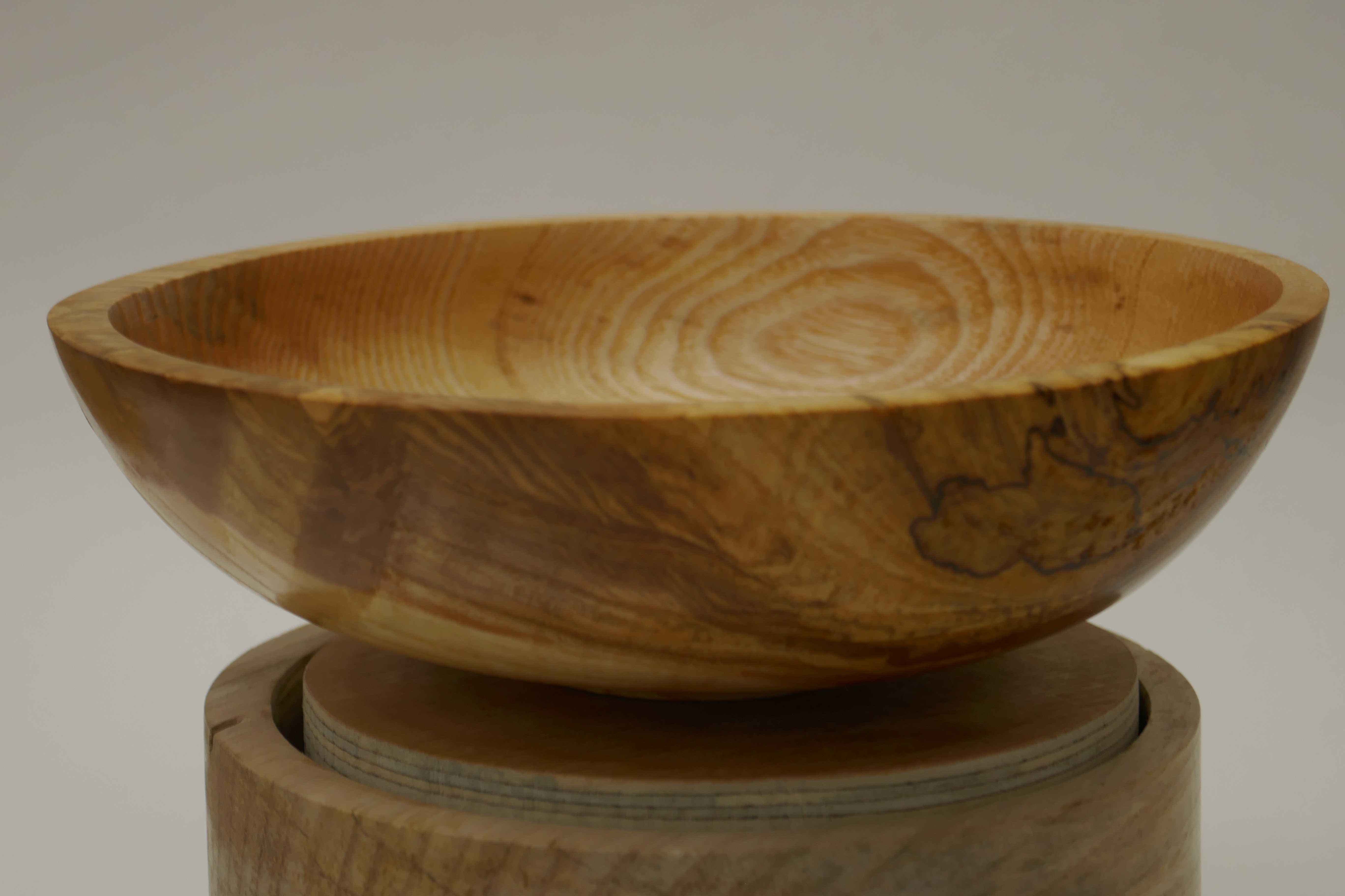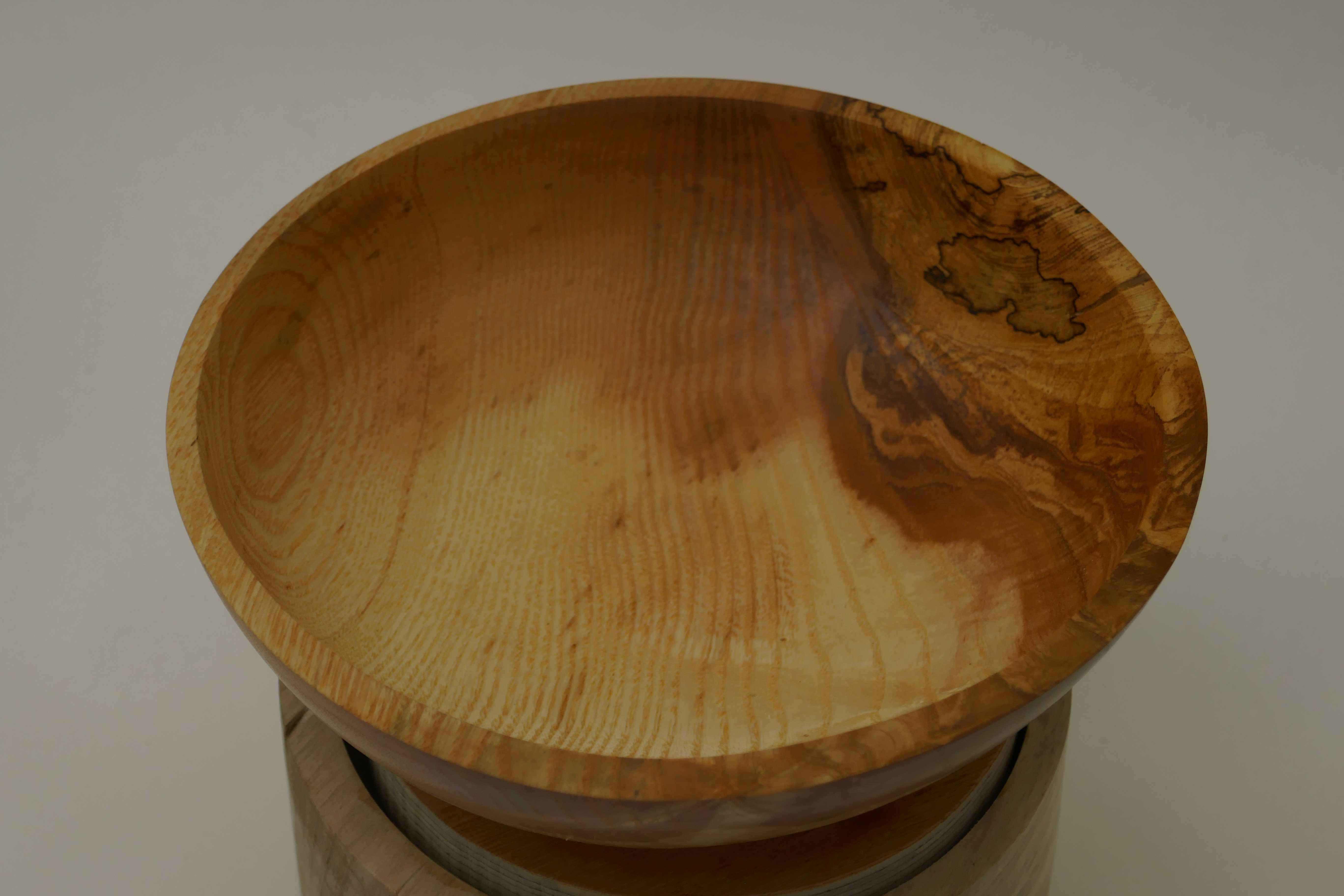 A little spalting on the edge. This one moved so much during turning that the inside is not concentric with the outside! The finish of boiled linseed oil and beeswax is foodsafe.