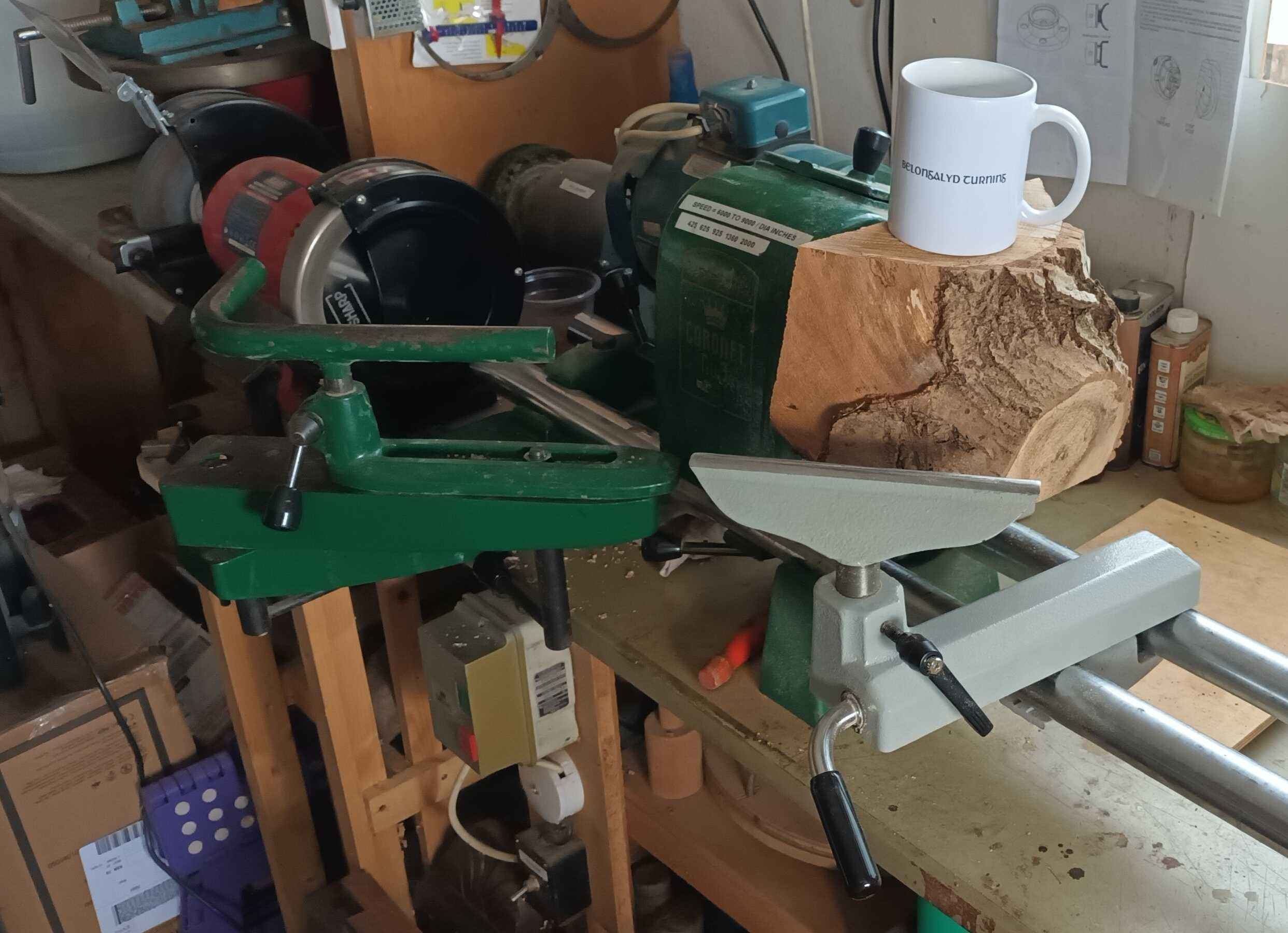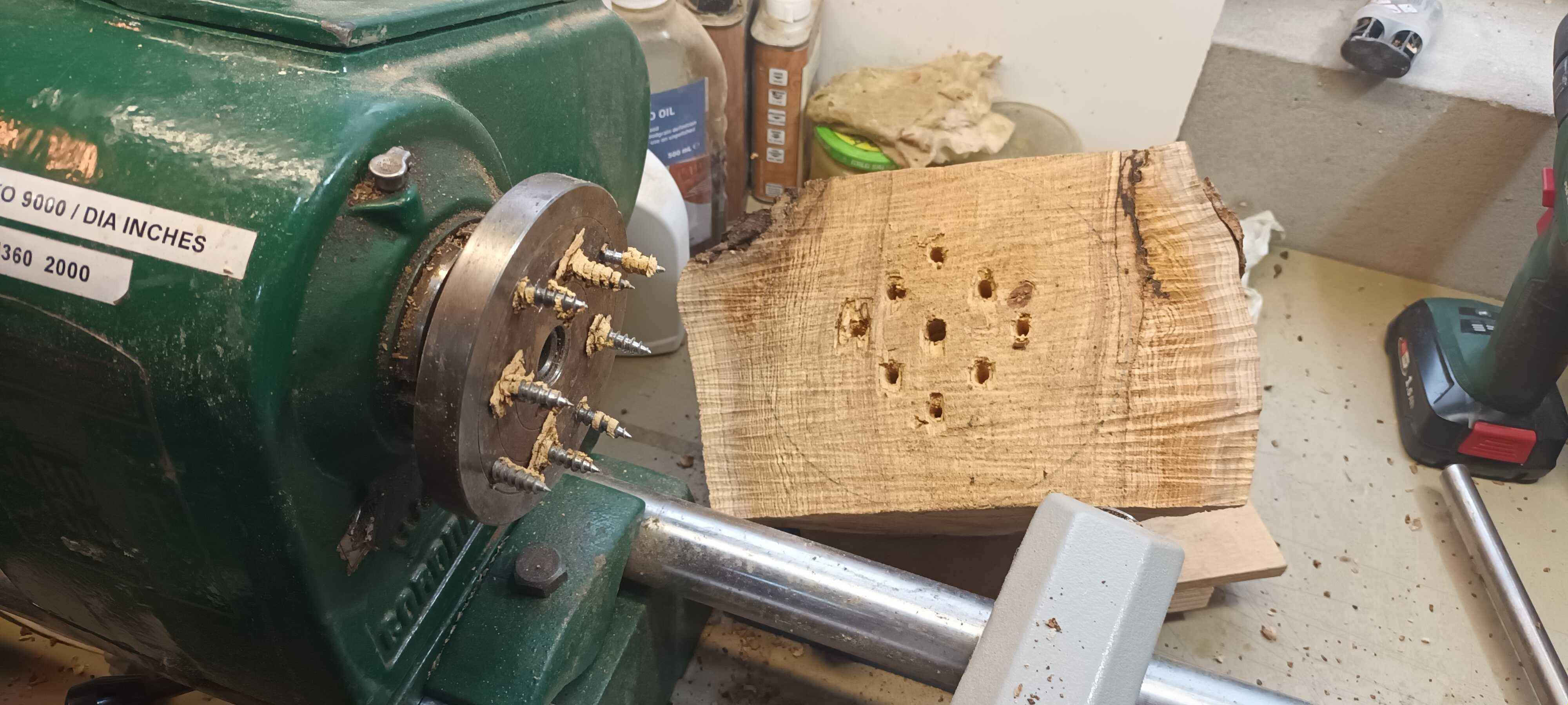 As I started to turn this piece it quickly became clear that it would be troublesome as the wood next to the face plate which would become the top of the bowl was rather soft, and in fact the entire piece leapt off the lathe onto the bench. I attached a larger face plate which has better leverage as well as allowing the screws to go into some sturdier wood and started again.
