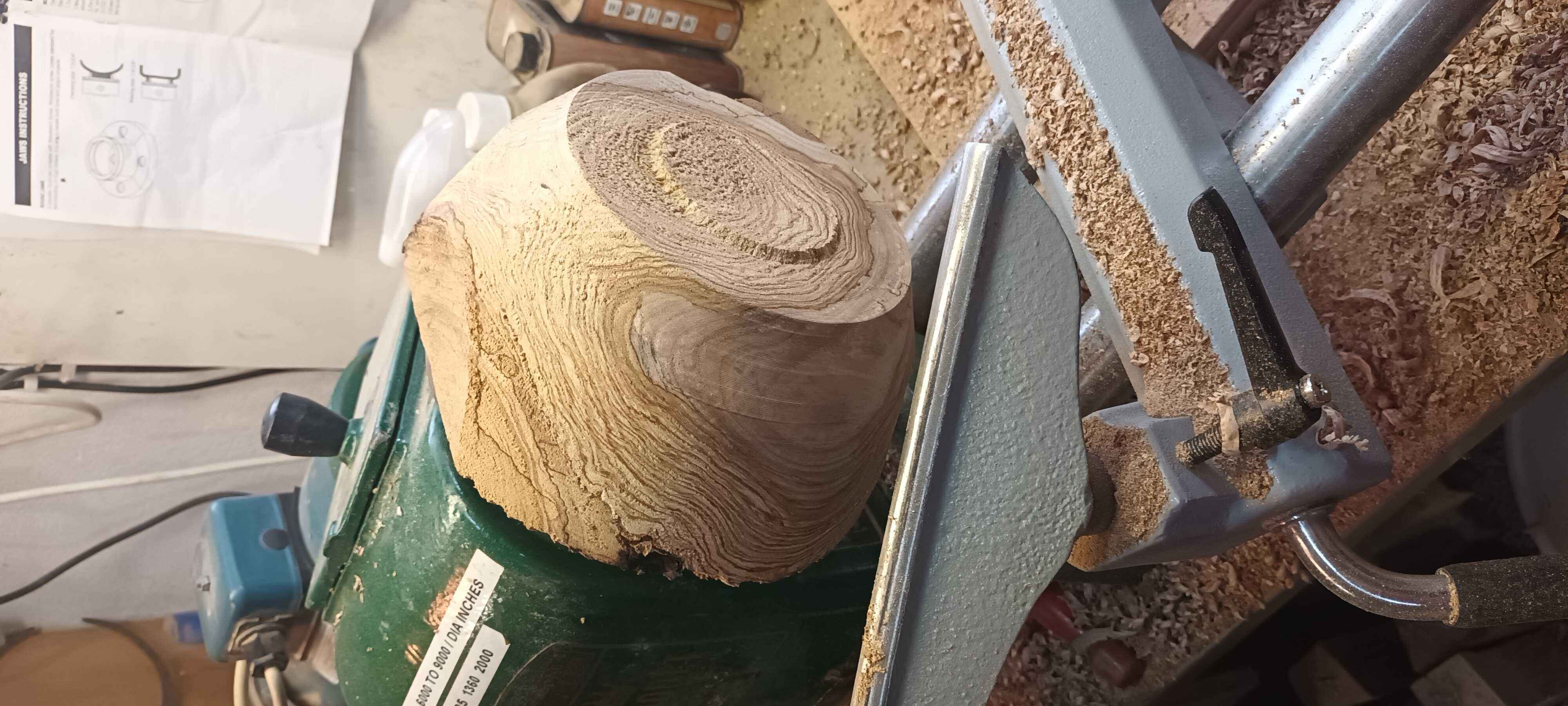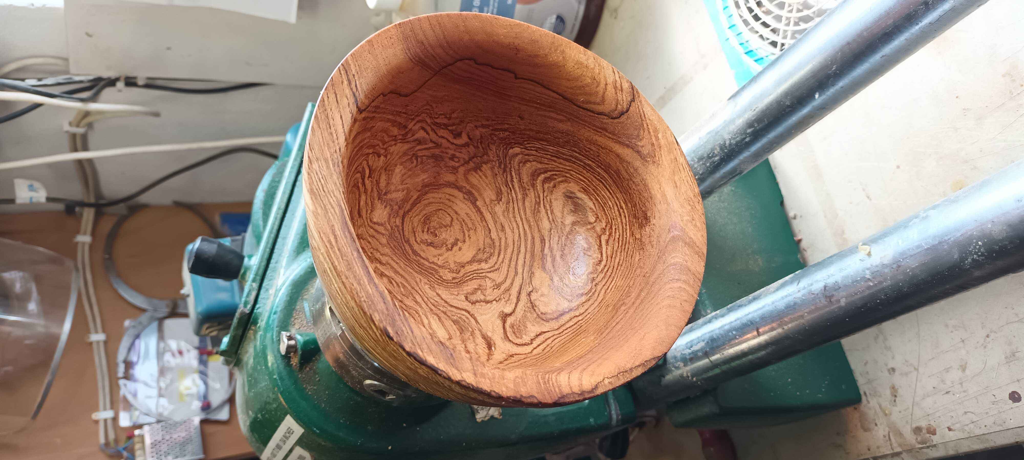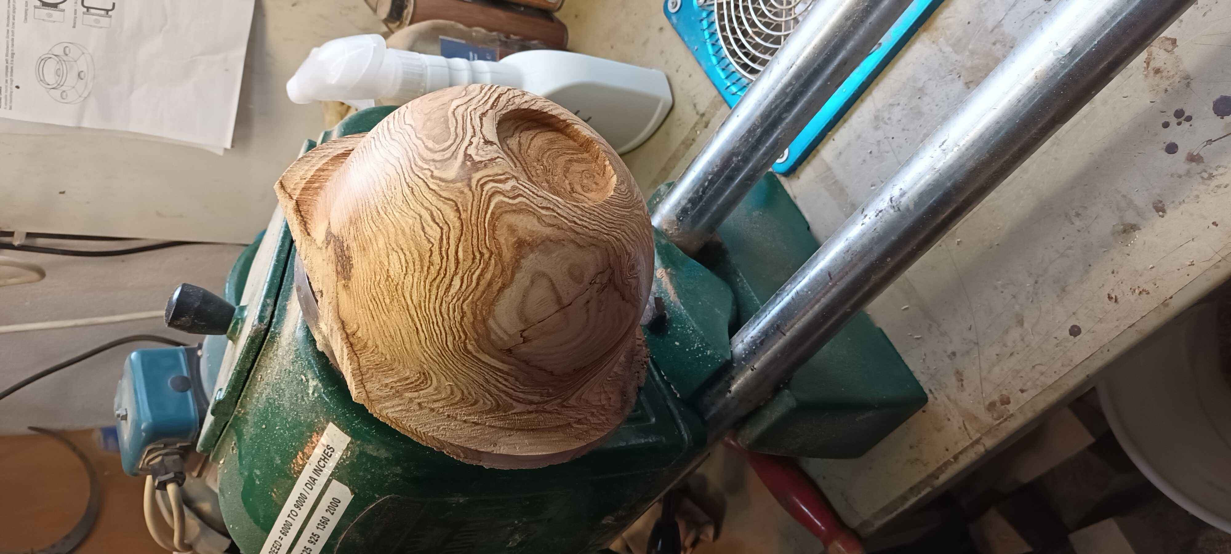 The rim was a bit accidental as I didn't want to cut too near the face plate (turning mild steel with my expensive bowl gouge is not a good idea) and when I turned it round it had change shape already. Most bowls do this to some extent as removing wood relieves stresses, but semi-seasoned pieces are especially prone to it. I managed to clean out a good part of the interior with Forstner bits, trying to put as little pressure on the foot as possible, and then finished the hollowing with scrapers.There is heavy spalting and fantastic grain patterns, but those grain patterns mean there's no uniformity in the grain, so using a gouge can get exciting. Gouges don't cut well against the grain, and the wood here is fairly soft and rather prone to tear rather than cutting.