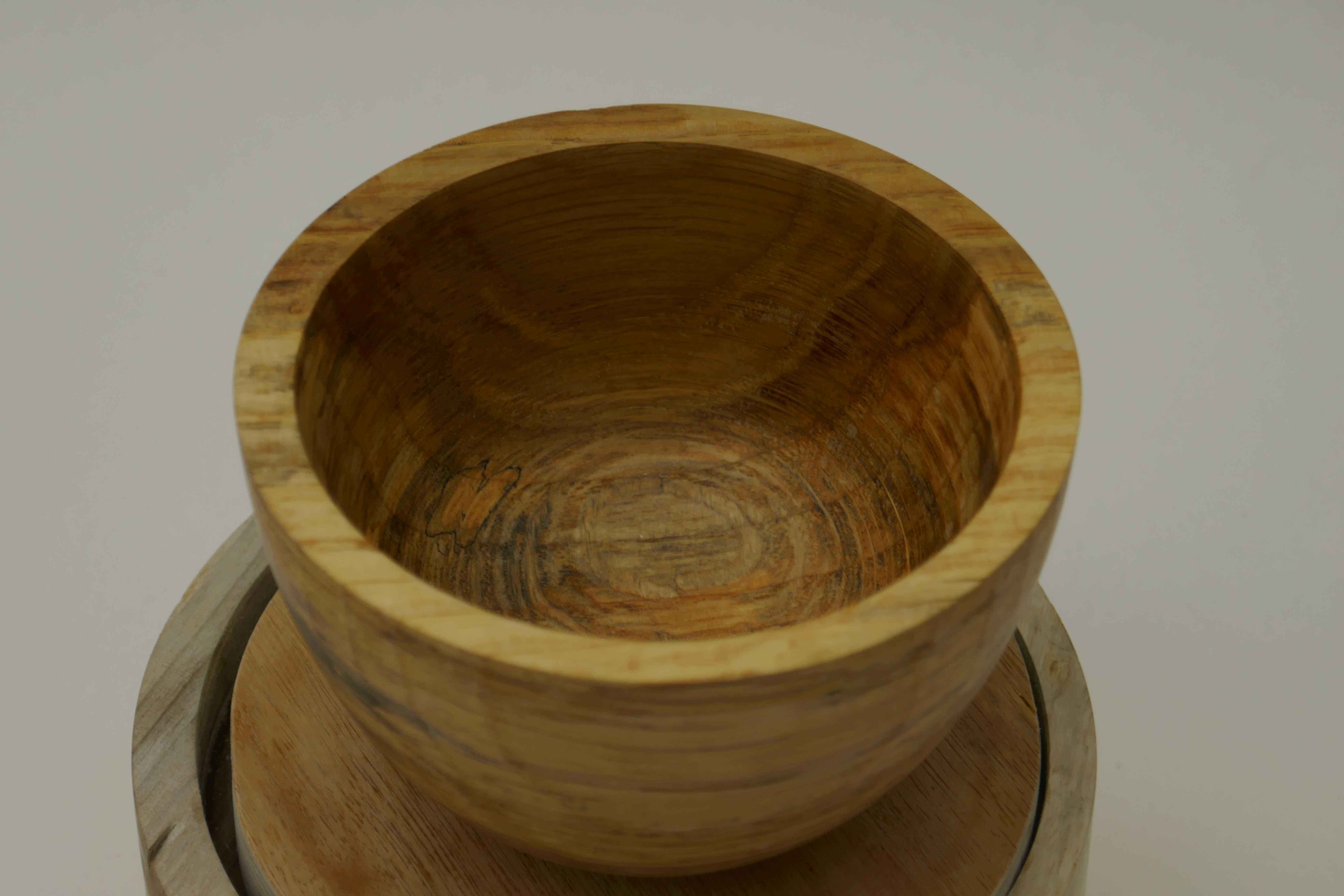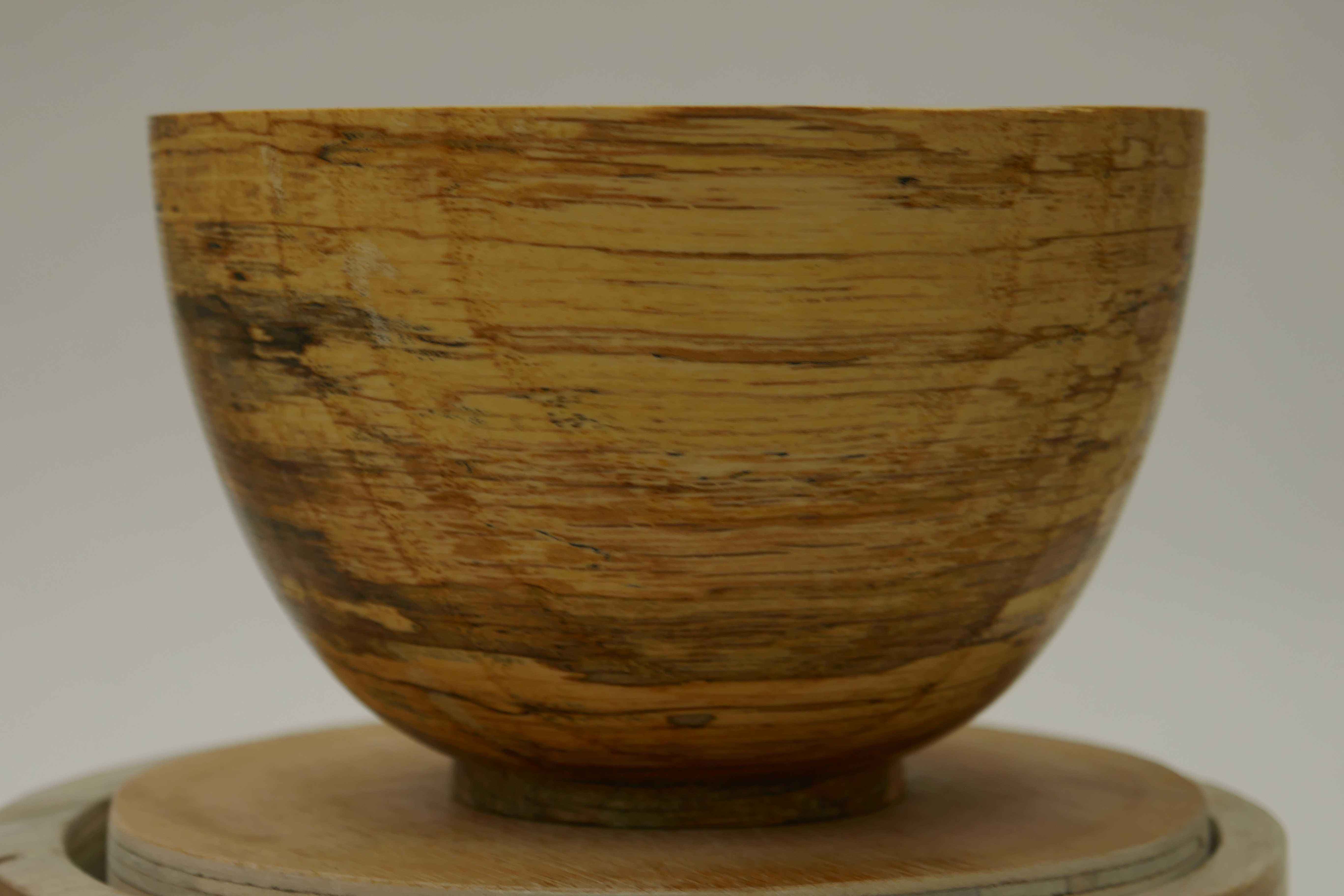 Wood that has fallen will sometimes have interesting colouration caused by fungii known as spalting. This can be simple colours such as yellows, pinks and purples, or the more classic black lines which is a mineral deposit. The dried wood is quite harmless to humans. The spalting adds a level of interest to the visual bowl, and each piece will be as unique as a fingerprint! This bowl hasn't got the strong black lines, but the differing colours of spalting provide a nice contrast.
