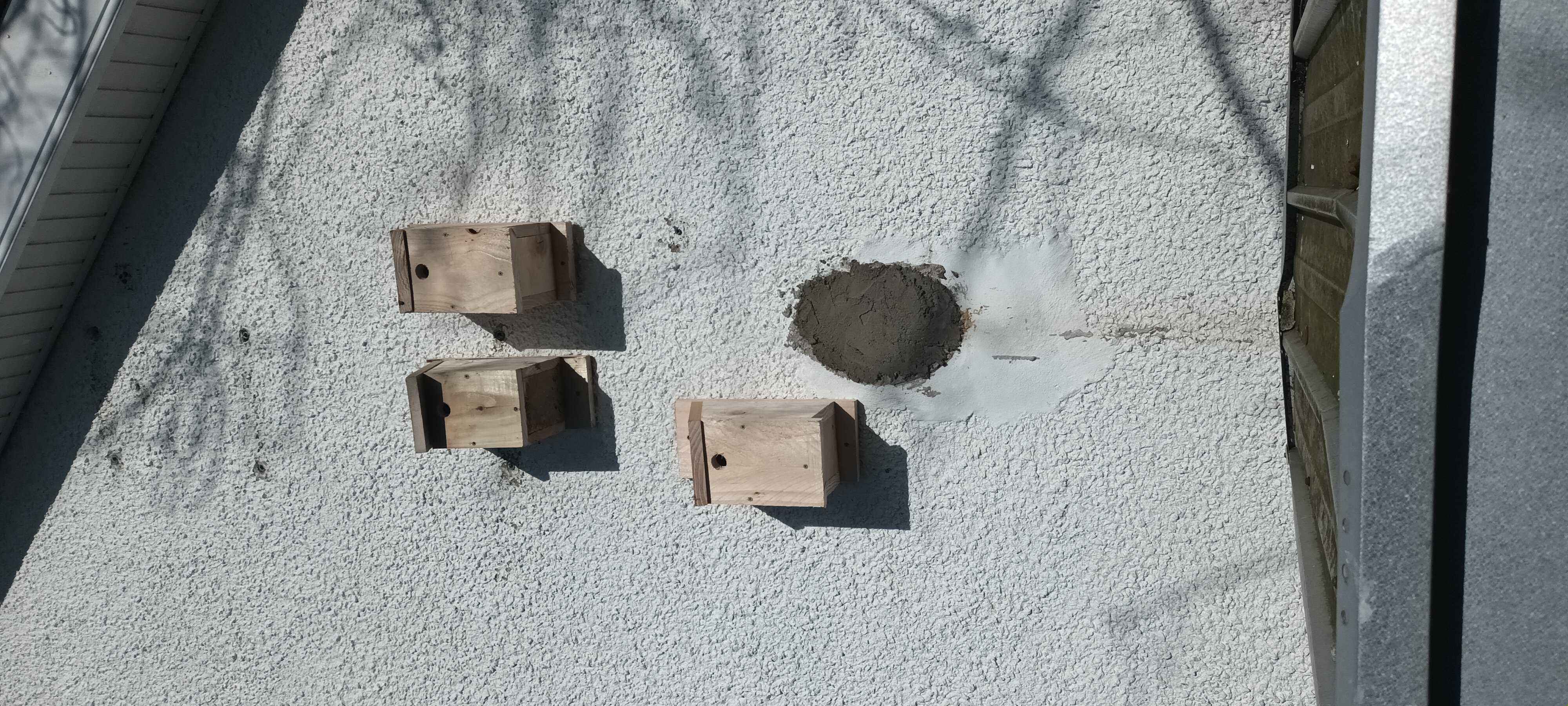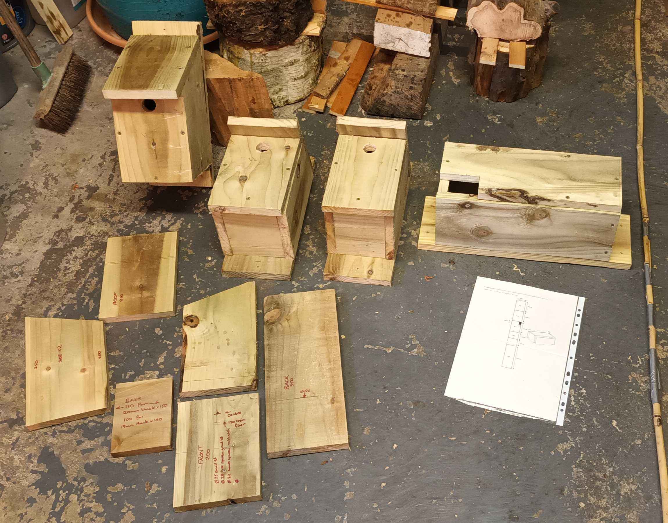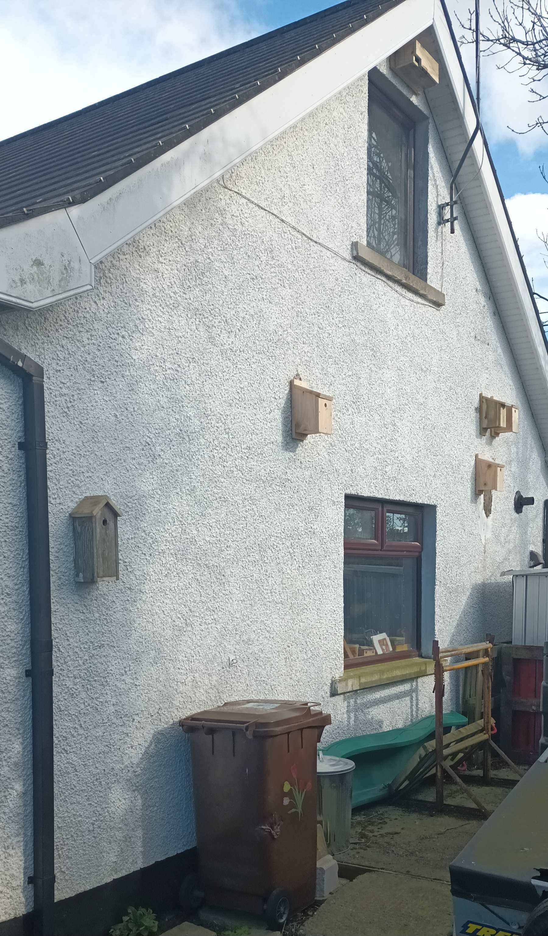 I built some bird boxes from offcuts of wood from making a veranda for my daughter's playhouse. I needed a few more, so I bought some 150 mm x 25 mm four meter lengths of framing timber (untreated) from the local woodyard which were perfect, except I should have cut the roofs slightly longer to give a bit more overhang. The thicker wood gives better thermal stability. The jury is out on whether pressure treatment is bad for birds. On the gable I have tried to make a "sparrow terrace" for tree sparrows, although I am not sure anyone has moved in. Starlings are using the martin box at the top of the gable!