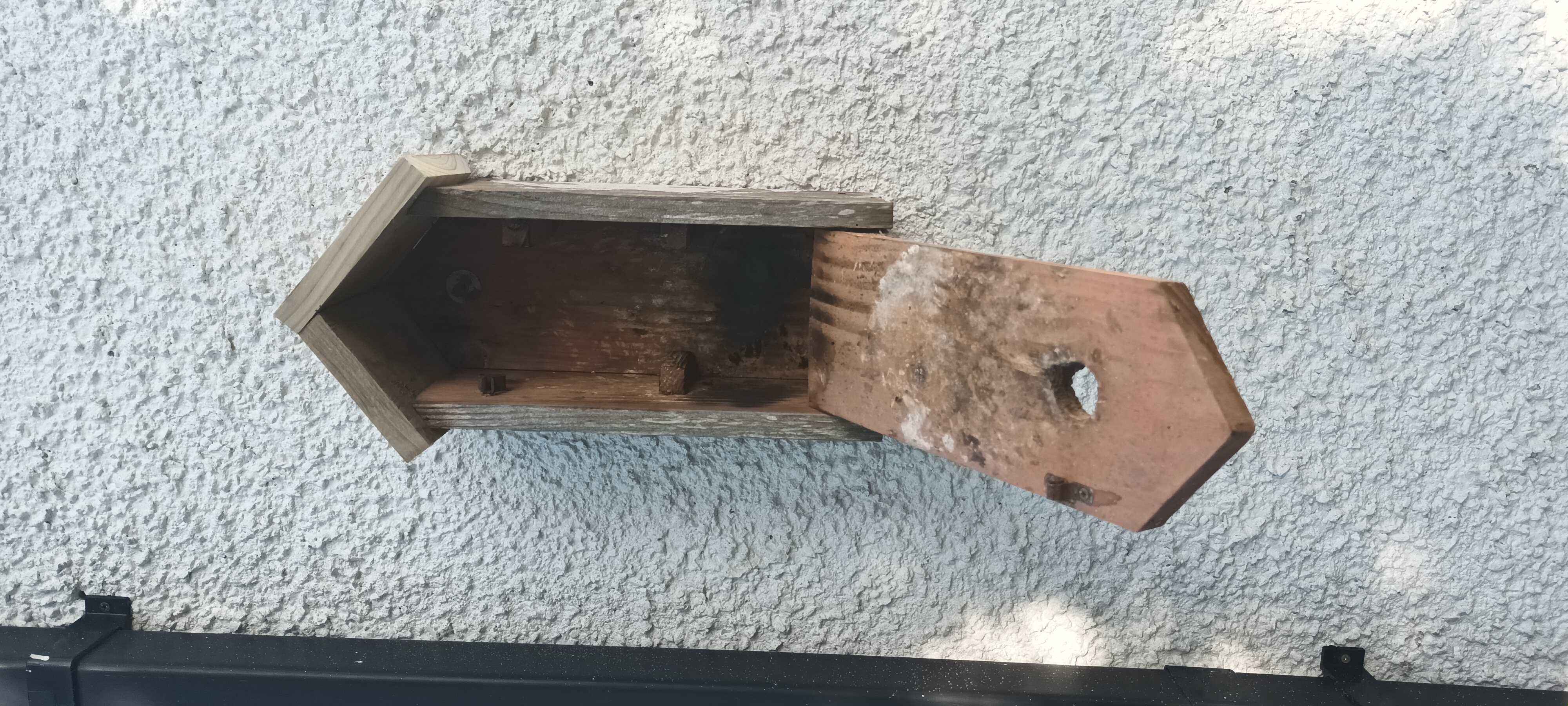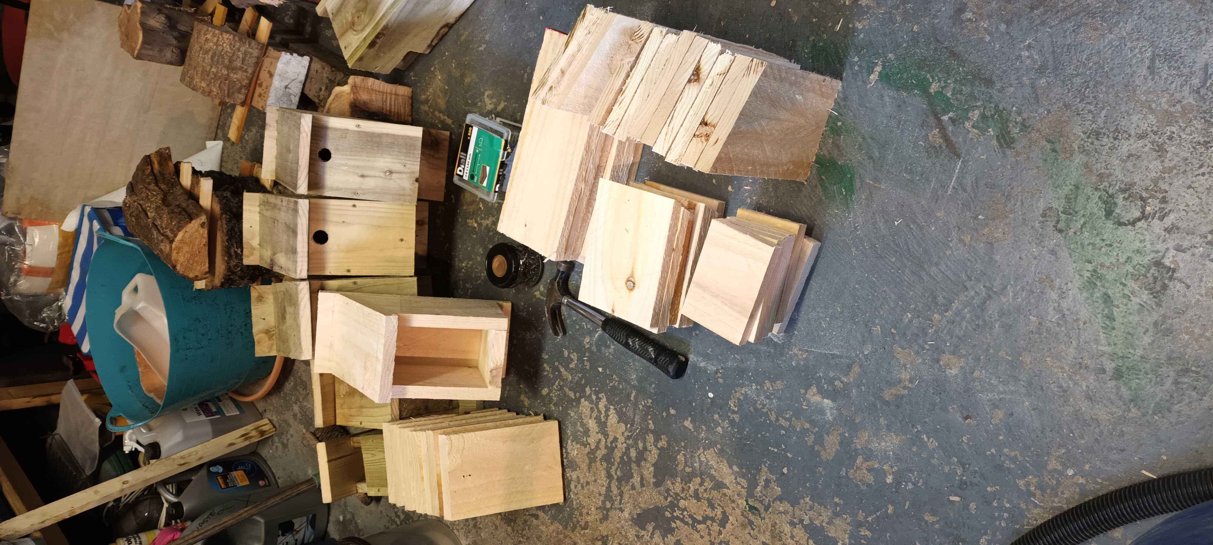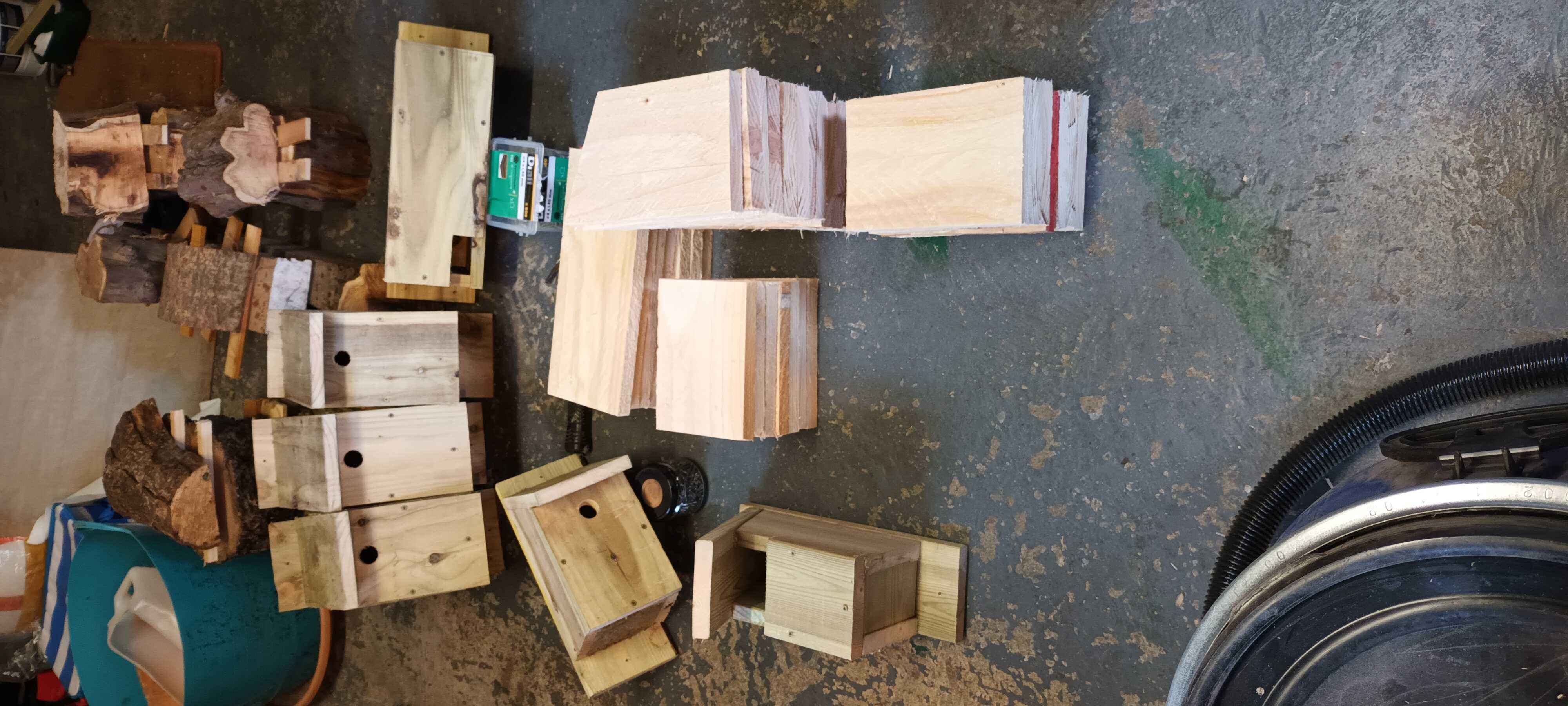 I built some bird boxes from offcuts of wood from making a veranda for my daughter's playhouse. I needed a few more, so I bought some 150 mm x 25 mm four meter lengths of framing timber (untreated) from the local woodyard which were perfect, except I should have cut the roofs slightly longer to give a bit more overhang. The thicker wood gives better thermal stability. The jury is out on whether pressure treatment is bad for birds. On the gable I have tried to make a "sparrow terrace" for tree sparrows, although I am not sure anyone has moved in. Starlings are using the martin box at the top of the gable!