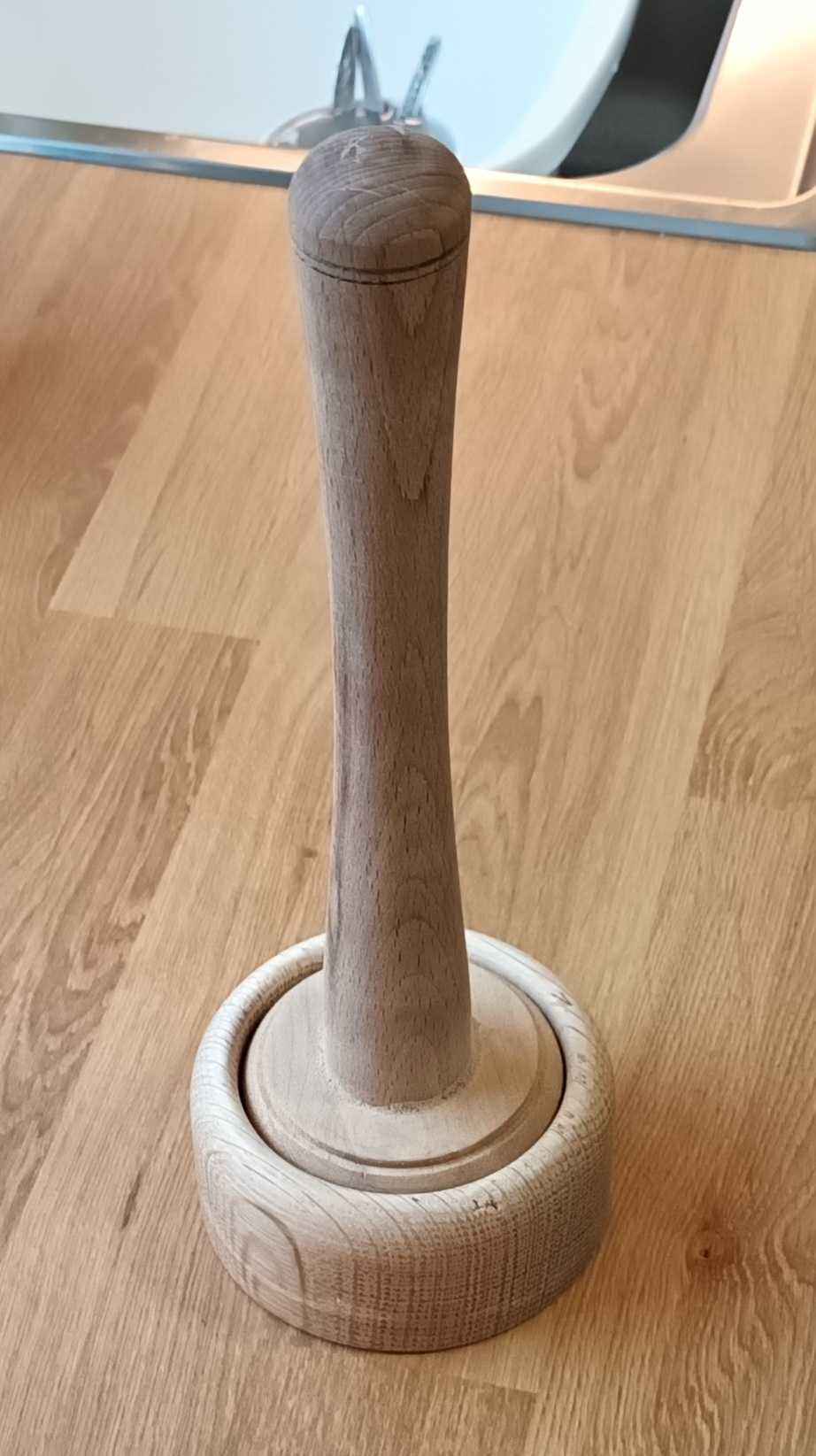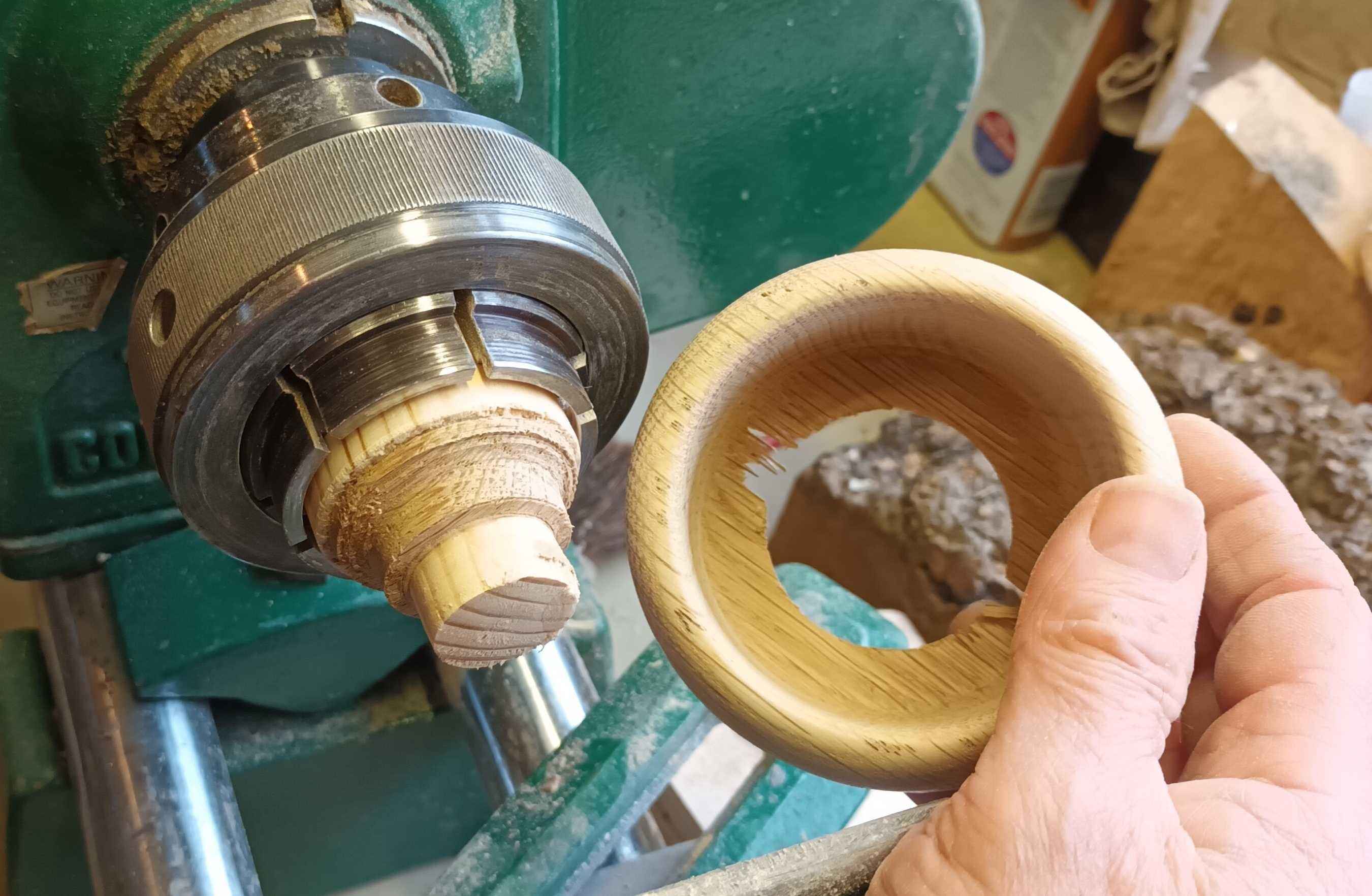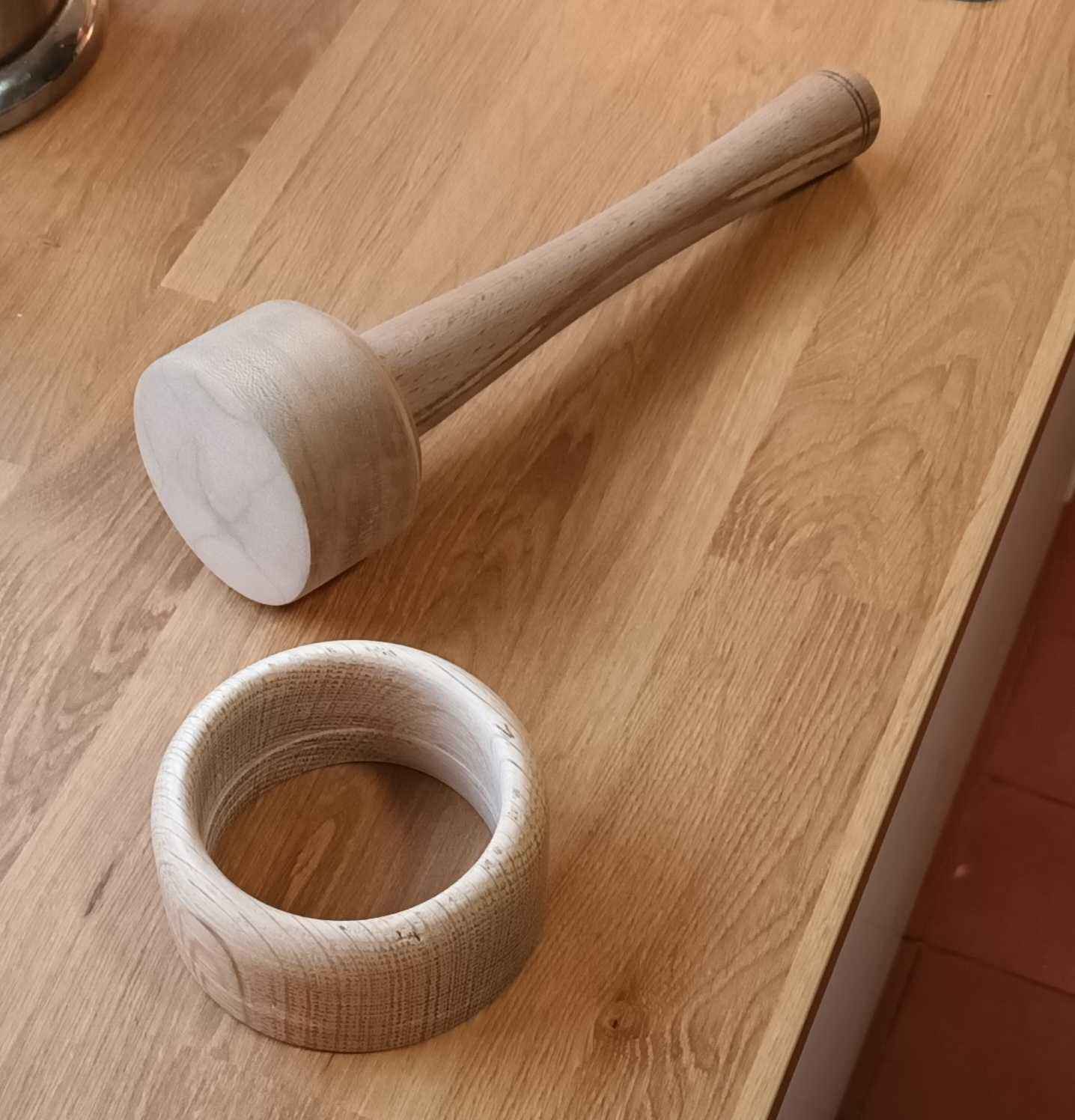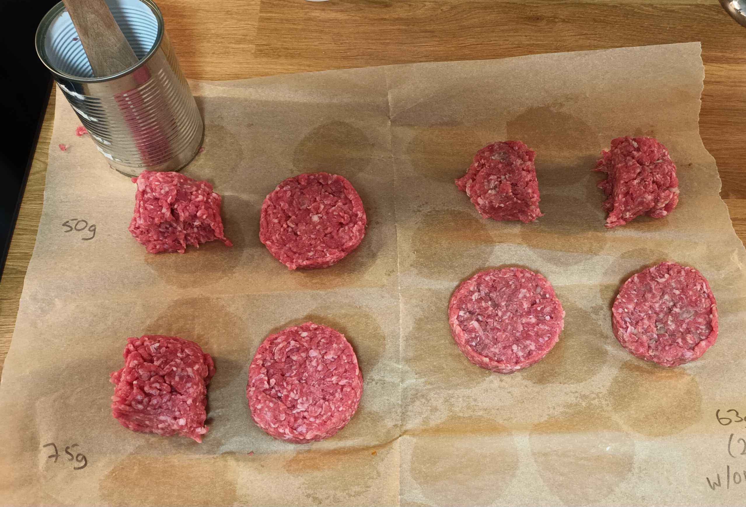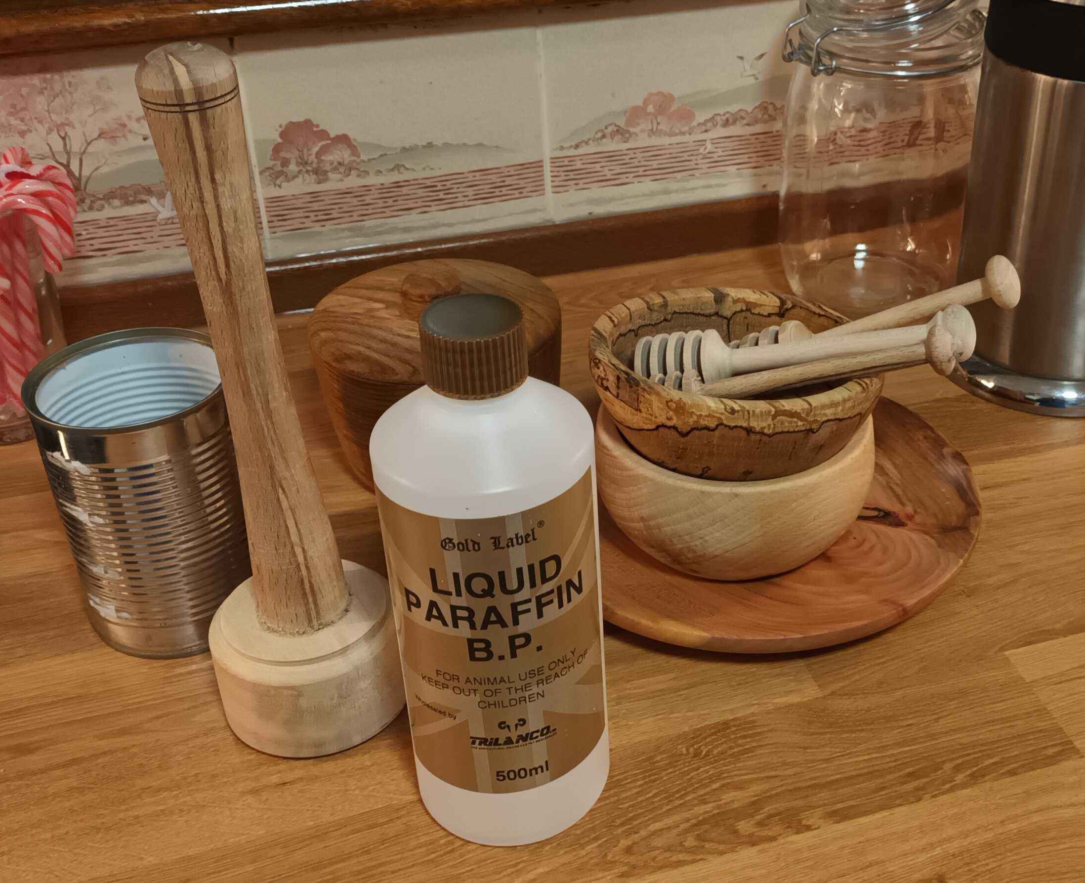 This makes really nice 3" 1.5 oz burges for barbeque at kids parties. The baked bean tin was a prototype, and the oak ring is the final model. Parafin oil BP can be obtained from veterinary suppliers for a food safe finish. On YouTube you may hear Americans referring to "mineral oil", and this is what they mean. Beeswax can be dissolved in hot parafin oil (e.g. over a bain Marie) to give more shine.