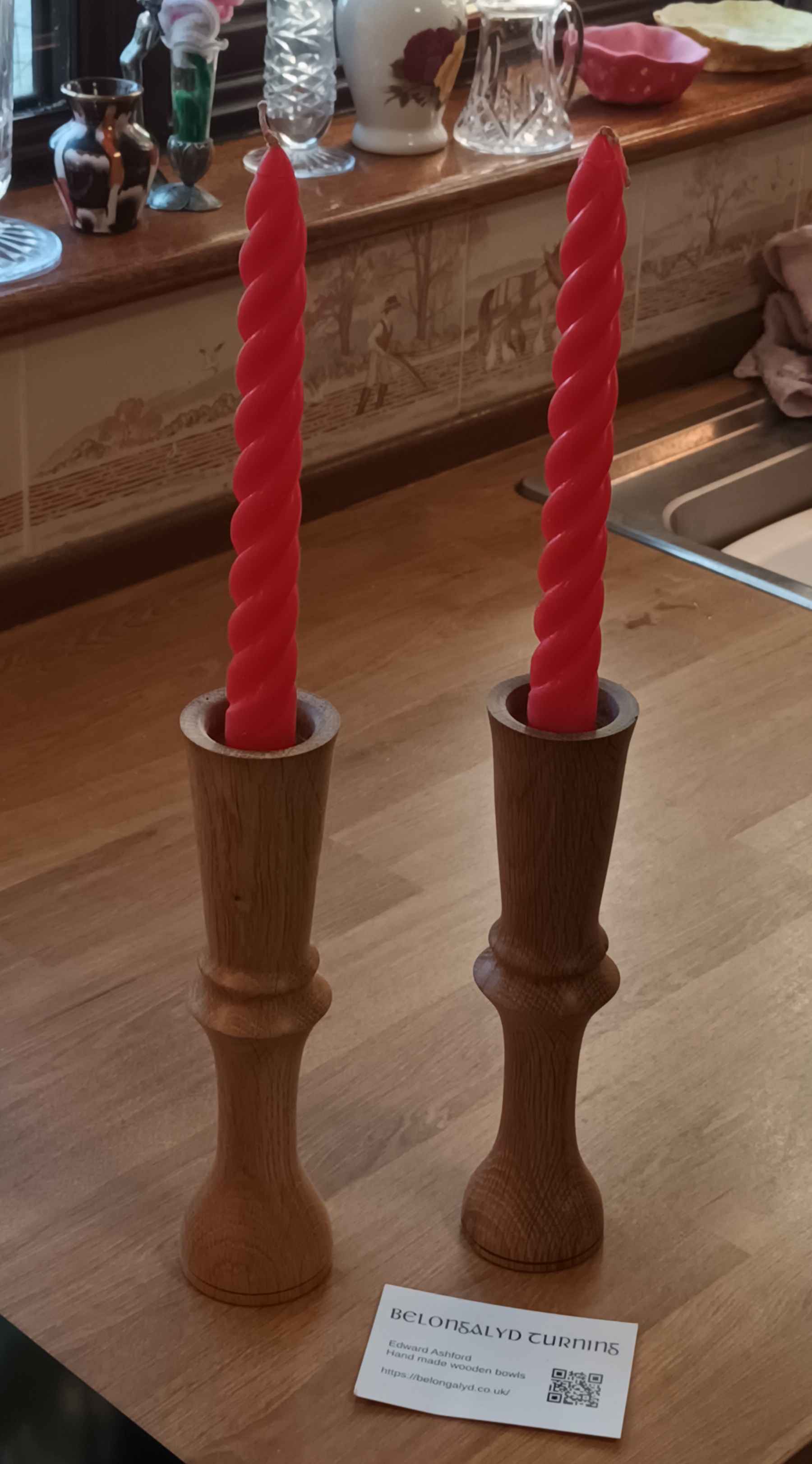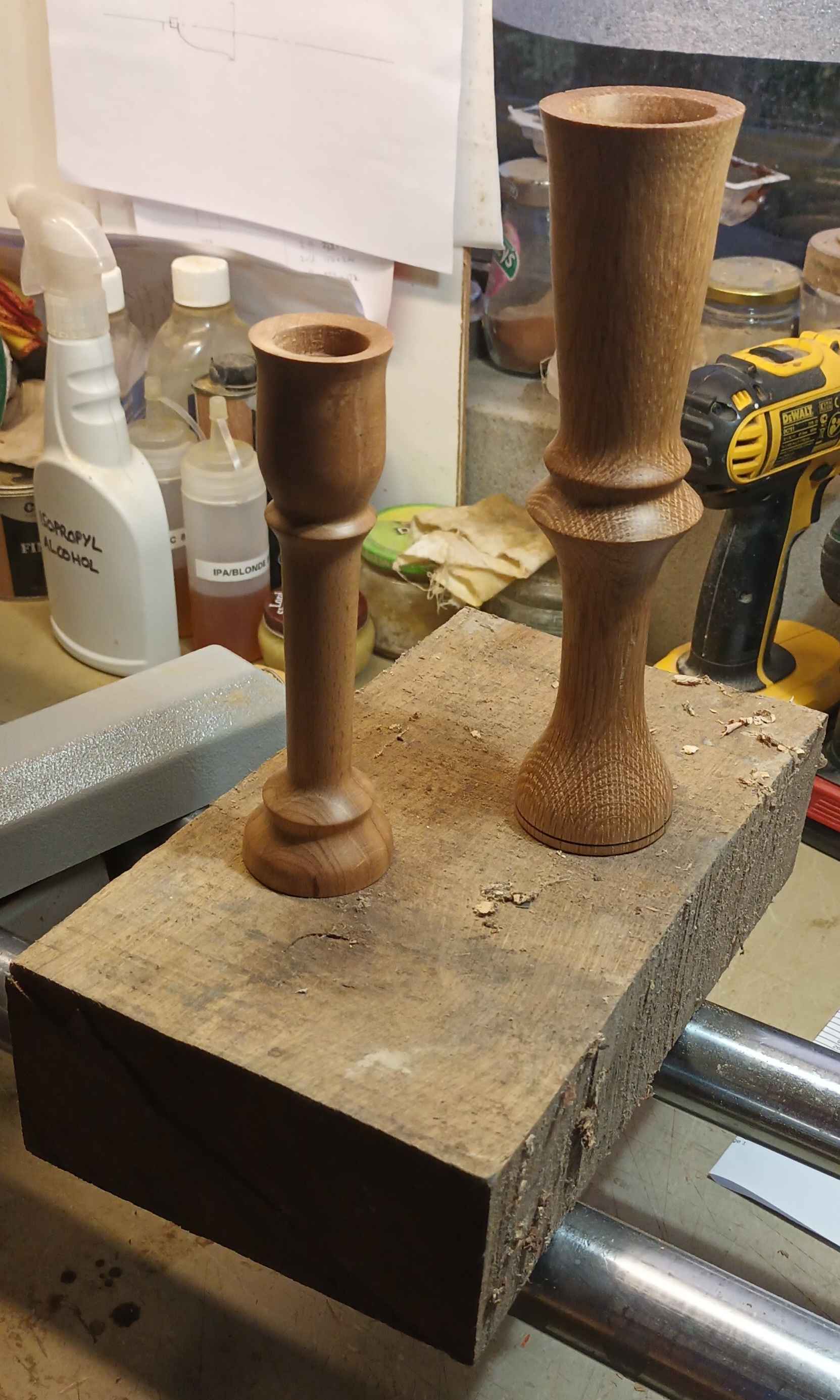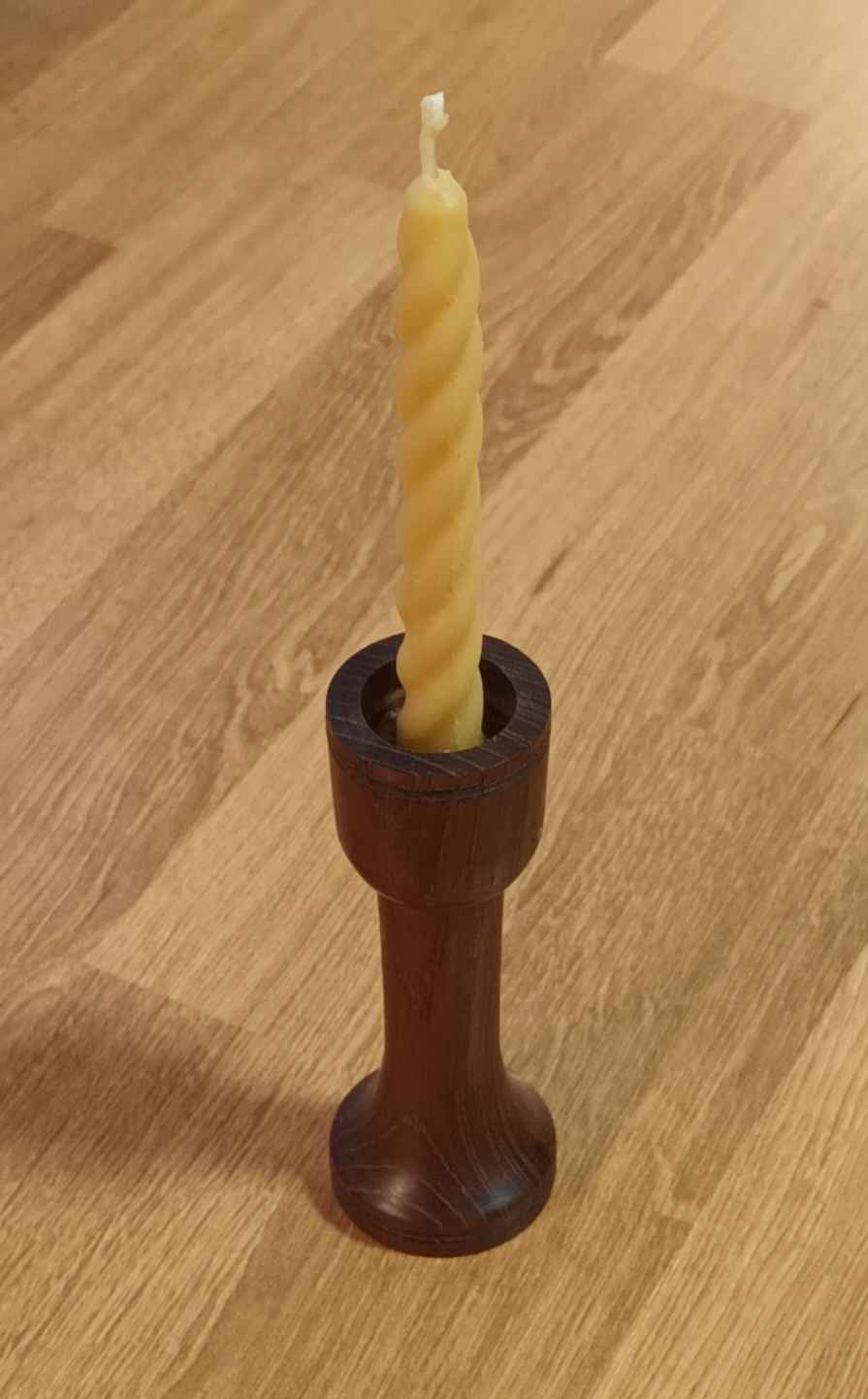 The small one is recovered teak, the medium one beech, and is supposed to look a little like a rose bud and is sized for the same small beeswax candles as the small teak candlestick. The large one is oak, and a lady was hesitating about buying it, and said she really wanted two. No problem I said, luckily I have another piece of oak at home. The second one is always harder, but all that practice making pawns for the chess set came in handy.