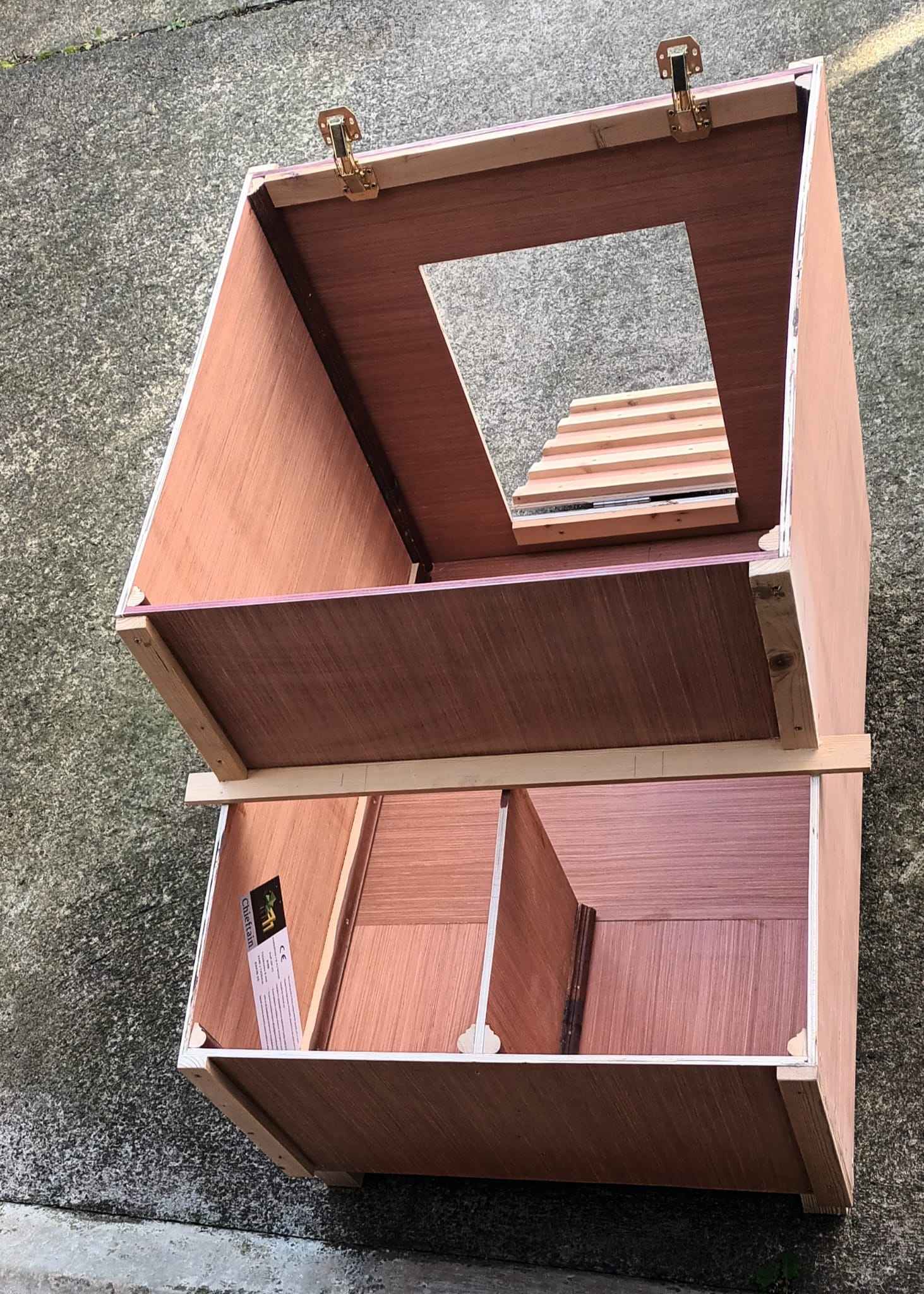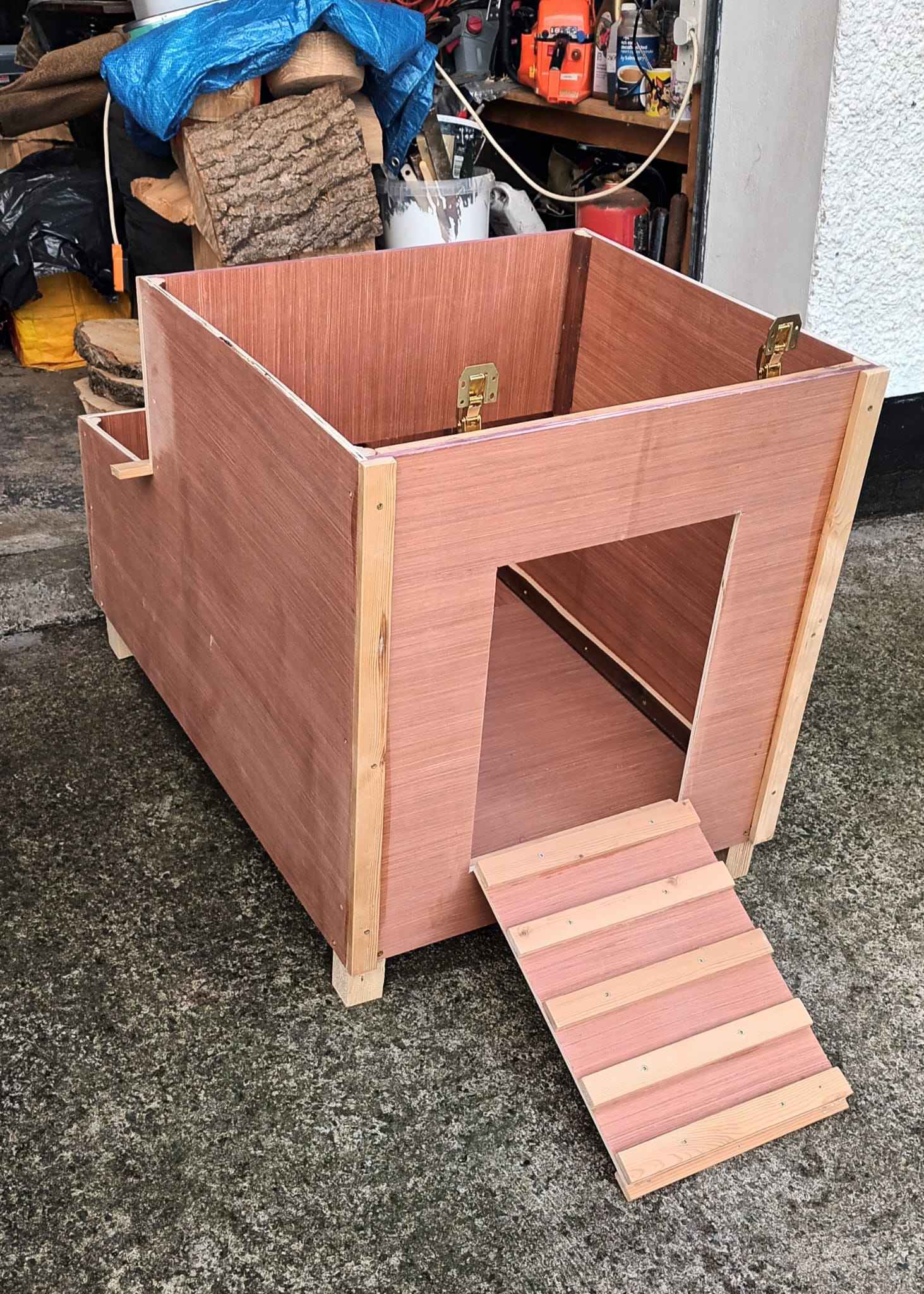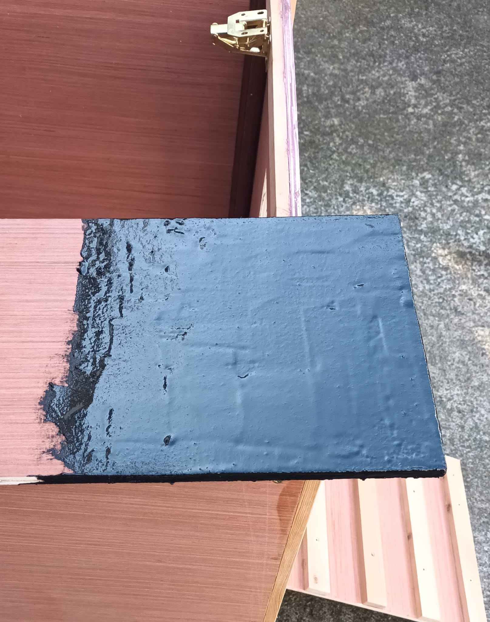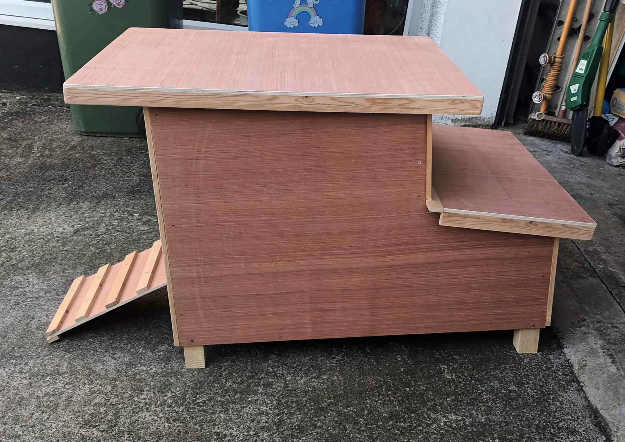 My neighbours asked whether I could make a chicken coop for a couple of hens that their daughter wanted as pets. I had quite a bit of 9 mm ply left over from lining the playhouse/shed, so I said yes, and luckily was able to make my cutting list match the offcuts. A few old skirting boards were ripped lengthways (with the circular saw! I wish I had a thicknesser to tidy up this kind of cut). I decided to try mastic to seal the roof and nestbox hatch as I had a tin sitting in the garage, and it would save buying roofing felt just for this one wee job.