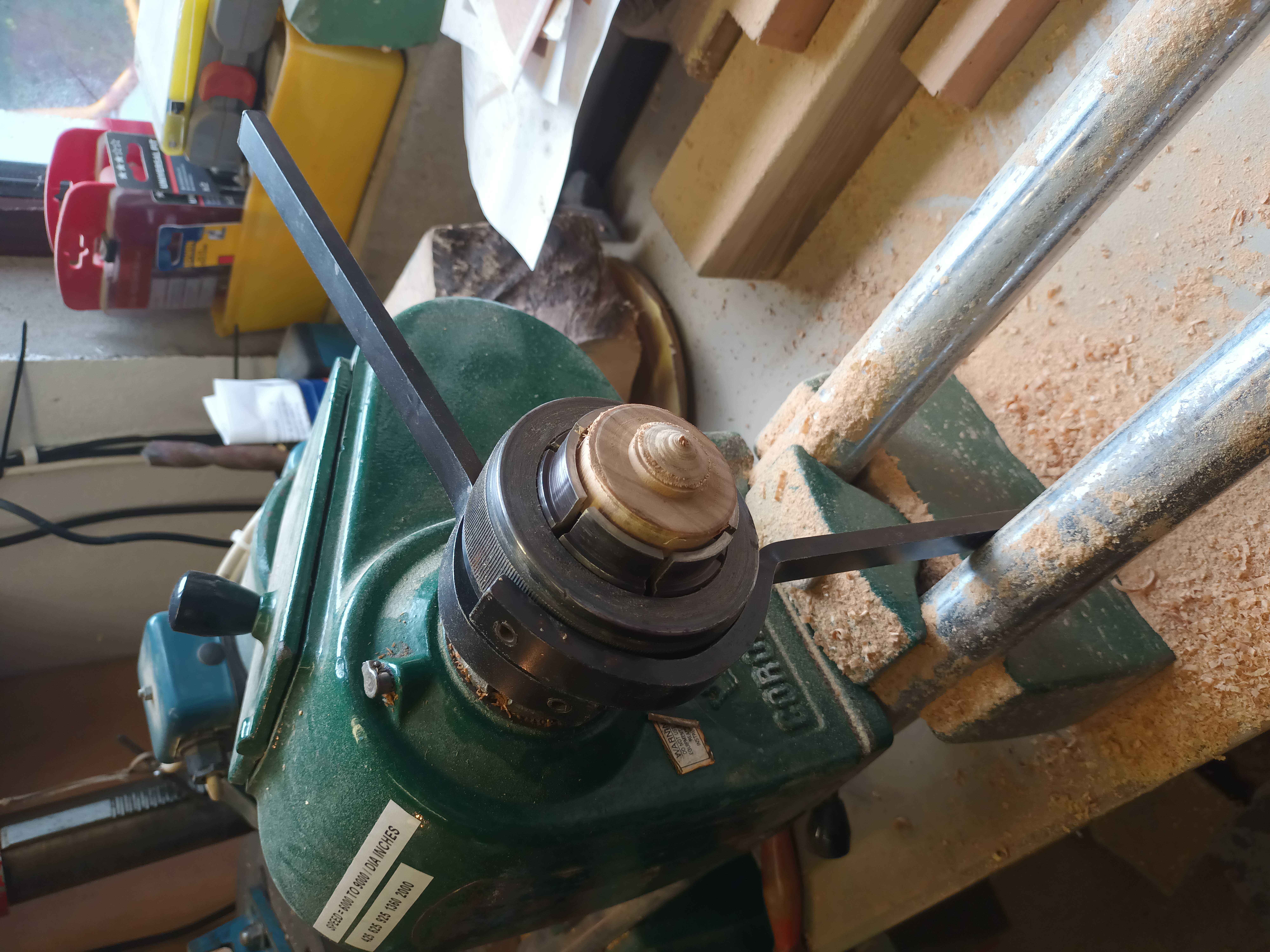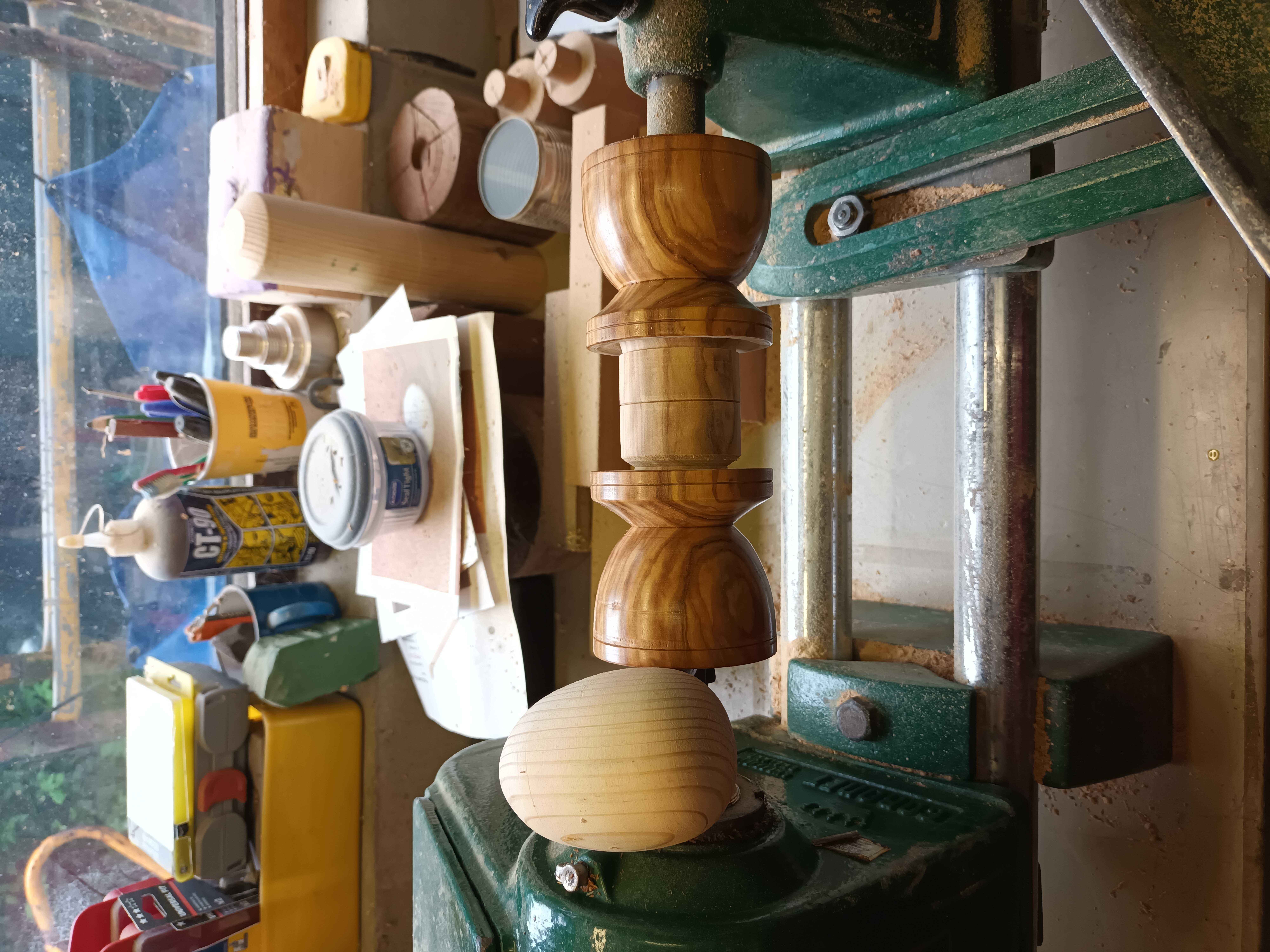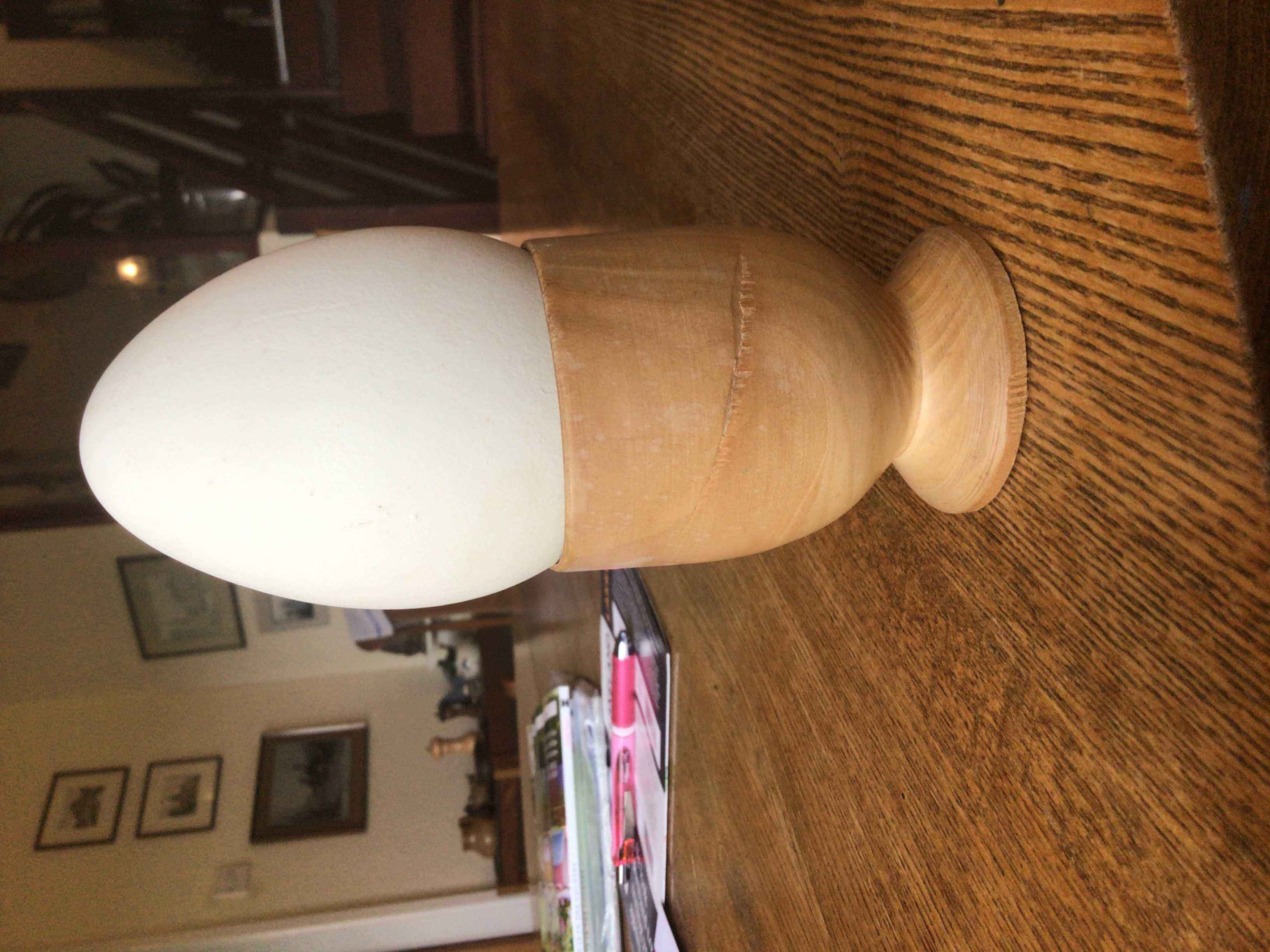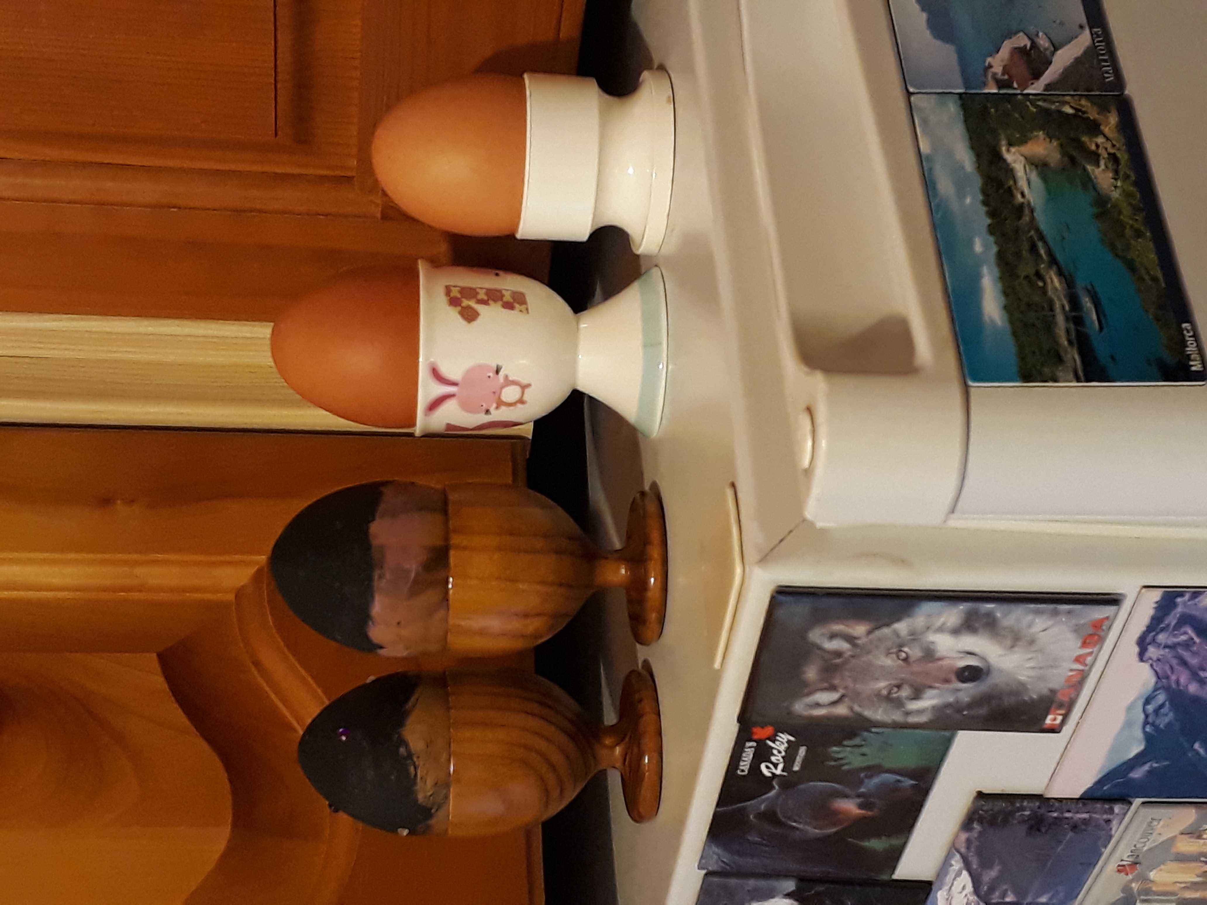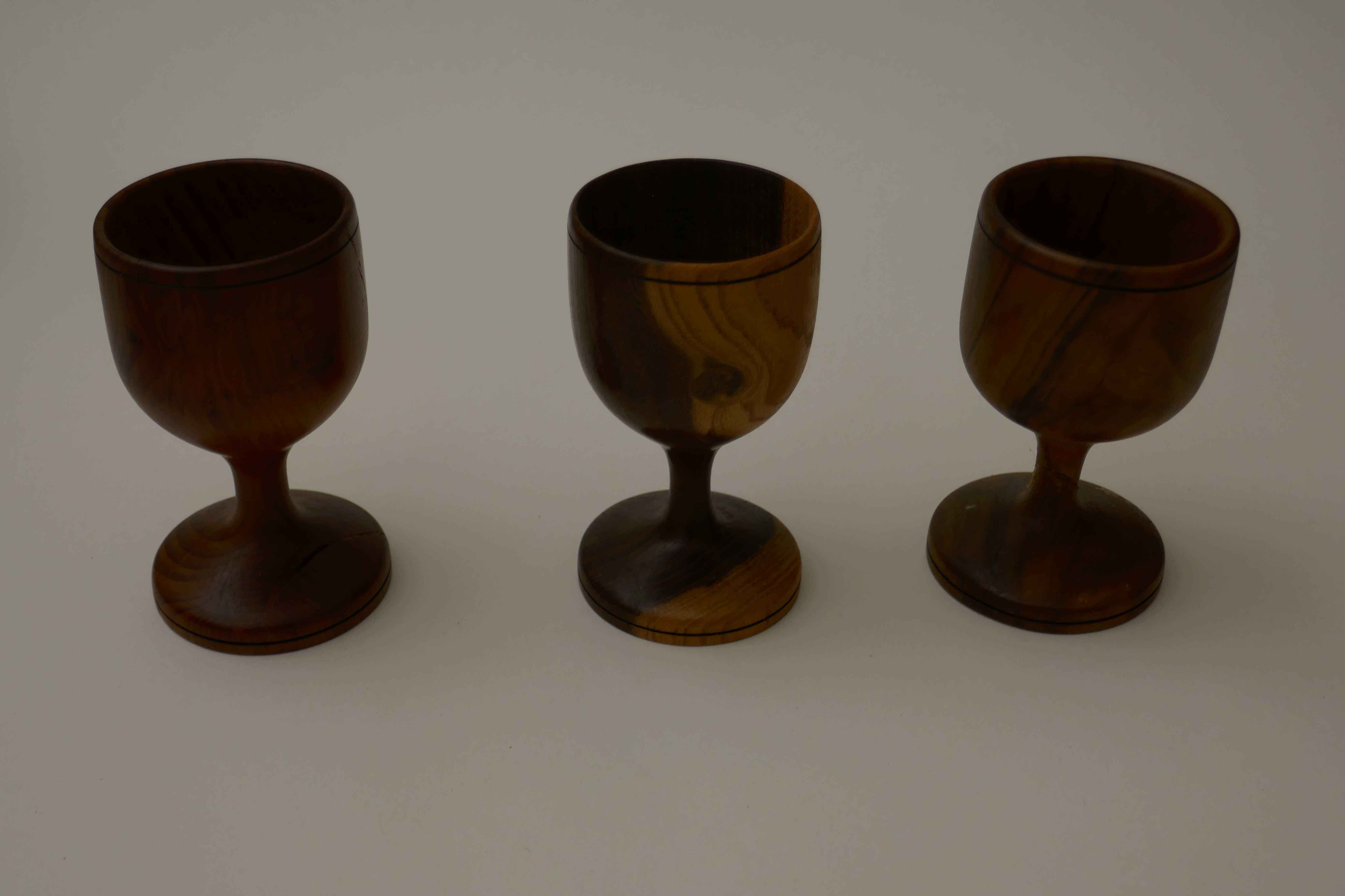 The larger cups are for a goose egg. A friend of Mum and Dad keeps geese, and occasionally drops some eggs round to them. They are about the same as three large hens' eggs. As a sort of thank you joke gift I made him some goose egg cups from a length of Spanish olive 3x3 (75 mm x 75 mm) I had inherited with the lathe in 2017. They were fun to make, and I first made a dummy goose egg so that I could test for fit when hollowing out (same technique as an end grain bowl or a small lidded box).