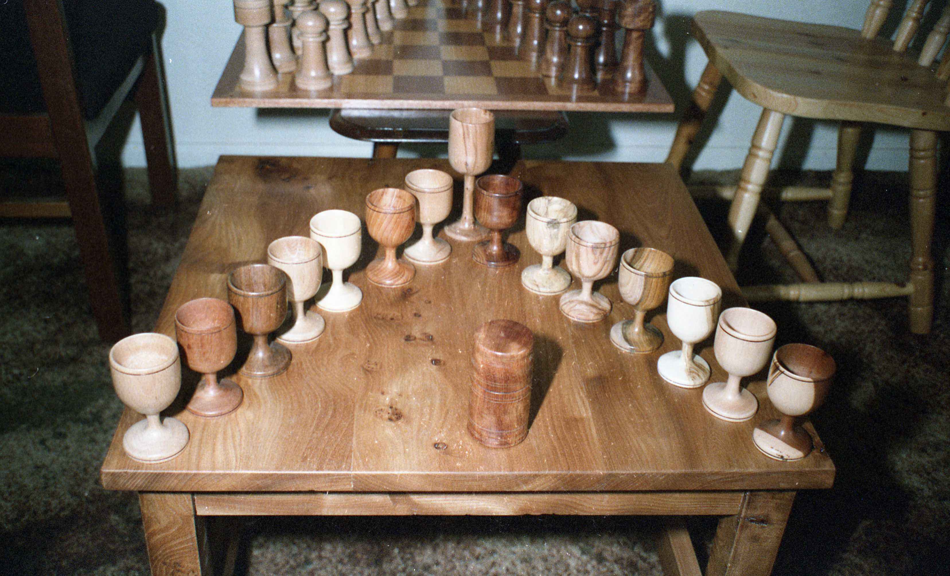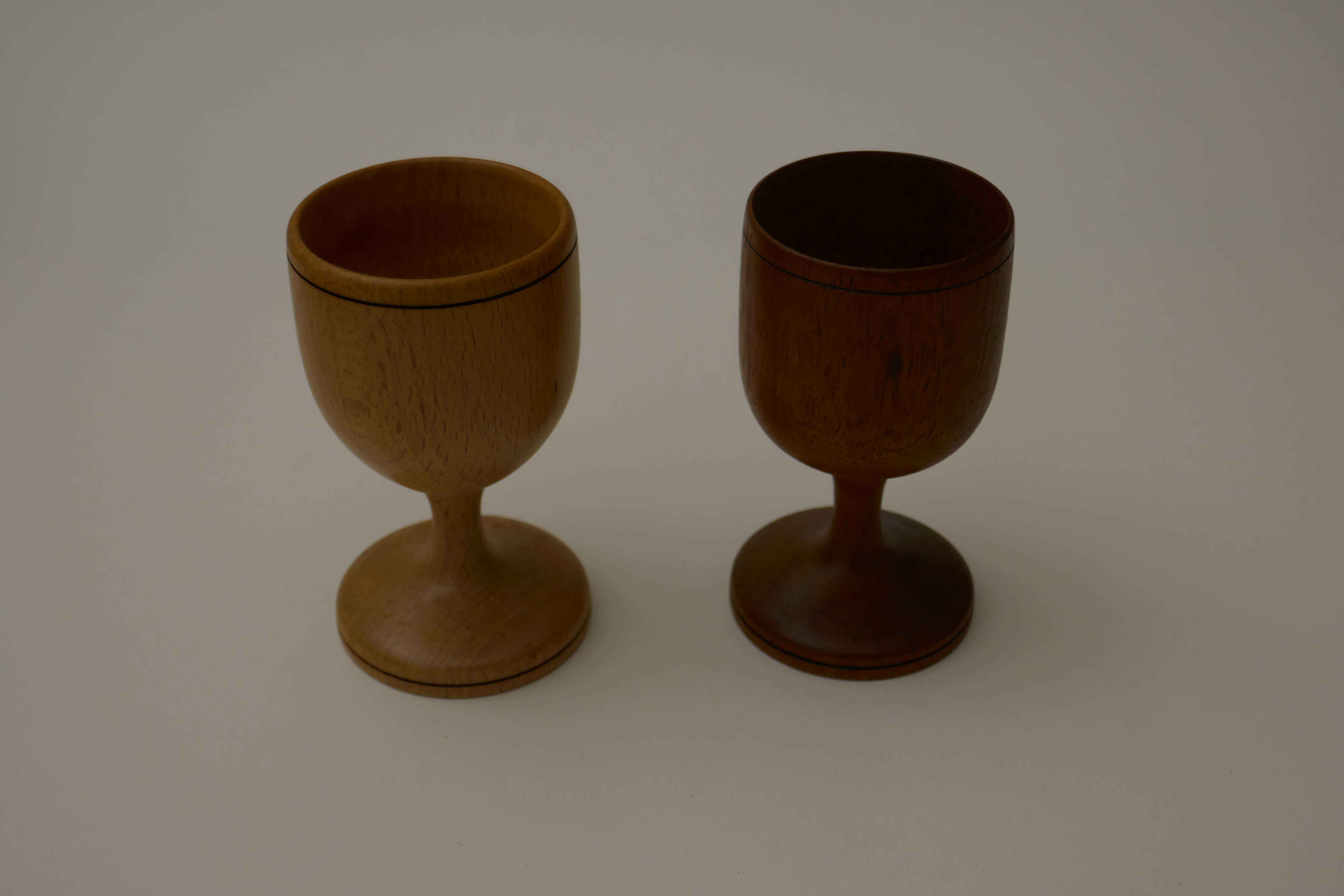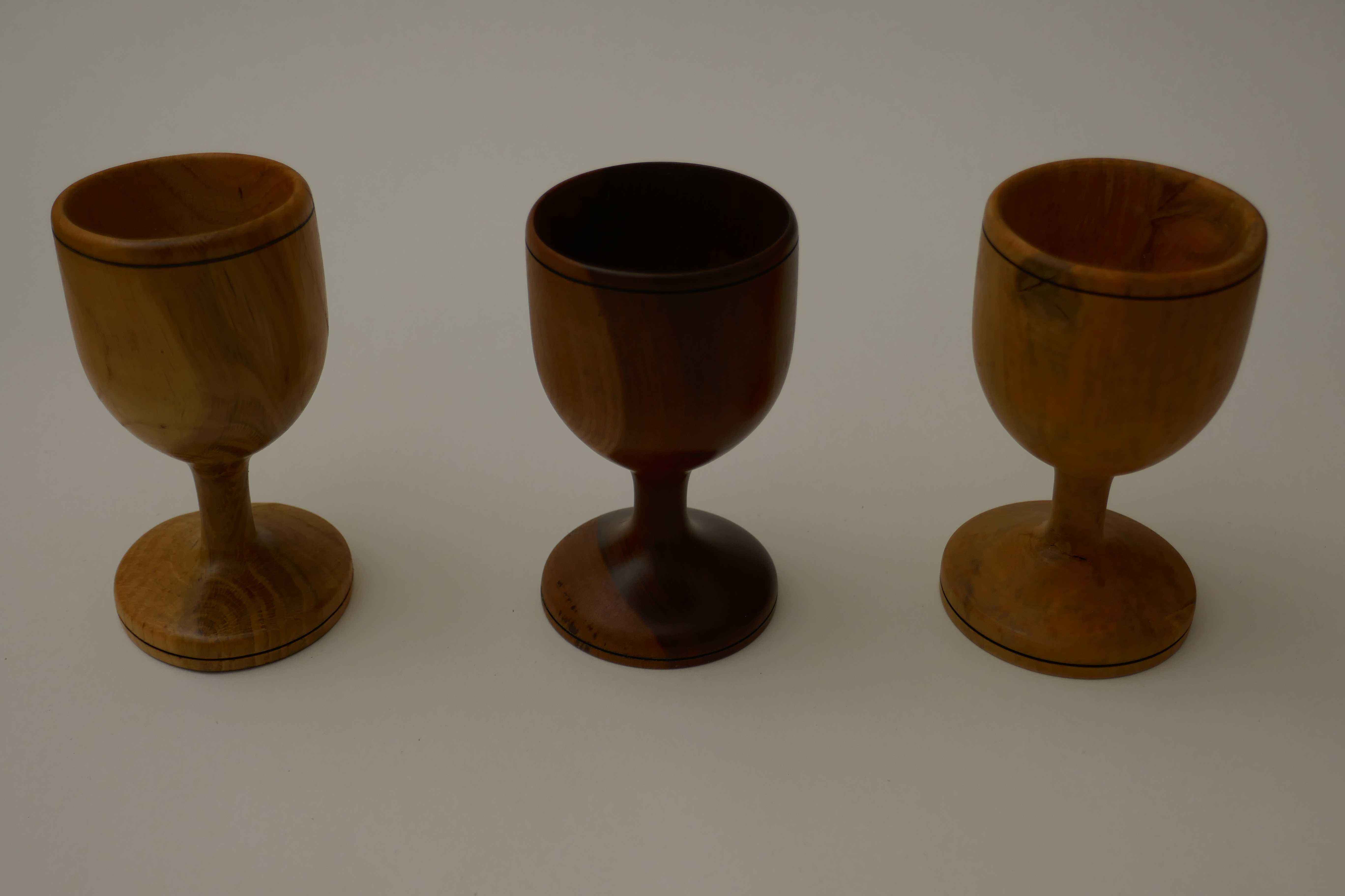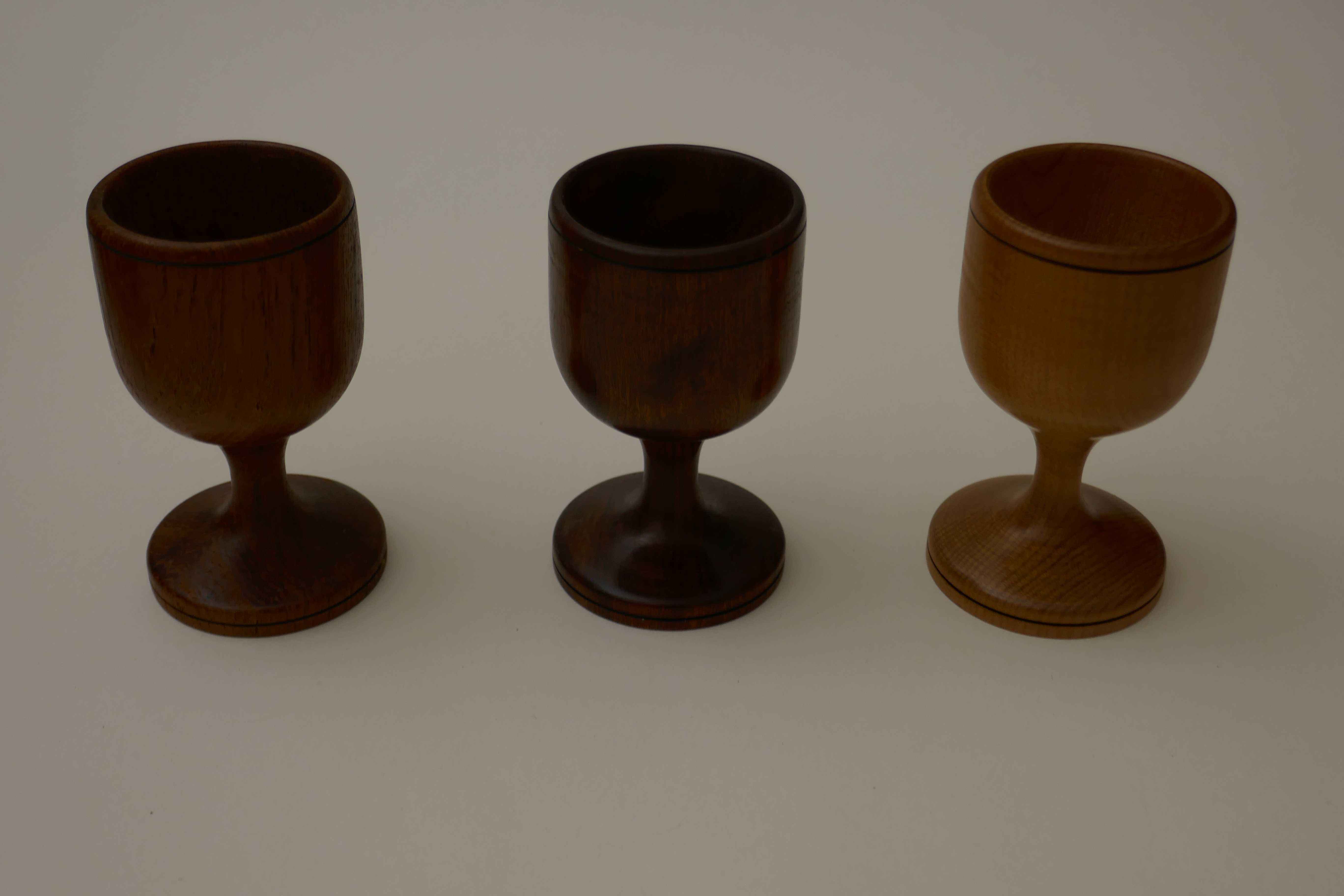 I was visiting Mum and Dad one Christmas around 1990 when the lathe was in Dad's workshop, and suggested making egg cups. I used one of Mum's sherry glasses as a model. Dad kept popping up from under the lathe bench with another little offcut in his hand, and in the end I made quite a number, each one from a different type of wood.