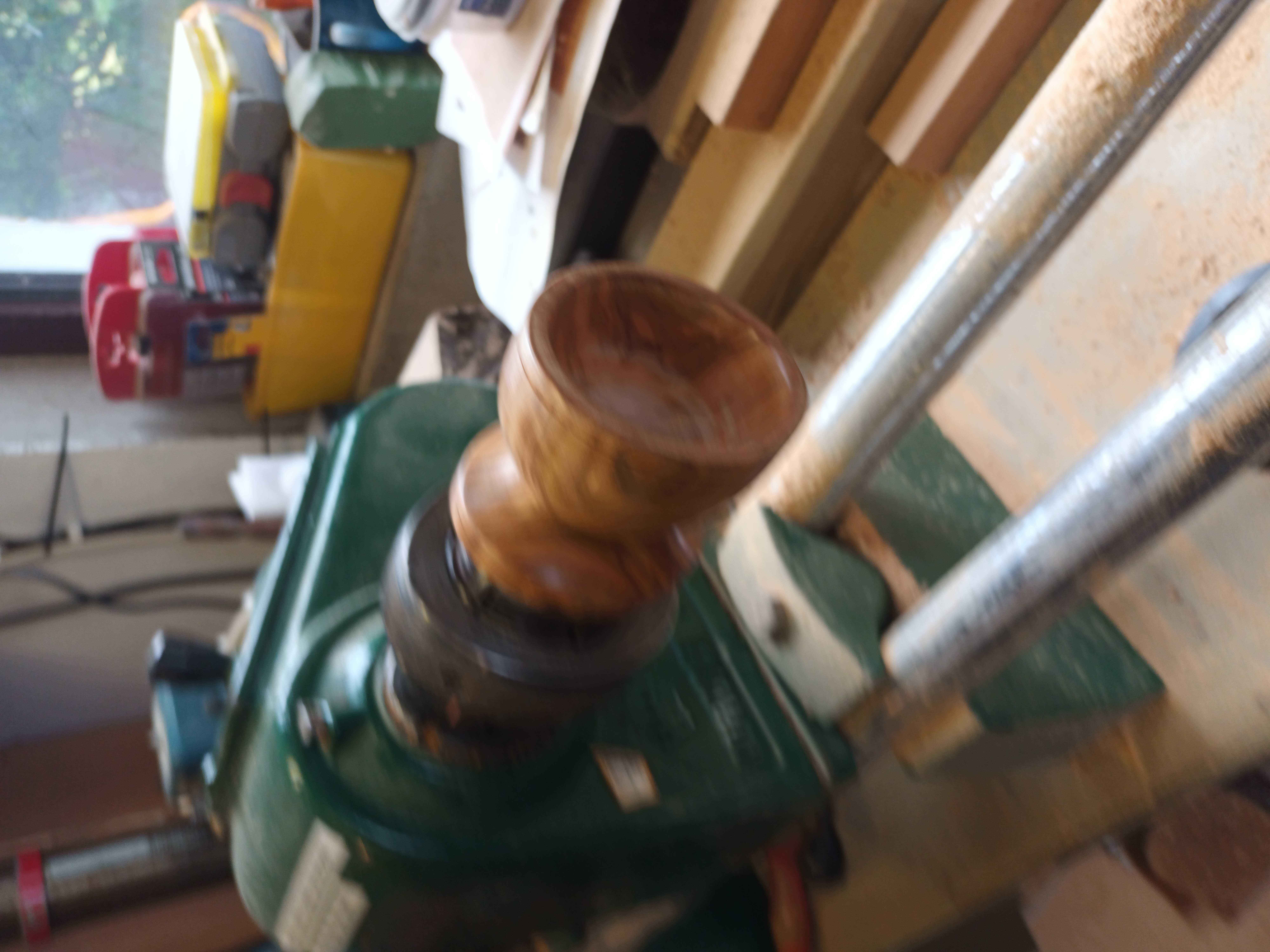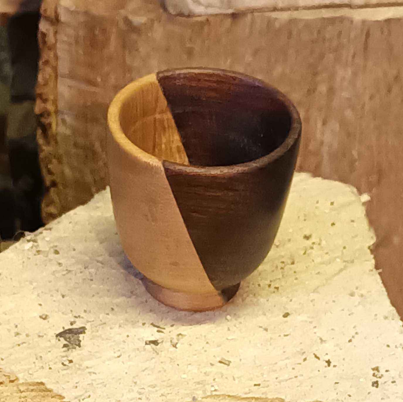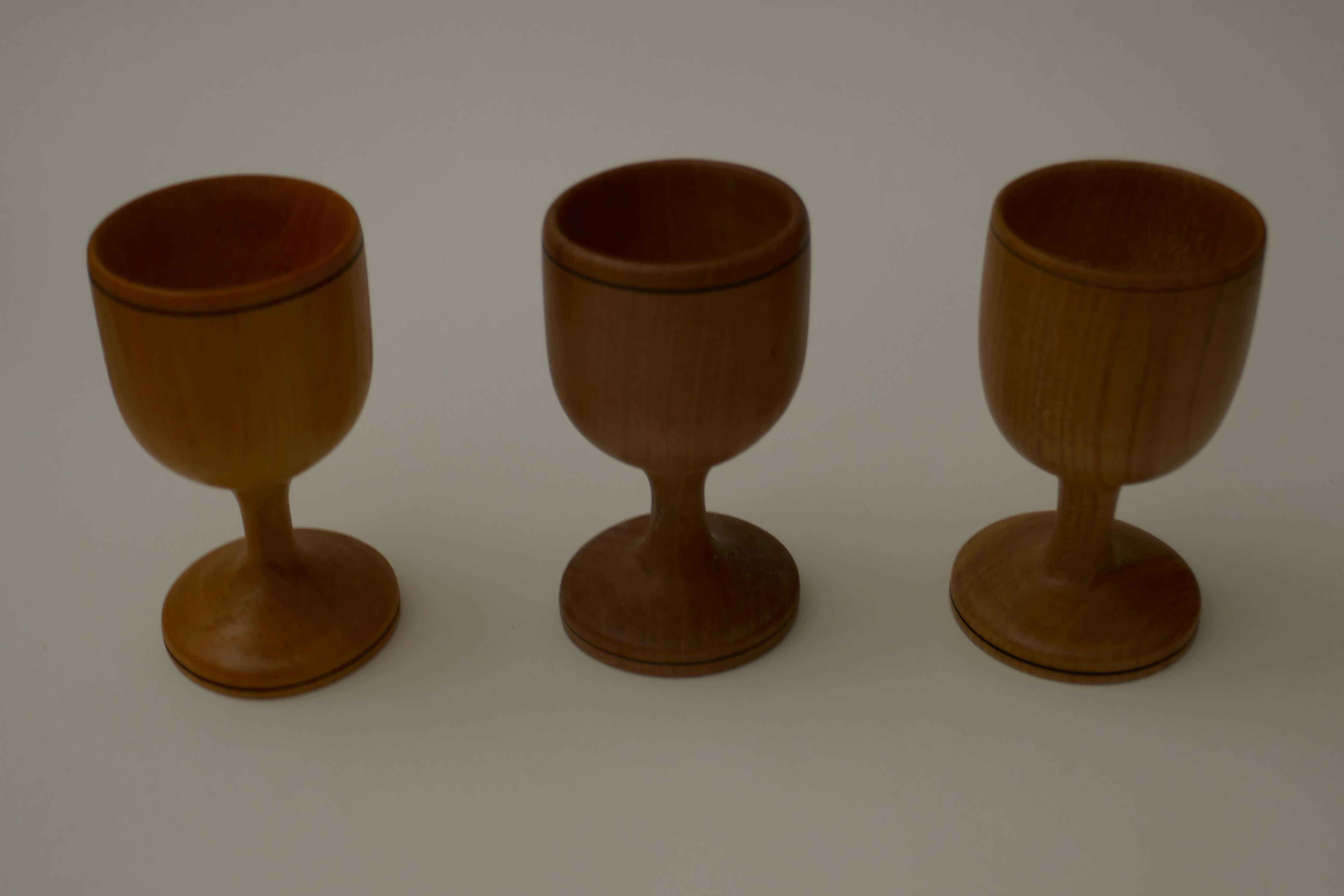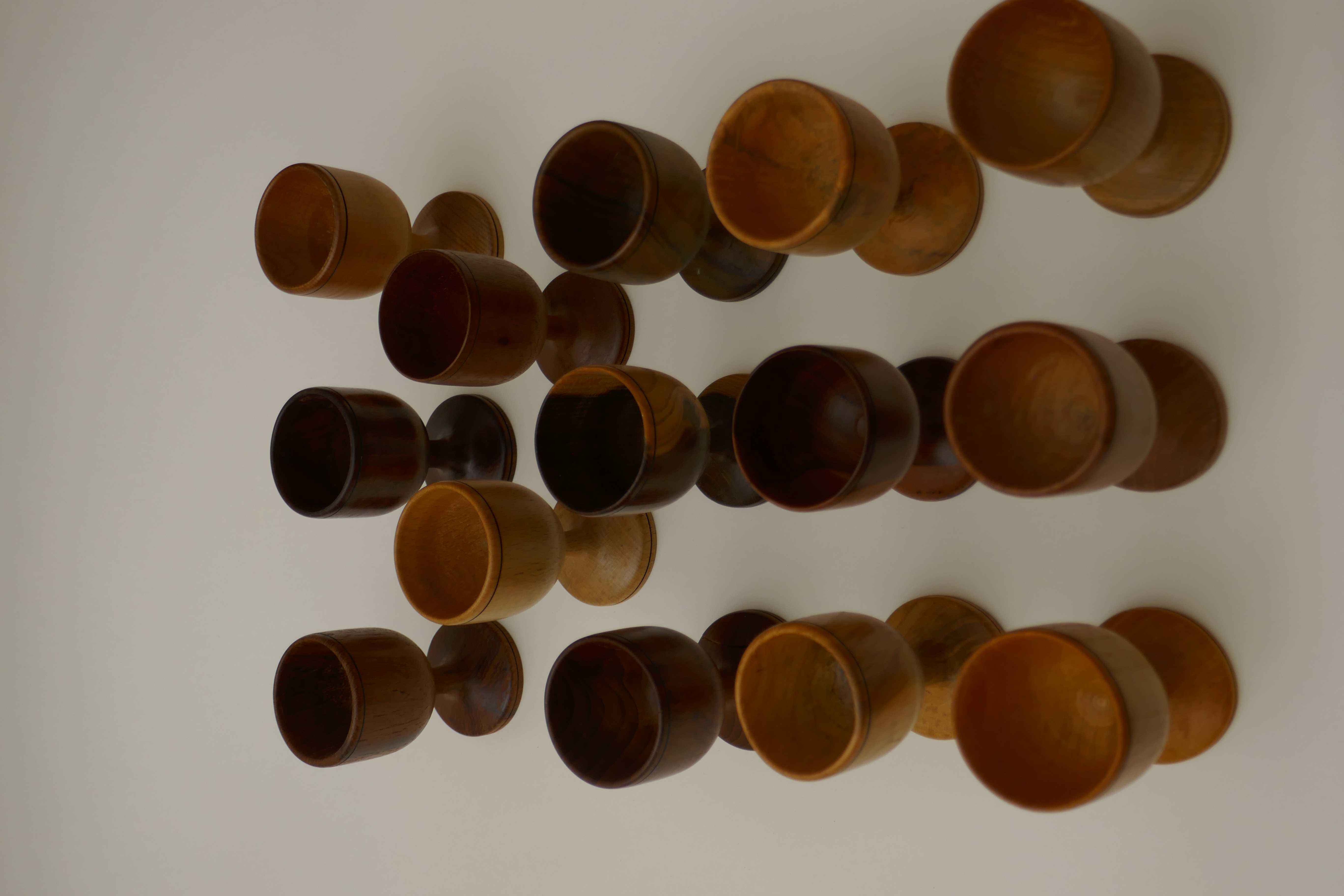 I was visiting Mum and Dad one Christmas around 1990 when the lathe was in Dad's workshop, and suggested making egg cups. I used one of Mum's sherry glasses as a model. Dad kept popping up from under the lathe bench with another little offcut in his hand, and in the end I made quite a number, each one from a different type of wood.