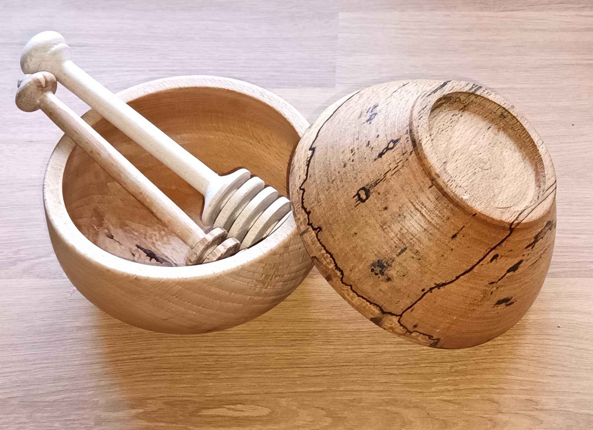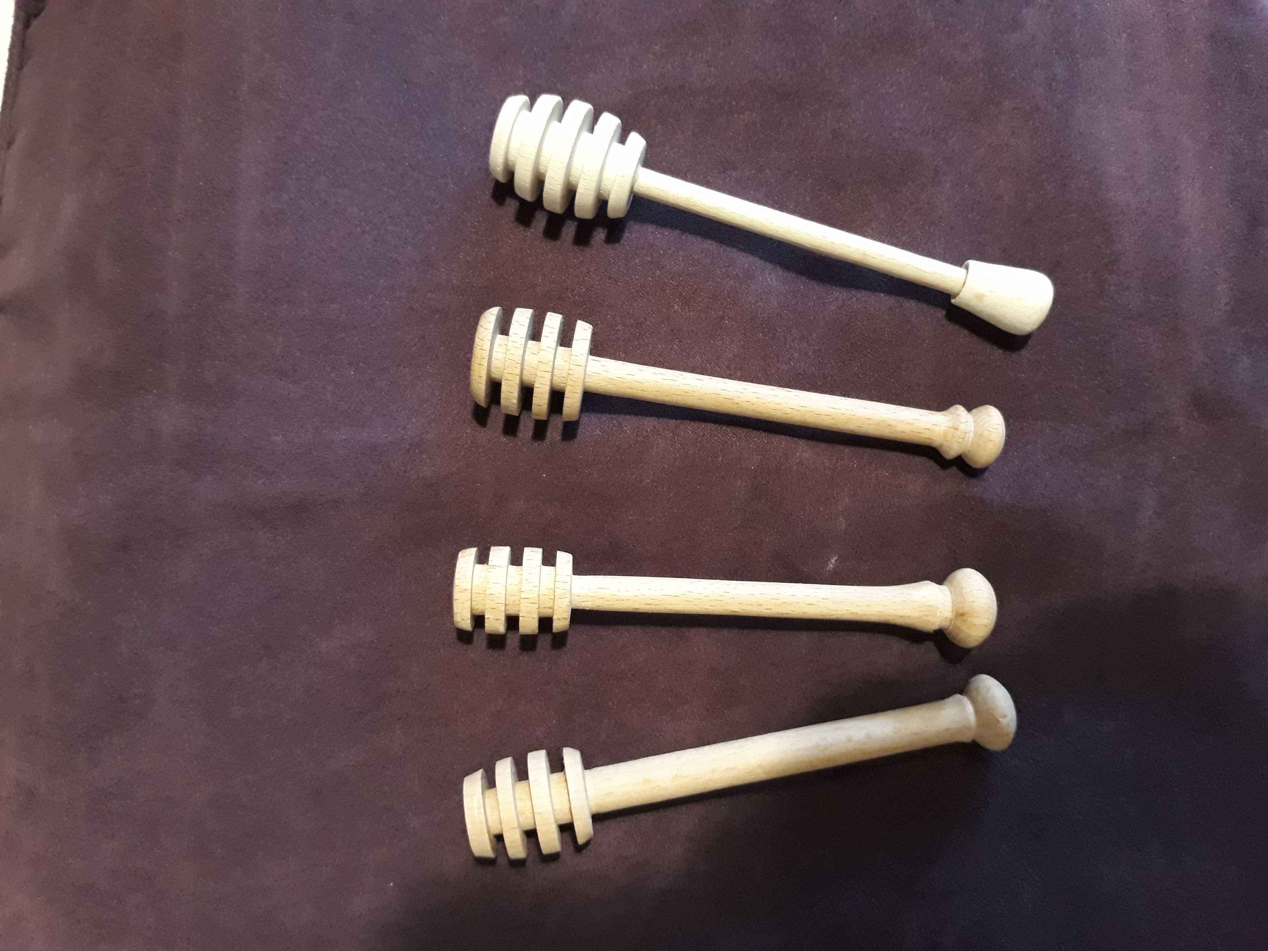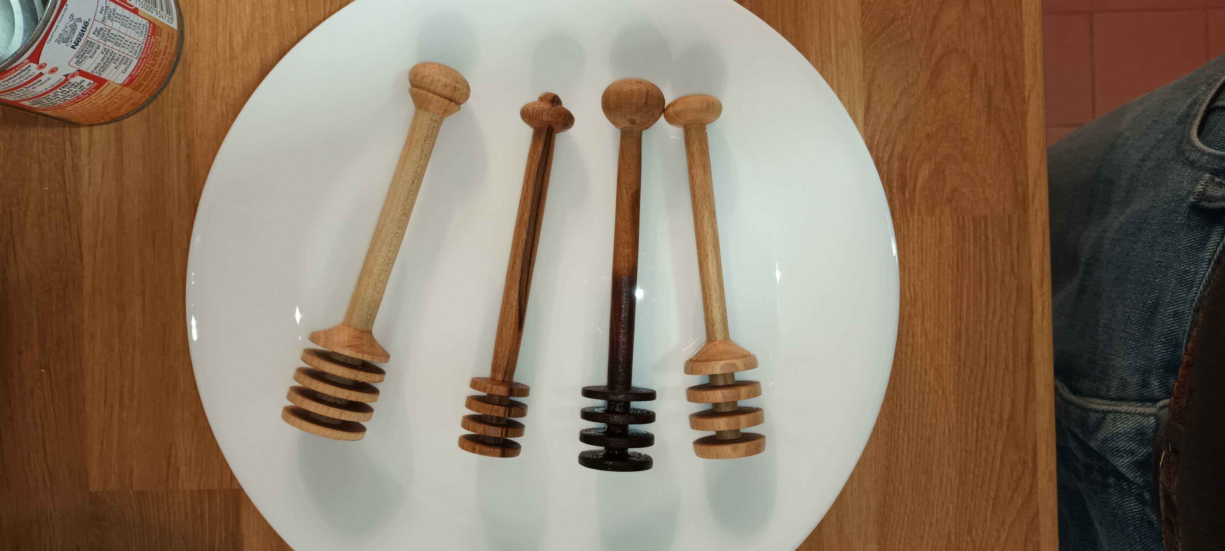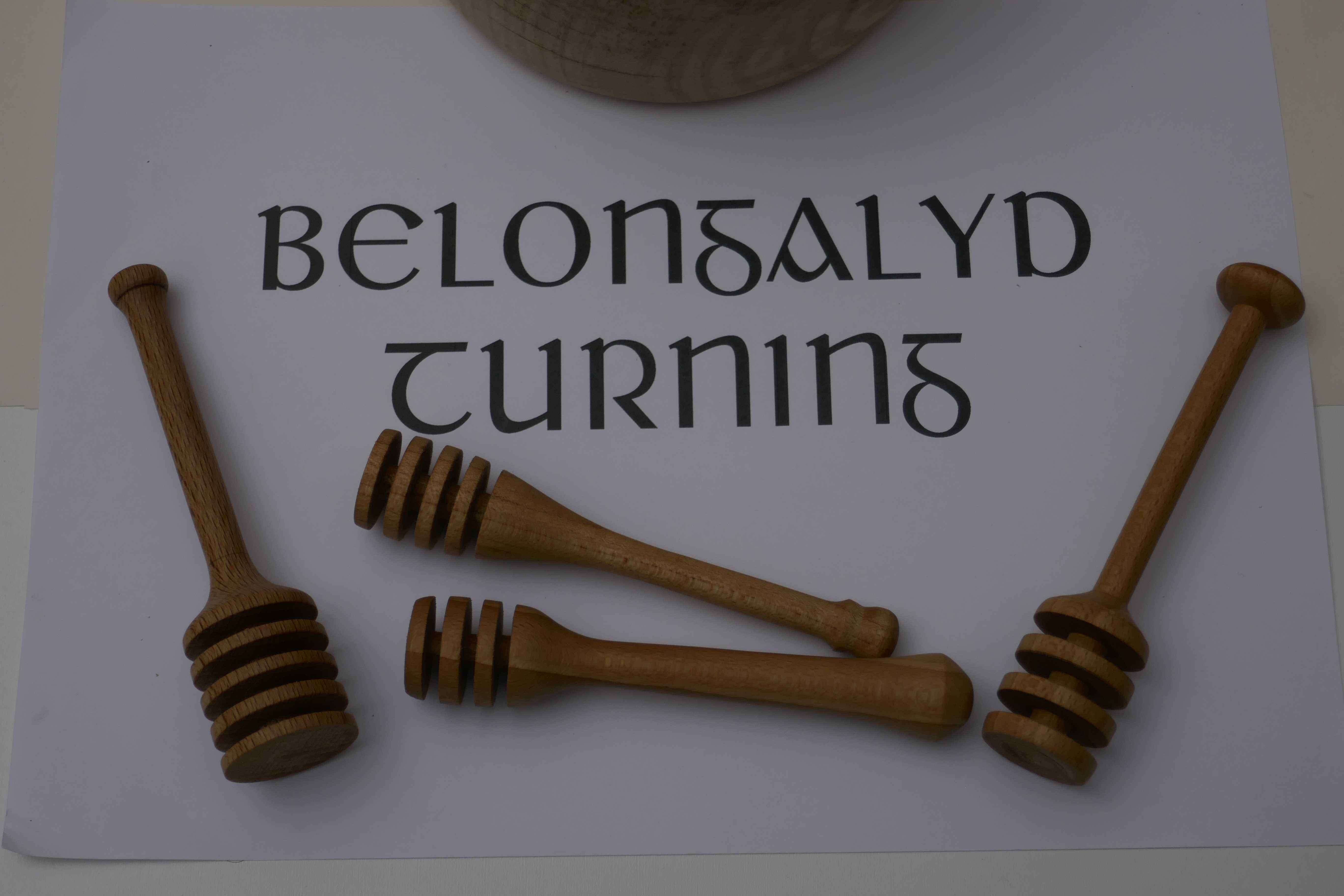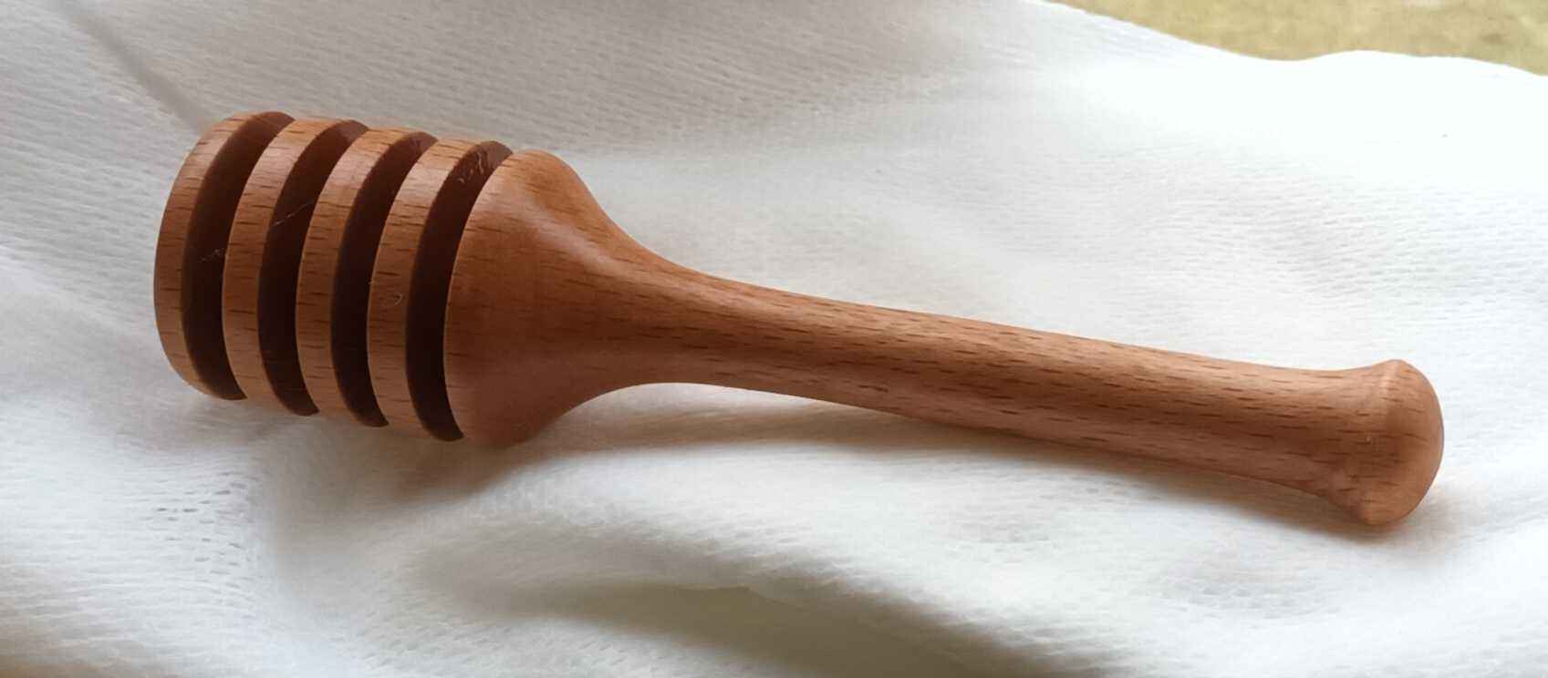 Dad gave me the lathe and the small trailer in July 2017 as his eyesight had deteriorated. My daughter was three and had just started pre-school, and I had changed to a 32 hour week with Wednesdays off, so I would drop her off, get an hour or so in the garage, pick her up, then we would go swimming. It took me a month of Wednesdays to get the lathe bench built and the lathe installed (see the Workshop area of the site) and then it pretty much sat there gathering dust. One July a couple of years later Mum said she needed a new honey dipper. I got a cheap one from Amazon to look at (pretty rubbish!) and looked at the one I have made by Dad in a honey pot made by Mum. I made a few, finding that the legs of an old stool which were 30 mm beech square stock were easiest to turn. I tried to make each one a slightly different design because who wants a hand made honey dipper which looks like everyone else's? In the YouTube short the honey came from the same friend who I made the goose egg cups for, Dave at Rykneld Apiaries, and is from Toad Hole Furnace about a mile from Mum and Dad.