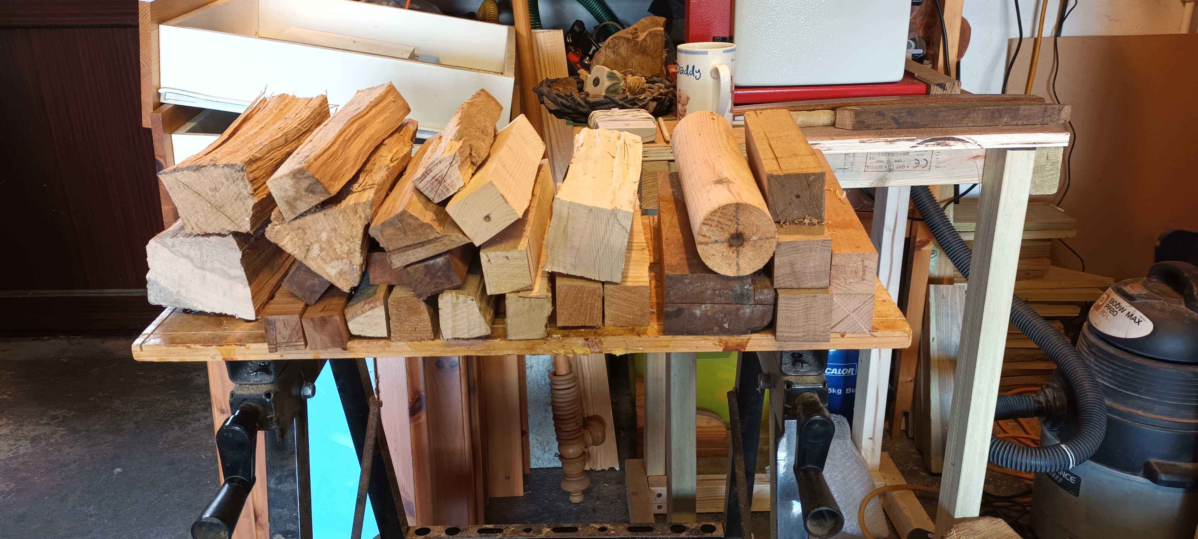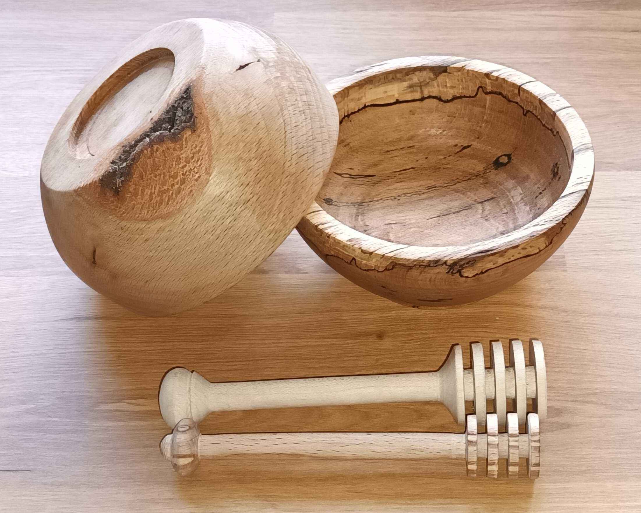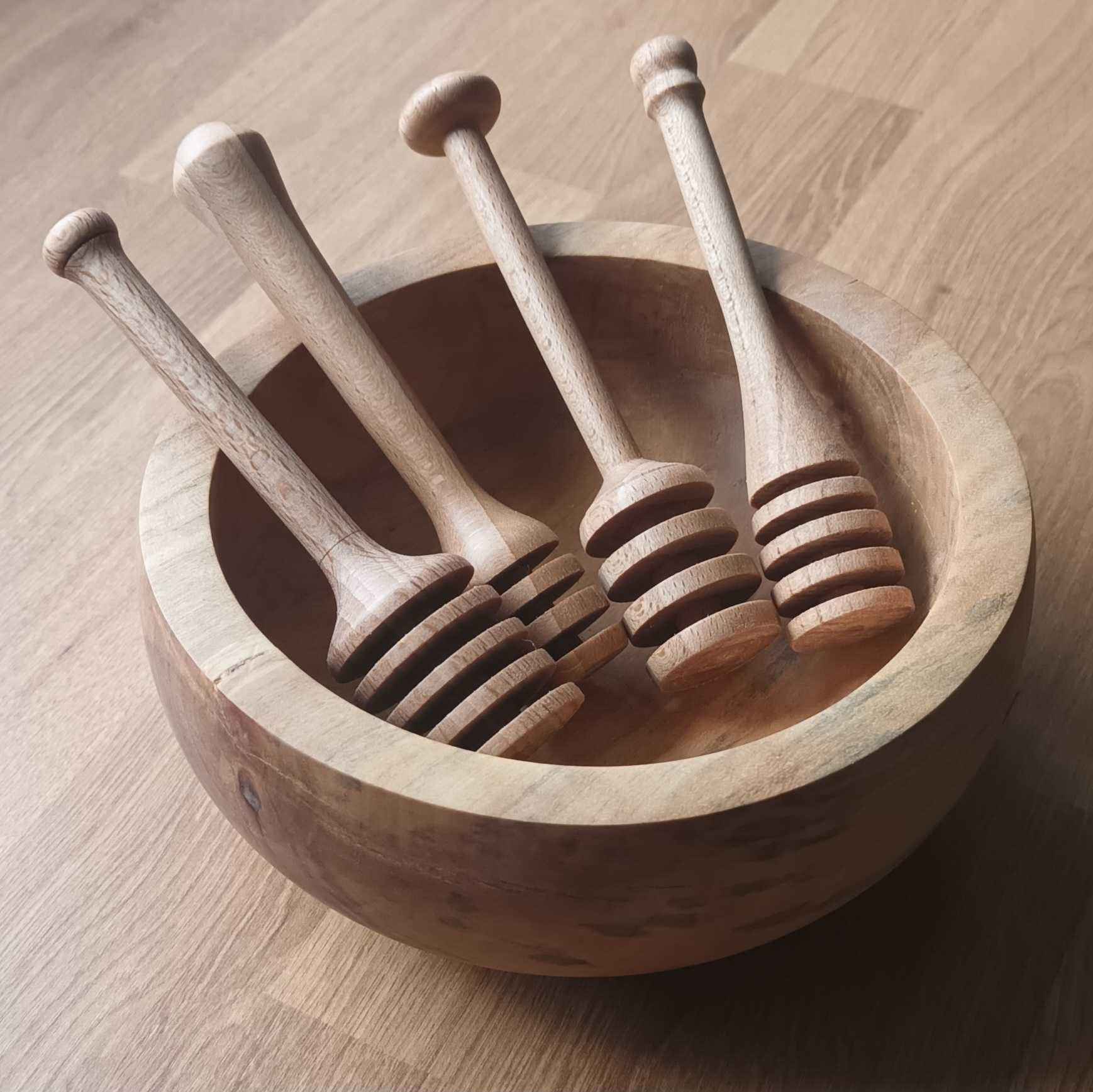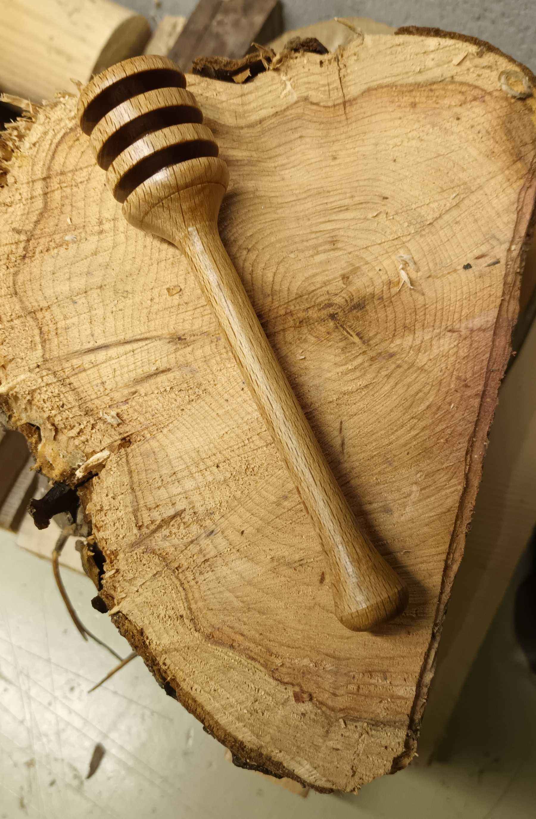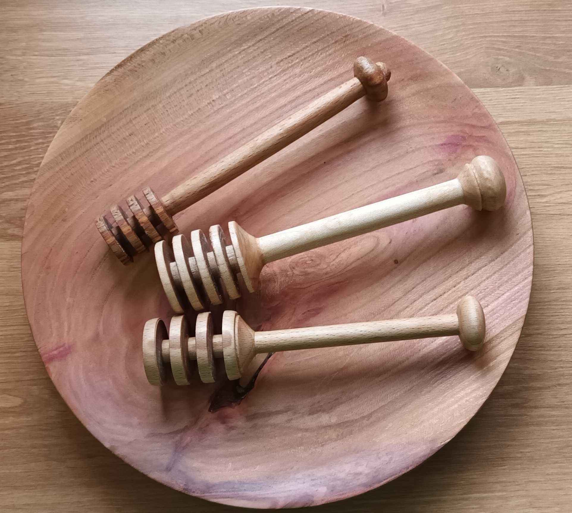 Dad gave me the lathe and the small trailer in July 2017 as his eyesight had deteriorated. My daughter was three and had just started pre-school, and I had changed to a 32 hour week with Wednesdays off, so I would drop her off, get an hour or so in the garage, pick her up, then we would go swimming. It took me a month of Wednesdays to get the lathe bench built and the lathe installed (see the Workshop area of the site) and then it pretty much sat there gathering dust. One July a couple of years later Mum said she needed a new honey dipper. I got a cheap one from Amazon to look at (pretty rubbish!) and looked at the one I have made by Dad in a honey pot made by Mum. I made a few, finding that the legs of an old stool which were 30 mm beech square stock were easiest to turn. I tried to make each one a slightly different design because who wants a hand made honey dipper which looks like everyone else's? In the YouTube short the honey came from the same friend who I made the goose egg cups for, Dave at Rykneld Apiaries, and is from Toad Hole Furnace about a mile from Mum and Dad.