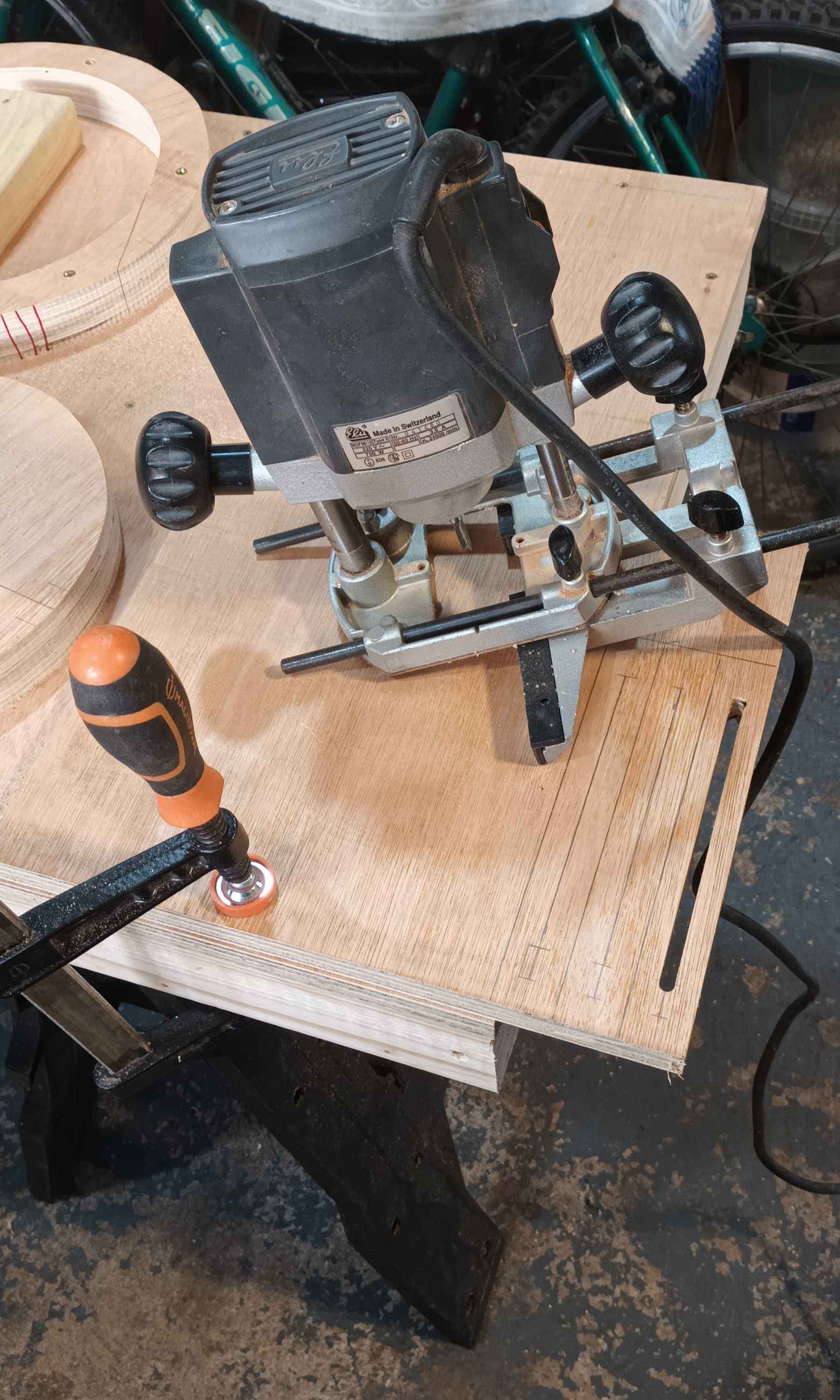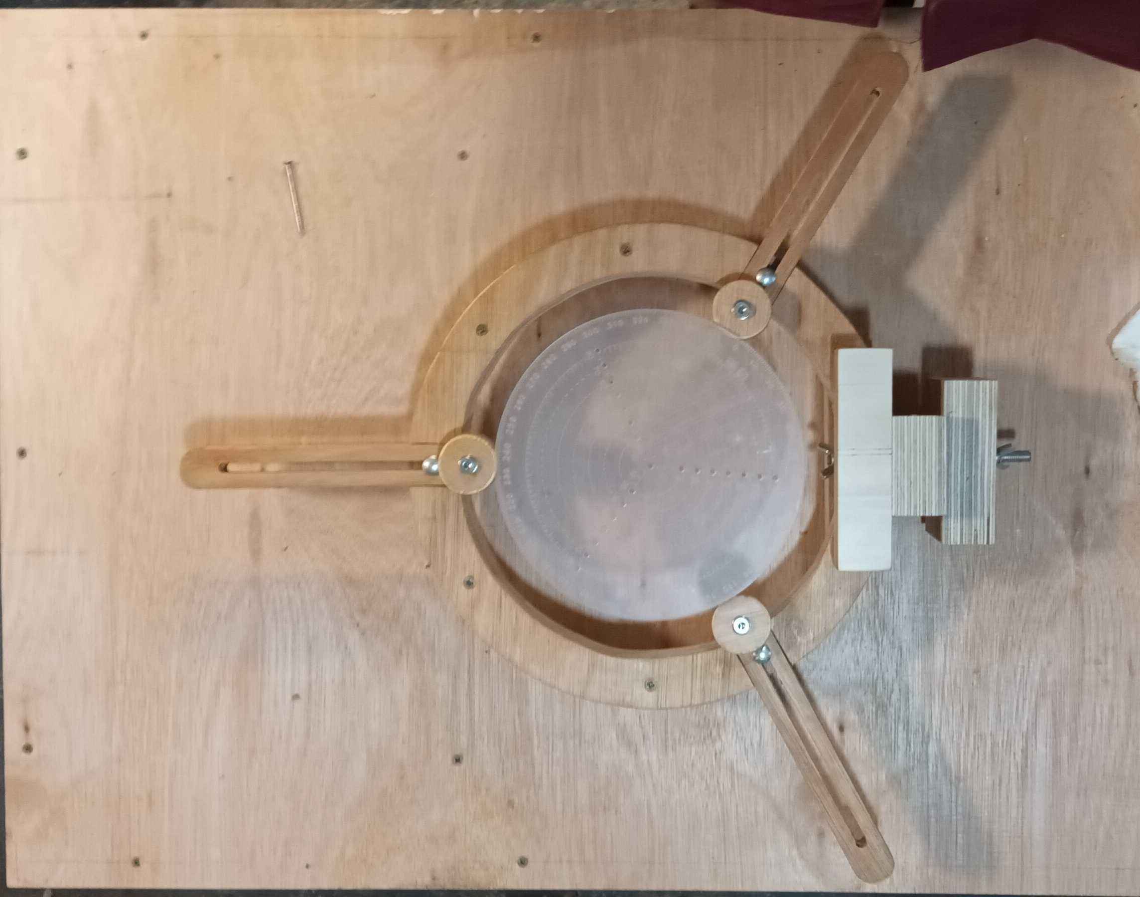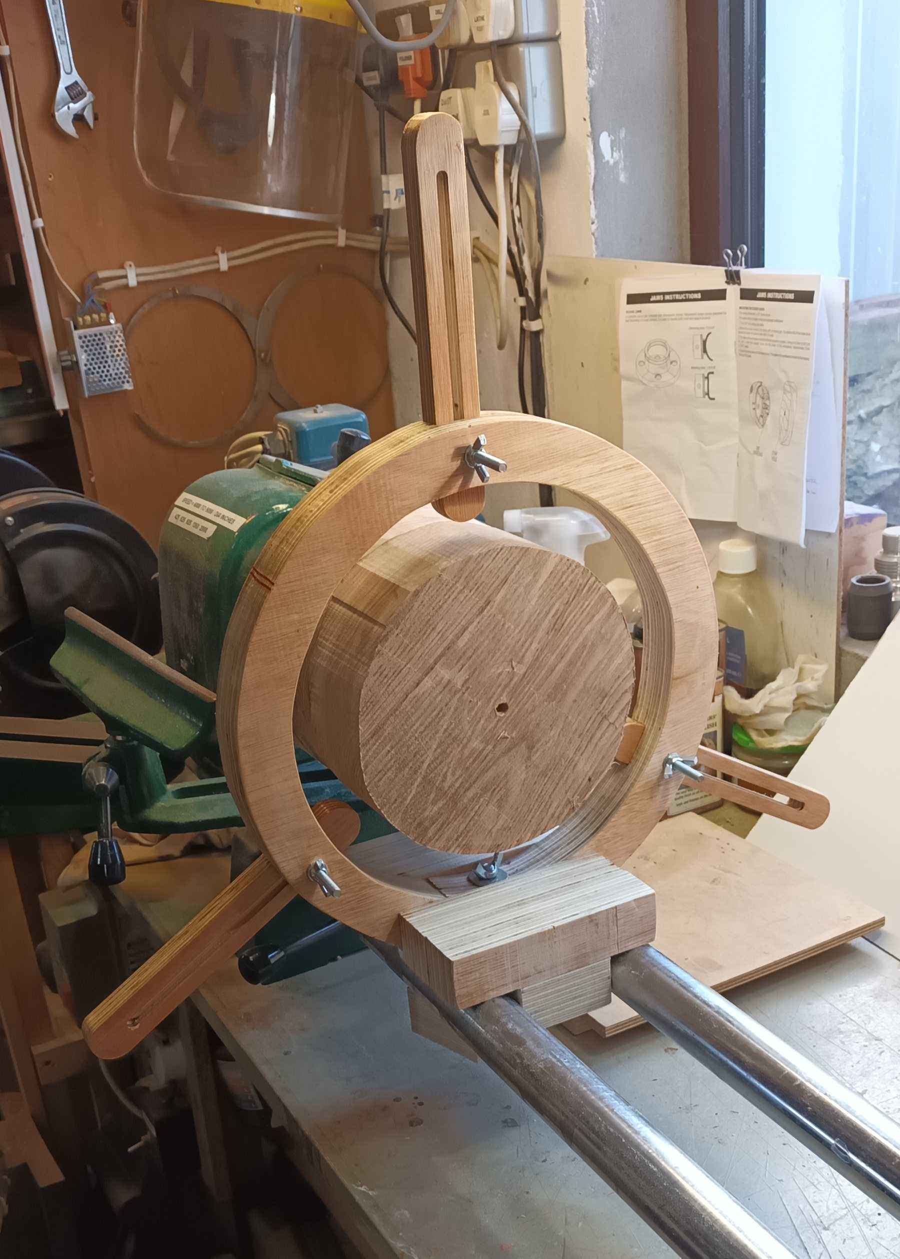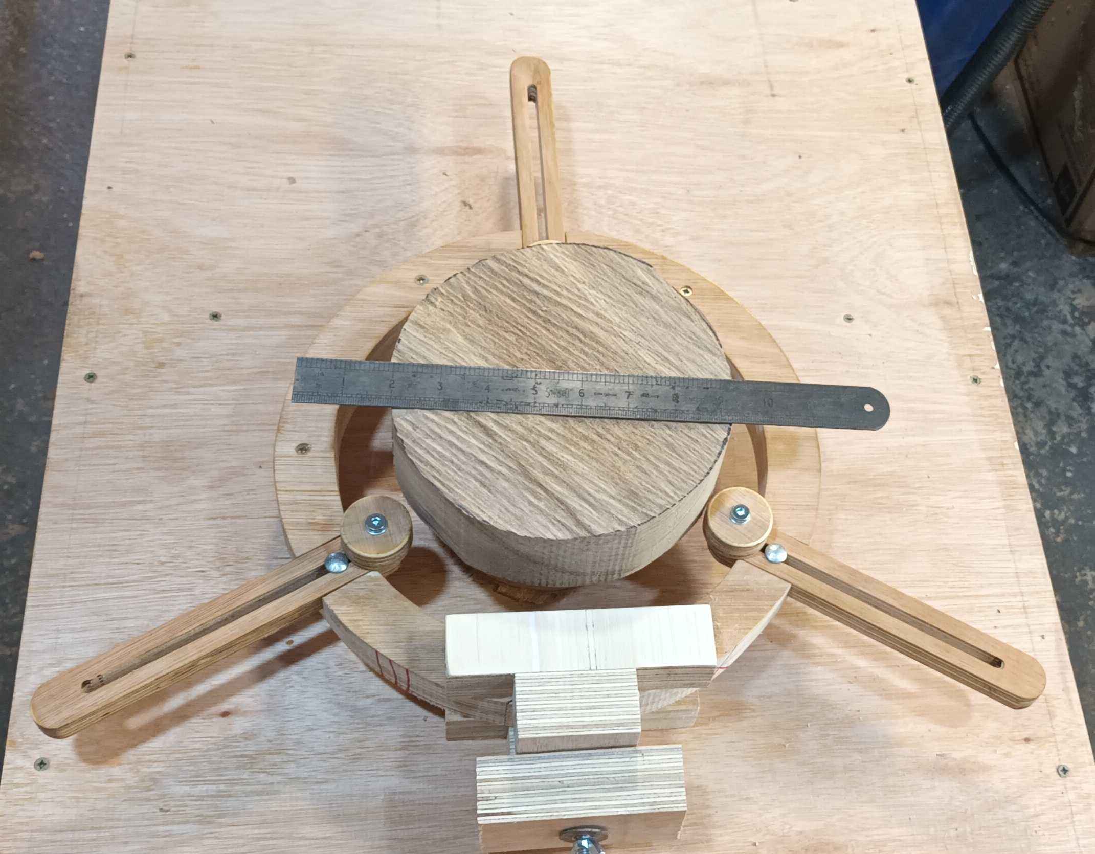 Shout out to Mike Waldt for his useful video). I made small 1.5" wheels using a holesaw from offcuts from the roughly quarter board of 19 mm ply from B&Q. B&Q sawed me two pieces across the width of a half board each 320 mm long, I cut the boards square at 320 mm on the bandsaw, screwed them together, and marked a 12.5" (317 mm) circle and a 11" (279 mm) circle and bandsawed that out, then routed and cut the steady arms from the piece which was left after cutting the circle. My trestle bench came in handy as I don't have space for a proper bench in the workshop, and the old workmate is getting a bit wobbly. The offcuts from the centre of the circle were used to make the base. The Coronet No. 3 has 4.5" between the lathe bed bars. A quick search through the nuts and bolts box, some M5 and M8 wing nuts from B&Q, and a length of M8 threaded rod I had lying about and we were nearly done. I ordered a second hand pair of kids' roller blades off eBay, but when they turned up it was clear the wheels would be too big for the 7.5" (190 mm) diameter urn I was turning, so I cut some wheels using a 1.75" hole saw and cleaned then up on the lathe to give me 1.5" (38 mm) wheels, the holesaw pilot drill luckily suiting the M5 bolts. The wheels just have an extra washer between them and the steady arm, and a nylock nut, there's no bearing. On a hollow urn with wooden wheels it rumbles like a good 'un but it works!